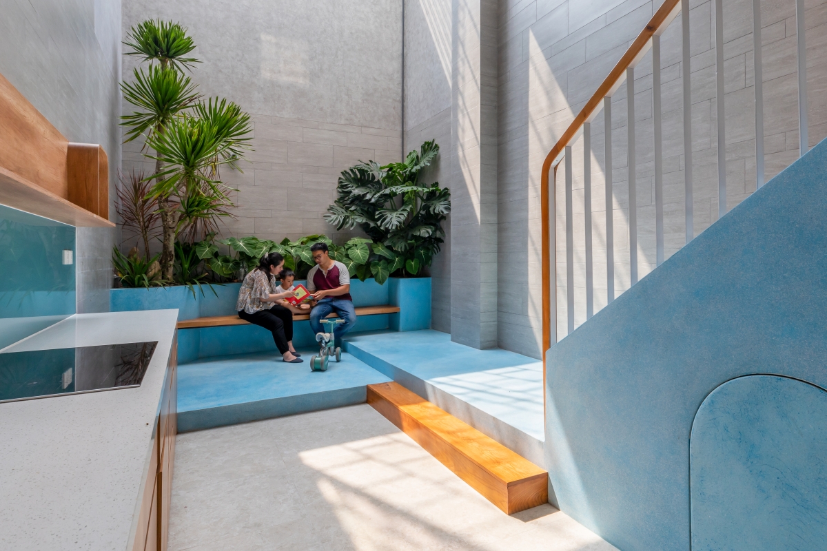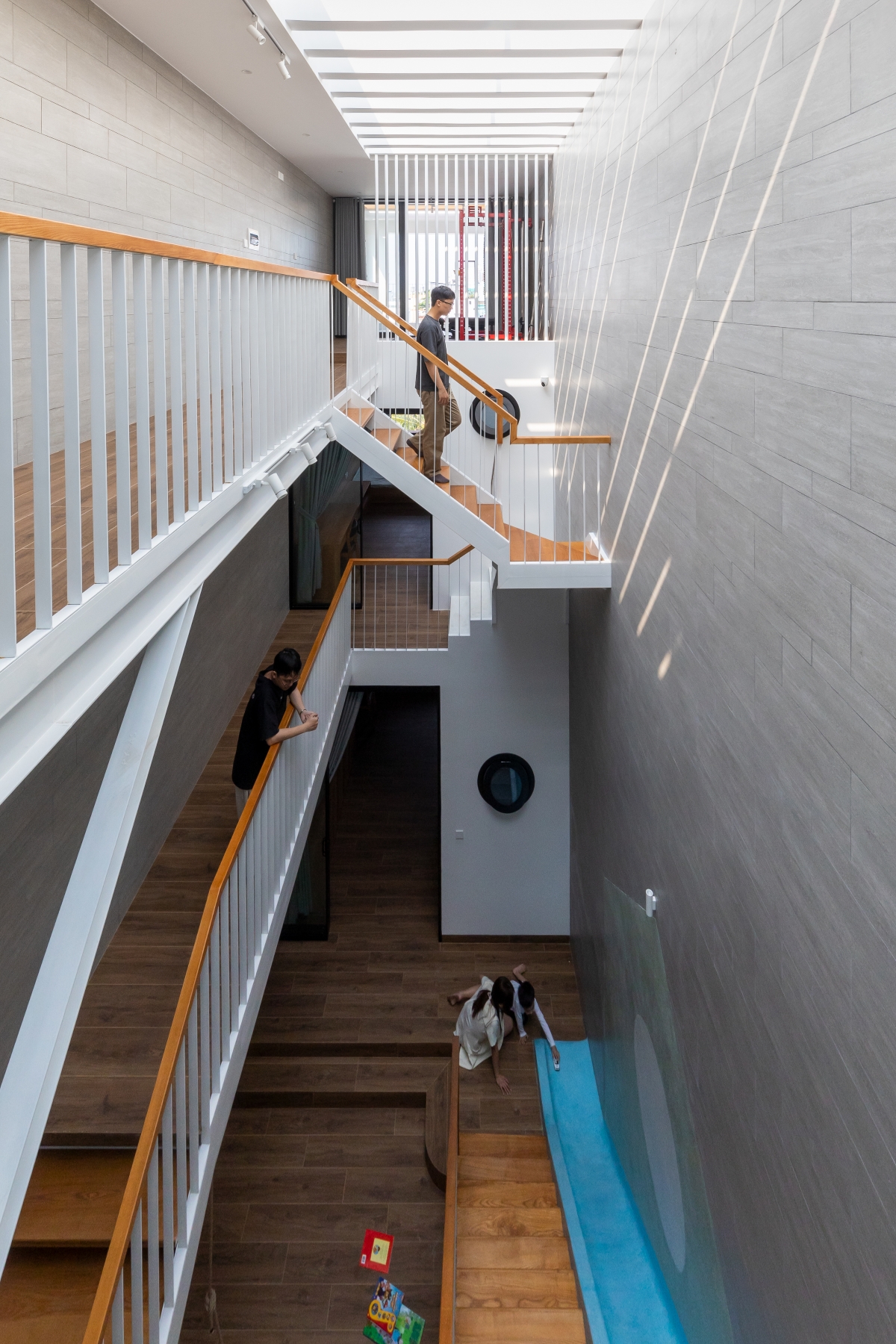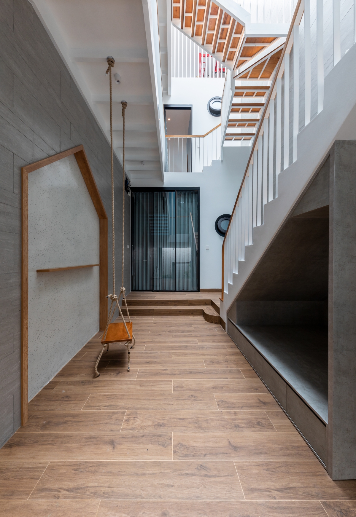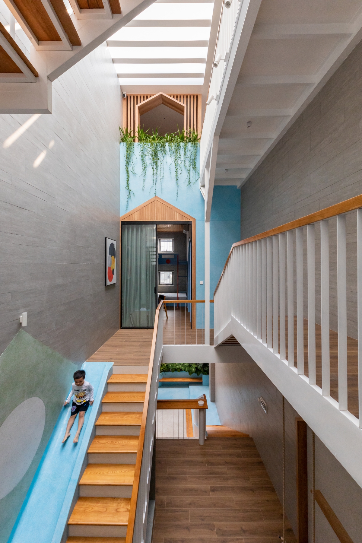 Ngôi nhà 4x22m được thiết kế nhằm giúp cha mẹ dễ dàng trông con nhỏ trong khi làm việc nhà. Các khoảng thông tầng giữa và sau nhà không chỉ đưa ánh sáng tự nhiên vào tối đa mà còn giúp kết nối trực quan giữa các tầng, cho phép phụ huynh quan sát con dễ dàng. Sàn lệch giúp rút ngắn cầu thang và tích hợp thêm máng trượt, tạo không gian vui chơi an toàn ngay trong nhà.