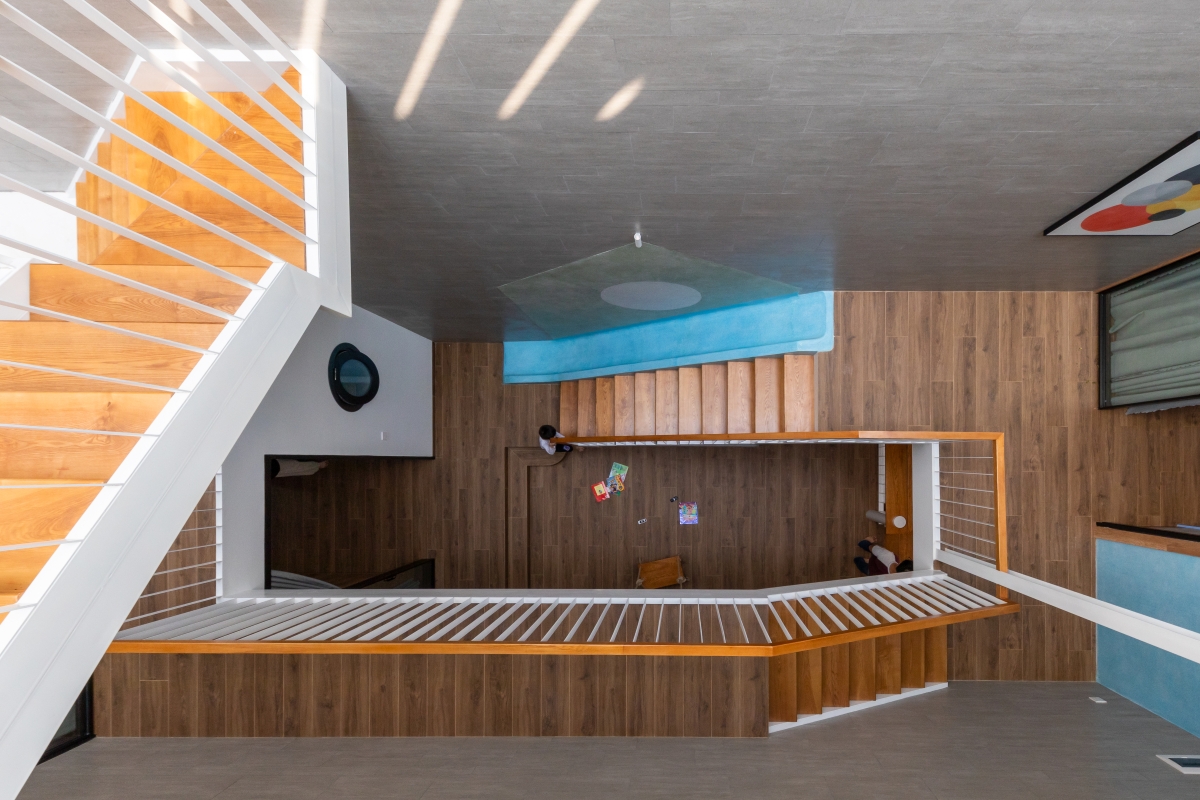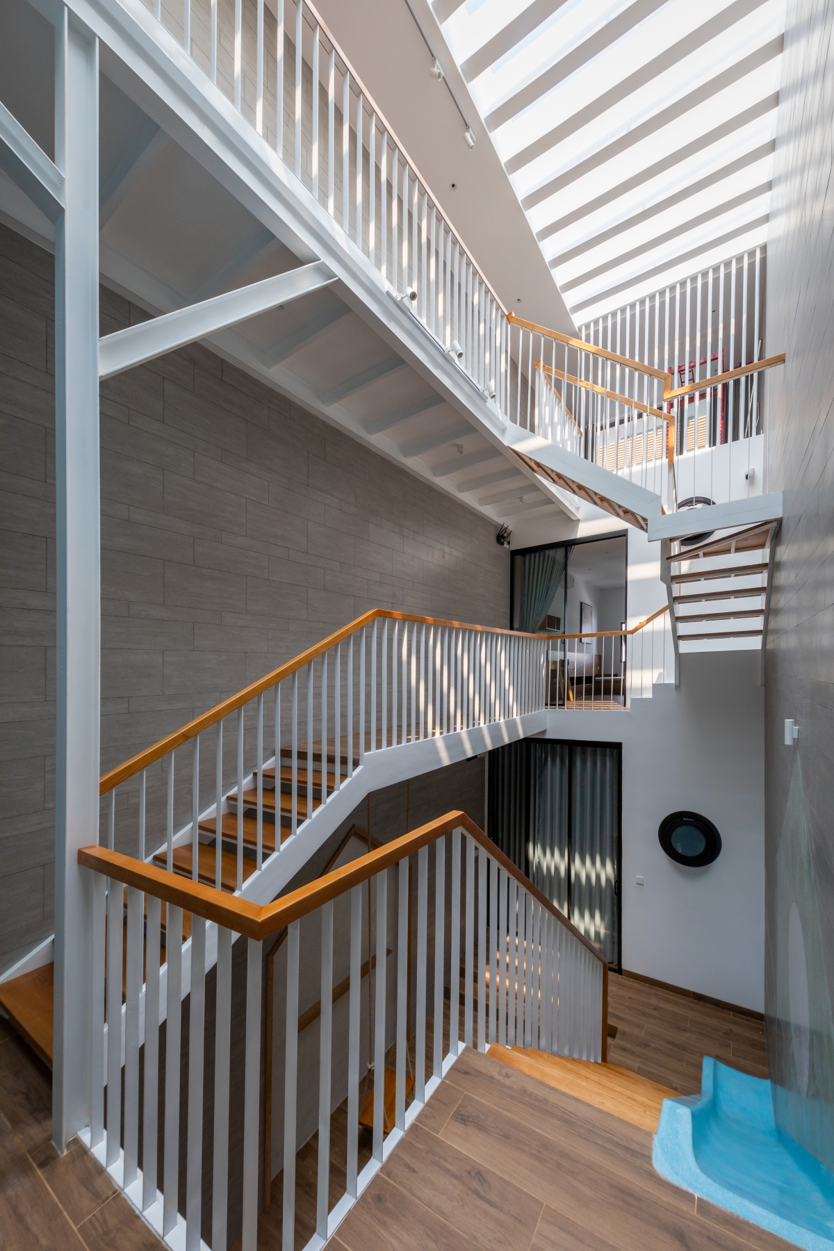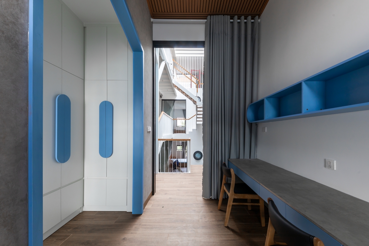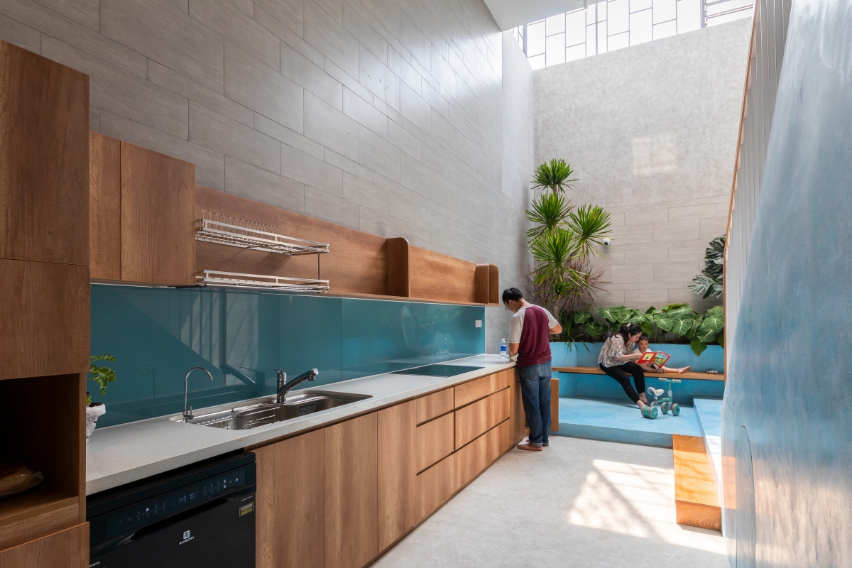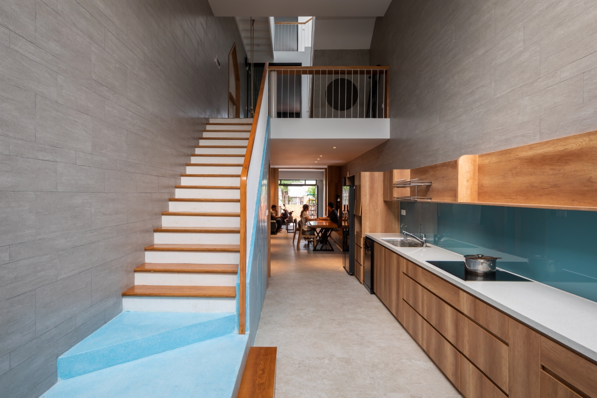 Ngôi nhà 4x22m được thiết kế nhằm giúp cha mẹ dễ dàng trông con nhỏ trong khi làm việc nhà. Các khoảng thông tầng giữa và sau nhà không chỉ đưa ánh sáng tự nhiên vào tối đa mà còn giúp kết nối trực quan giữa các tầng, cho phép phụ huynh quan sát con dễ dàng. Sàn lệch giúp rút ngắn cầu thang và tích hợp thêm máng trượt, tạo không gian vui chơi an toàn ngay trong nhà.