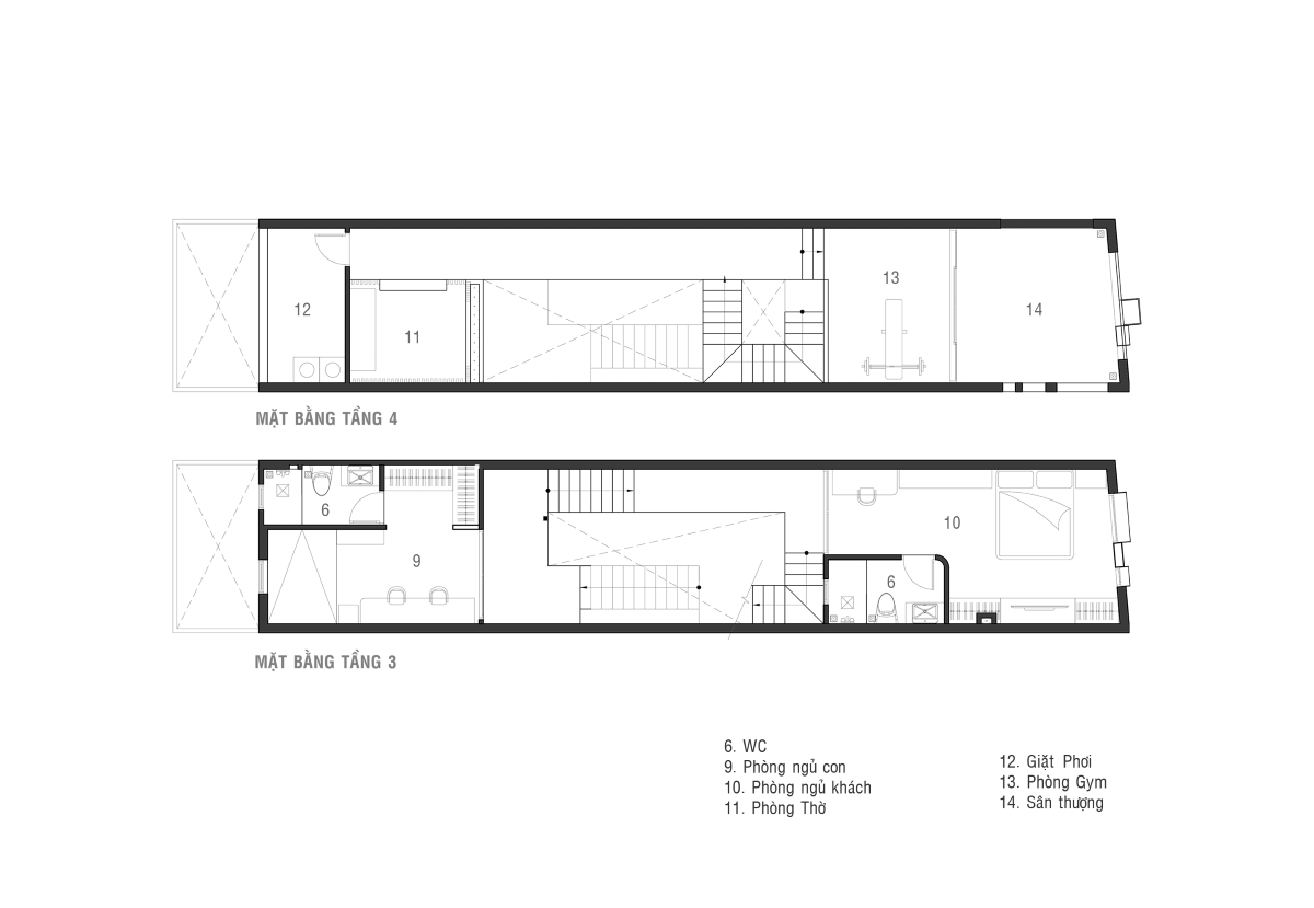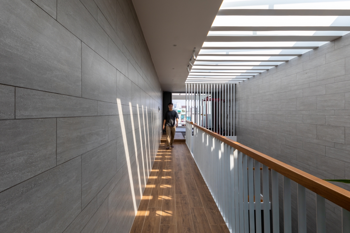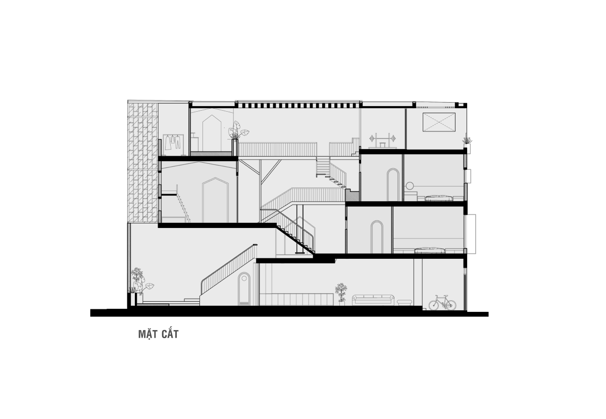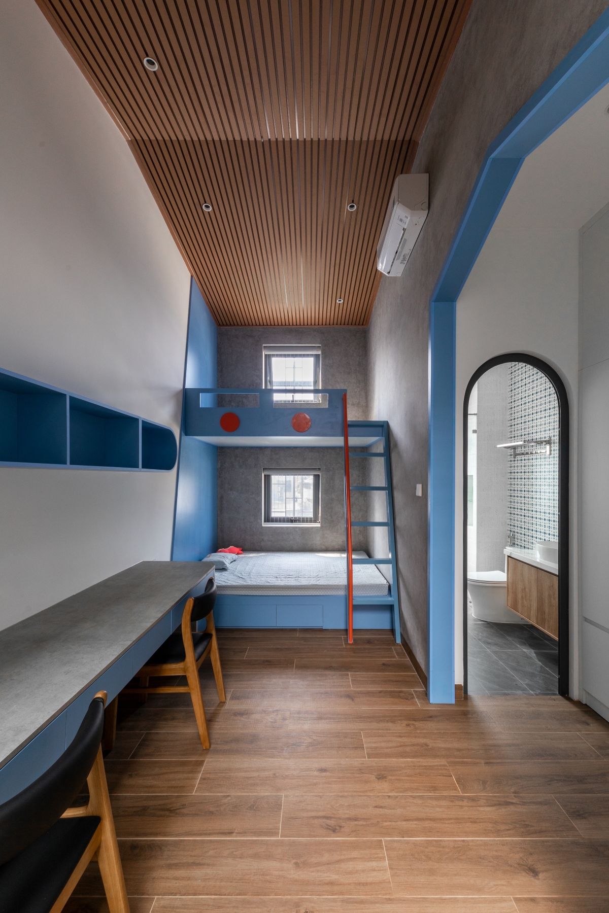 Ngôi nhà 4x22m được thiết kế nhằm giúp cha mẹ dễ dàng trông con nhỏ trong khi làm việc nhà. Các khoảng thông tầng giữa và sau nhà không chỉ đưa ánh sáng tự nhiên vào tối đa mà còn giúp kết nối trực quan giữa các tầng, cho phép phụ huynh quan sát con dễ dàng. Sàn lệch giúp rút ngắn cầu thang và tích hợp thêm máng trượt, tạo không gian vui chơi an toàn ngay trong nhà.
