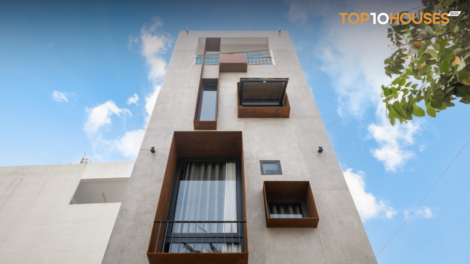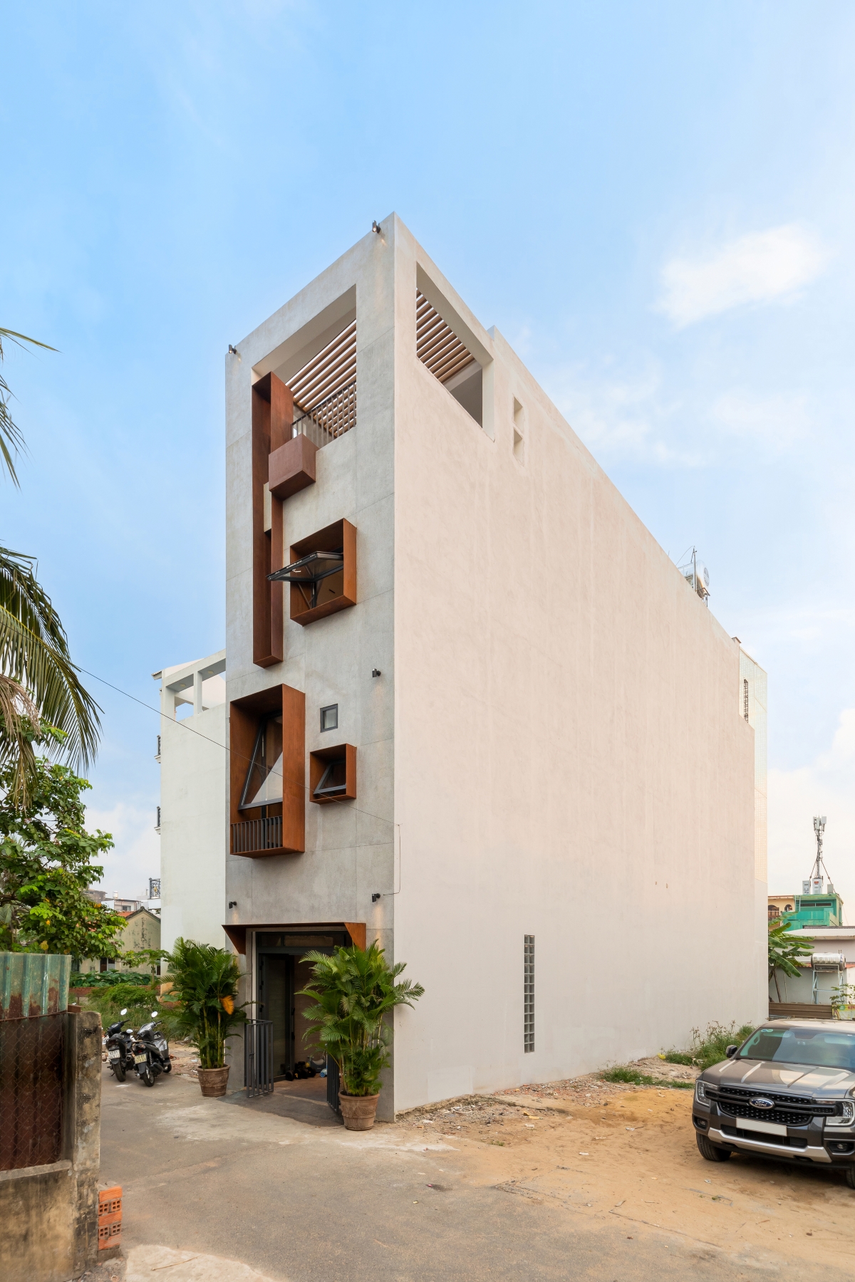 Mặt tiền ngôi nhà được thiết kế tối giản nhưng mạnh mẽ, với các ô cửa theo tỷ lệ vàng kết hợp cùng vật liệu đá mài và thép la, tạo điểm nhấn hiện đại, bền vững theo thời gian.