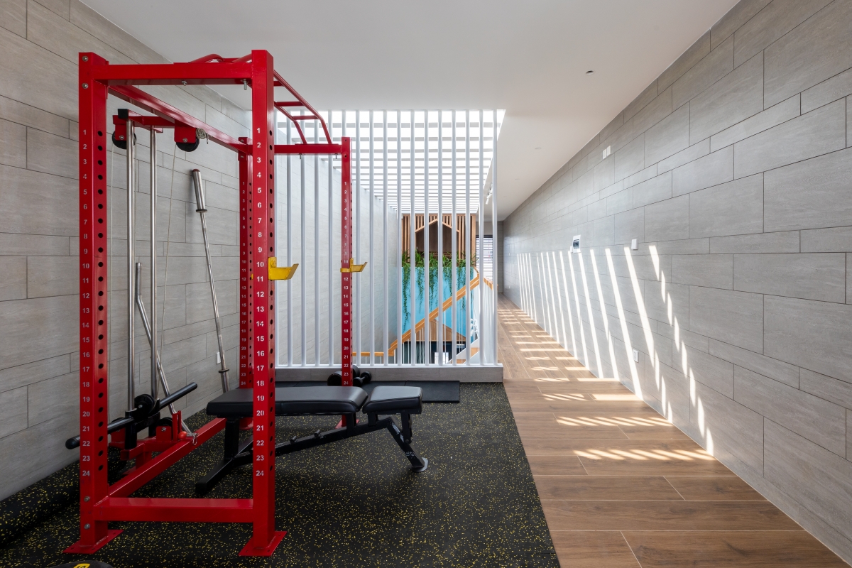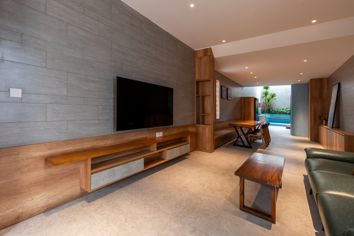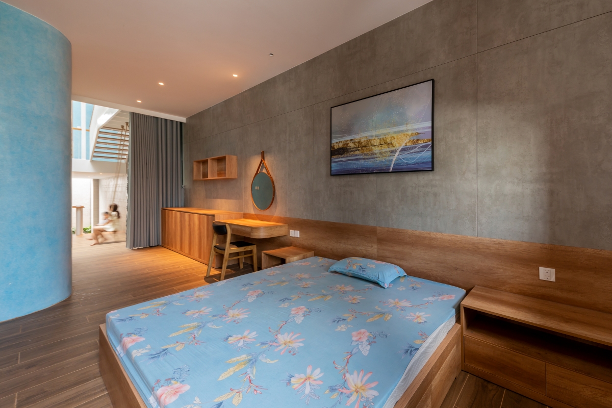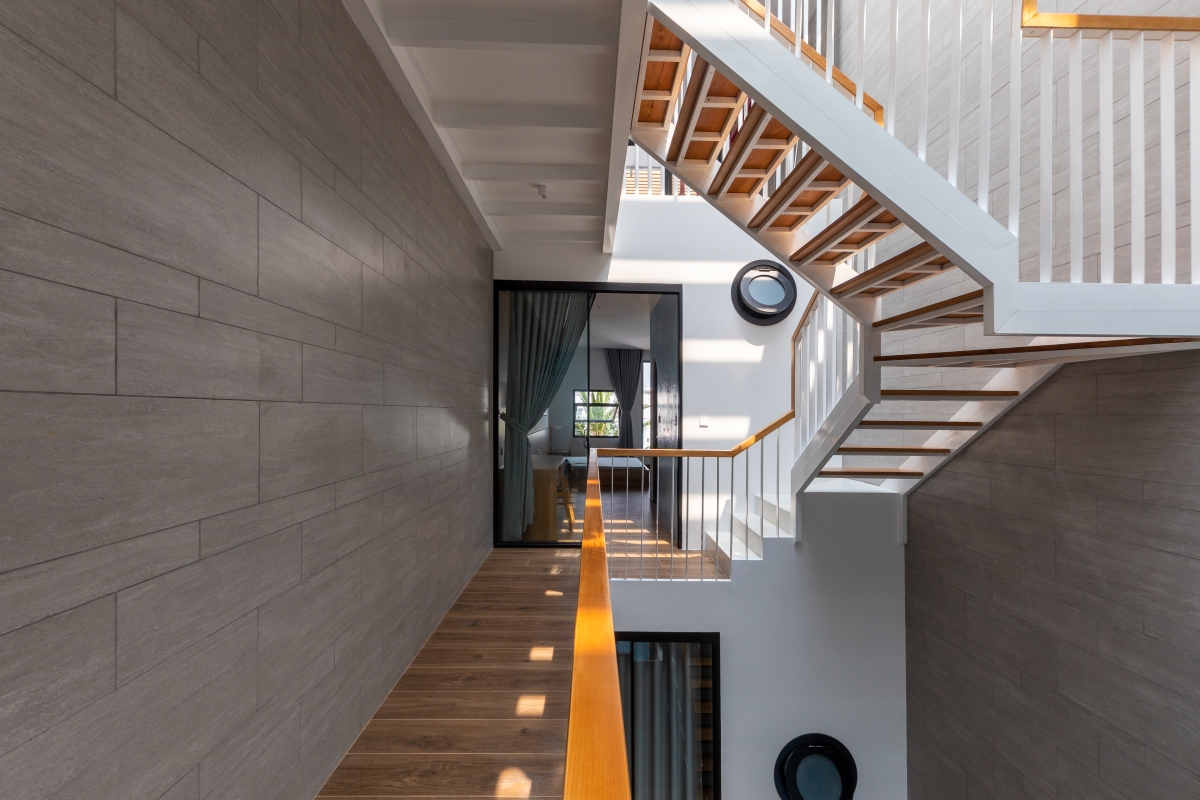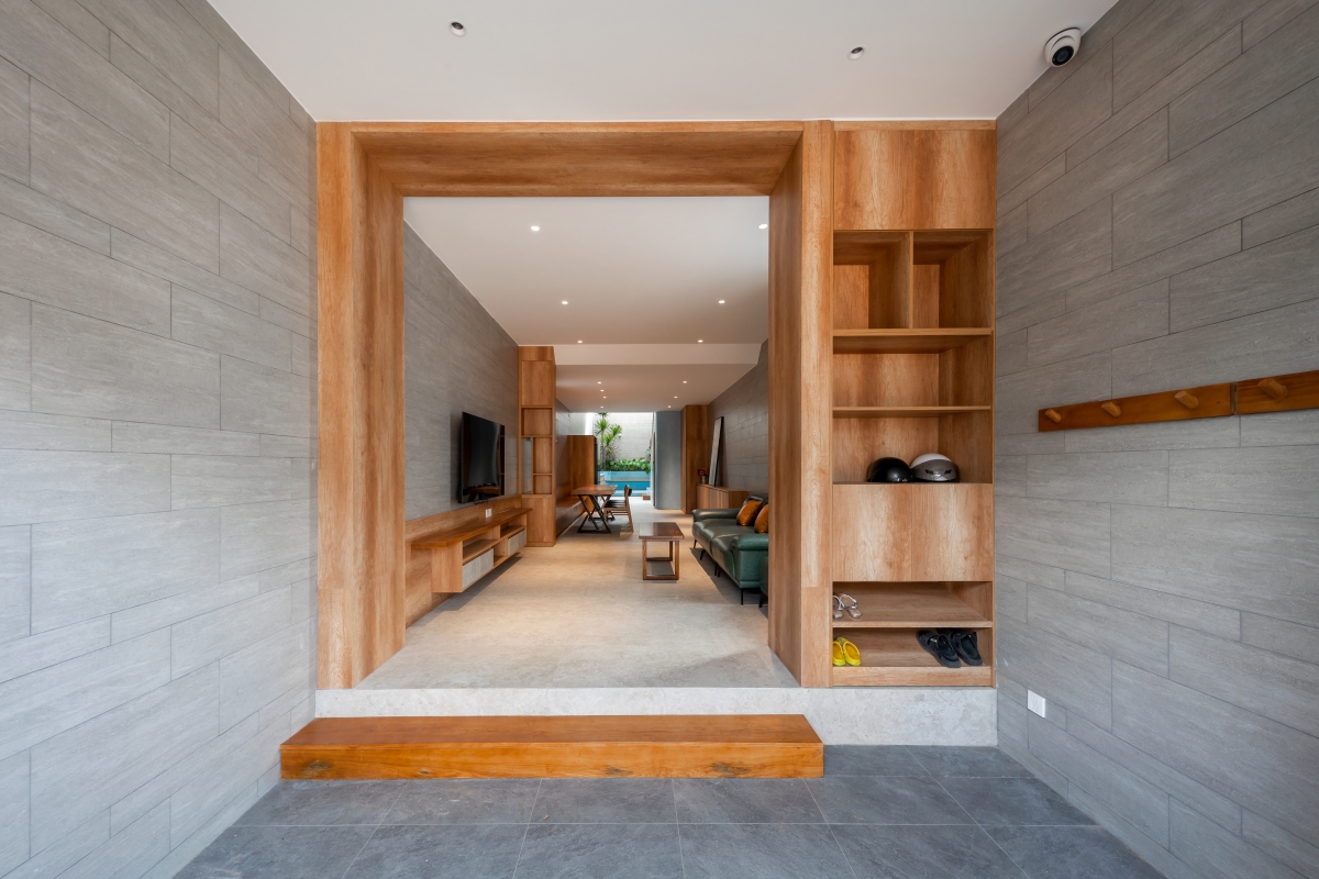 Thay vì dành diện tích cho sân trước, không gian được tối ưu hóa vào sân sau và sảnh giữa, đảm bảo khu vực vui chơi cho trẻ an toàn hơn mà không cần sự giám sát liên tục. Bố cục nội thất hướng đến sự đơn giản, bền bỉ, dễ lau dọn, giúp gia chủ tiết kiệm thời gian để chăm sóc con cái và bản thân.