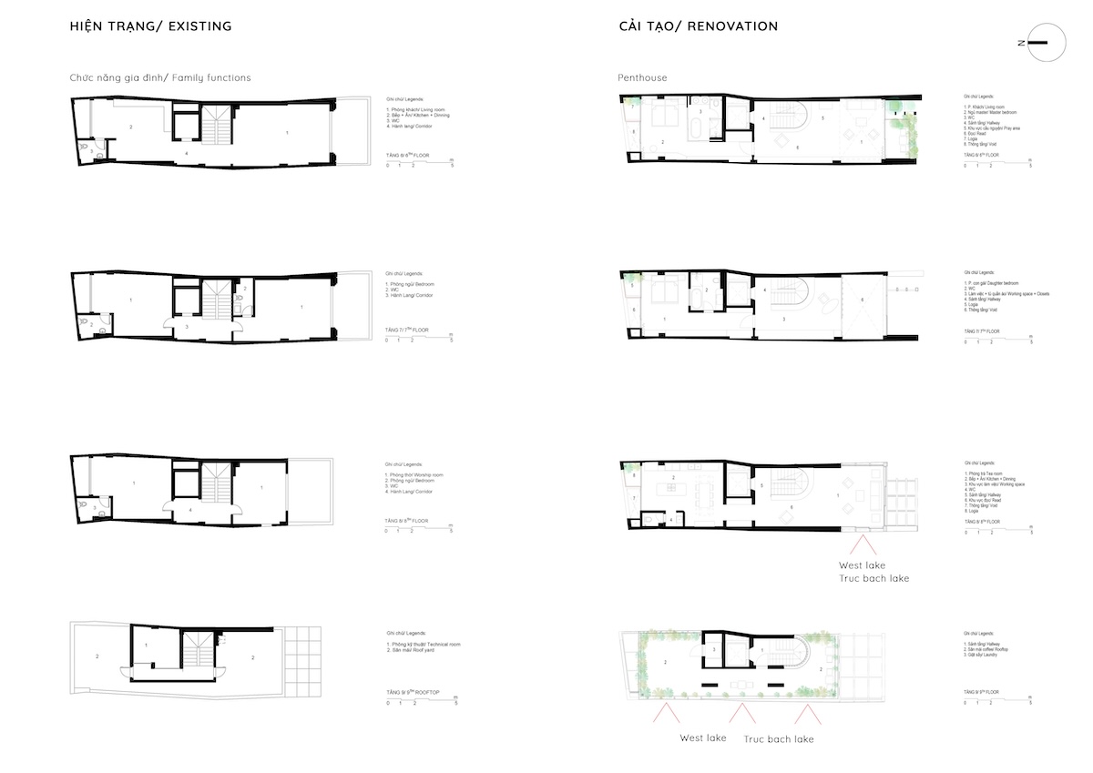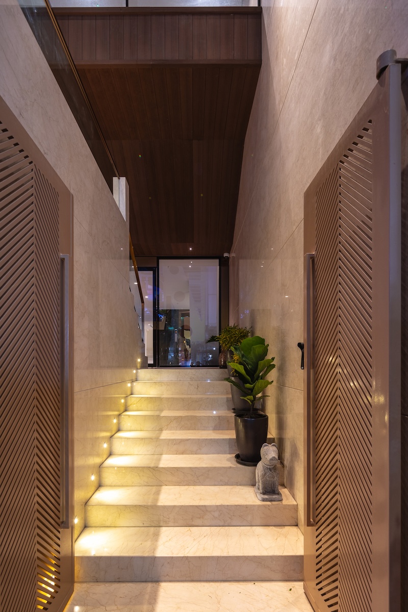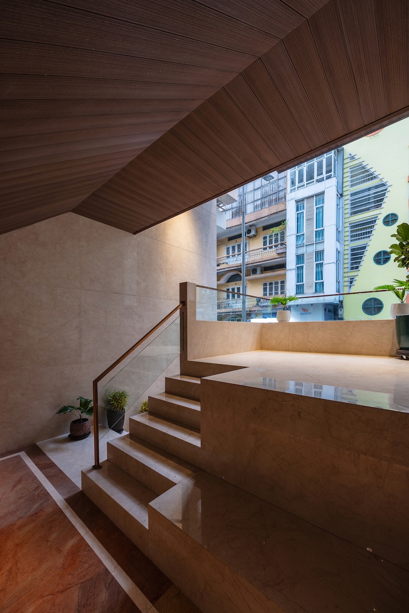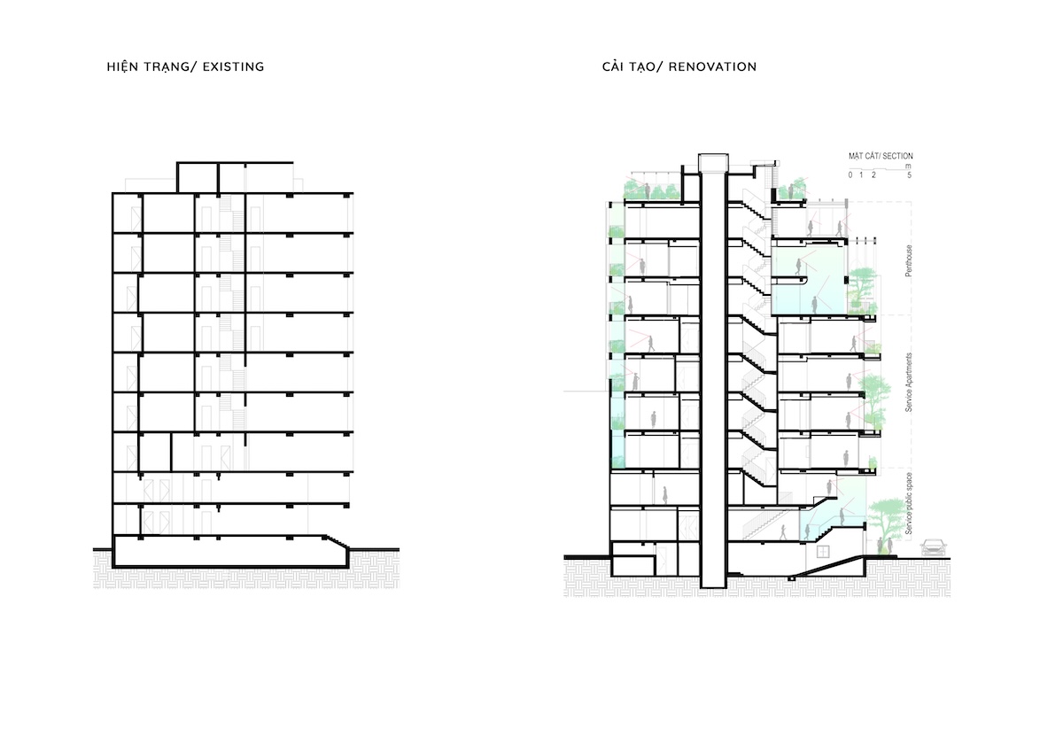 Cuộc cách mạng từ lõi giao thông Điểm nhấn đột phá trong cải tạo là việc xoay dọc hệ thống thang bộ theo chiều dài khu đất. Giải pháp này không chỉ tối ưu hóa luồng di chuyển mà còn giải phóng hoàn toàn diện tích trung tâm, tạo sự linh hoạt tối đa cho việc phân chia các căn hộ dịch vụ và khu vực kinh doanh.