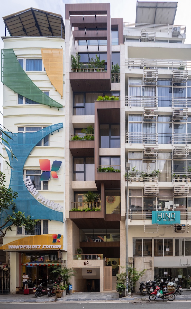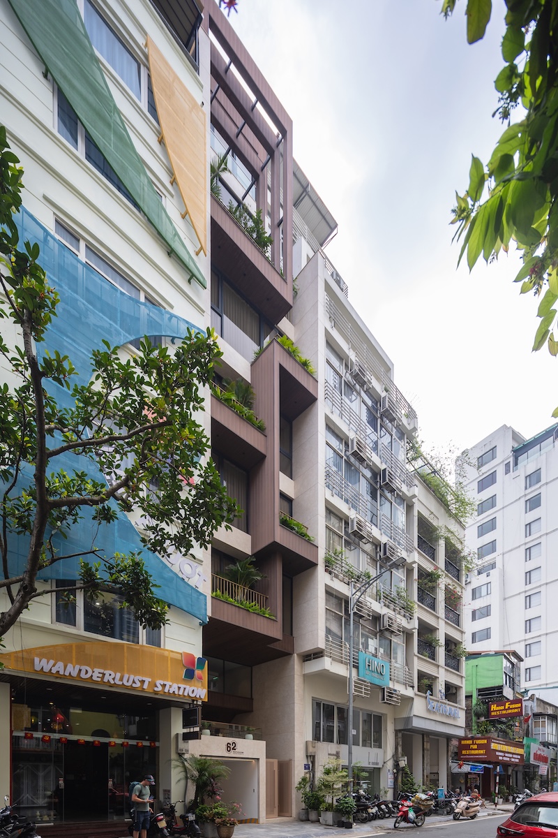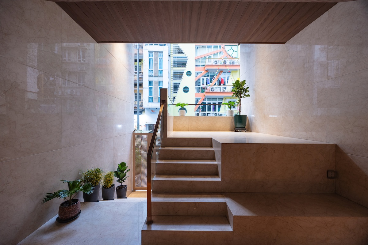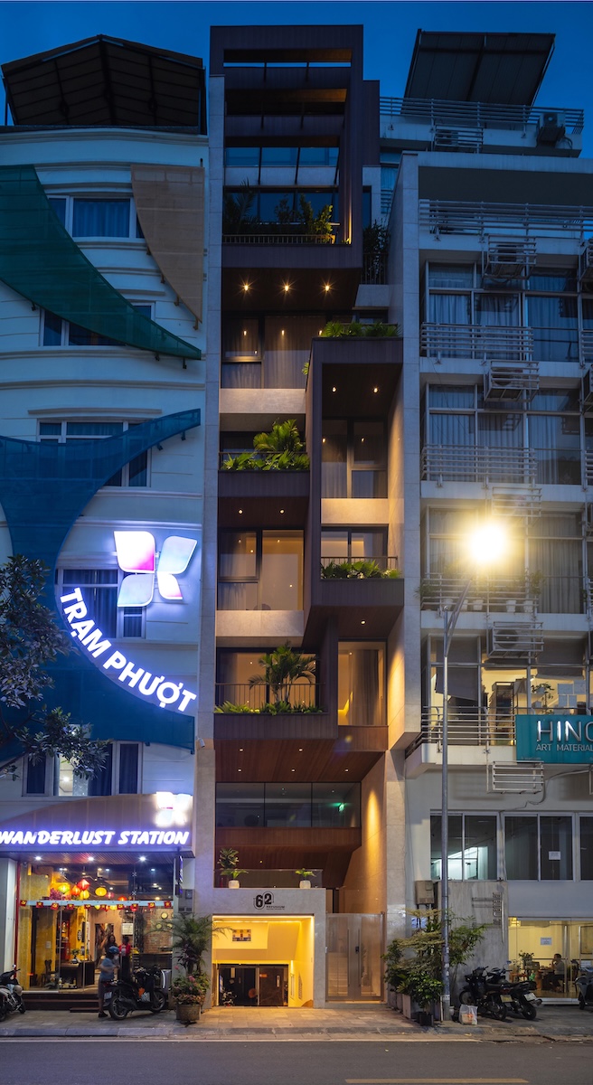 Lớp vỏ bao che thông minh Đối mặt với khói bụi và tiếng ồn từ trục đường lớn, mặt tiền hướng Nam được trang bị hệ logia đan xen cùng lam chắn nắng và cây xanh. “Lớp da thứ hai” này đóng vai trò như một bộ lọc tự nhiên, giữ cho không gian bên trong luôn tĩnh lặng, mát mẻ mà vẫn tràn ngập ánh sáng.