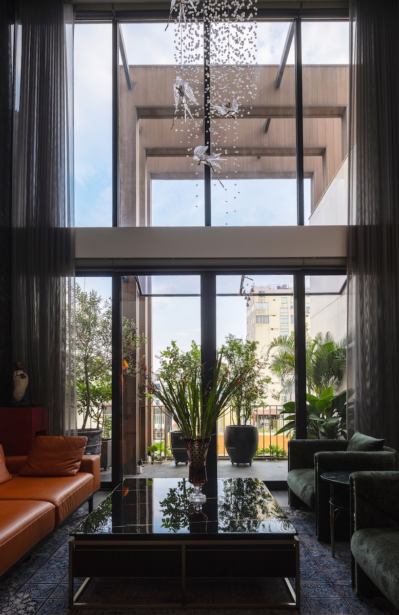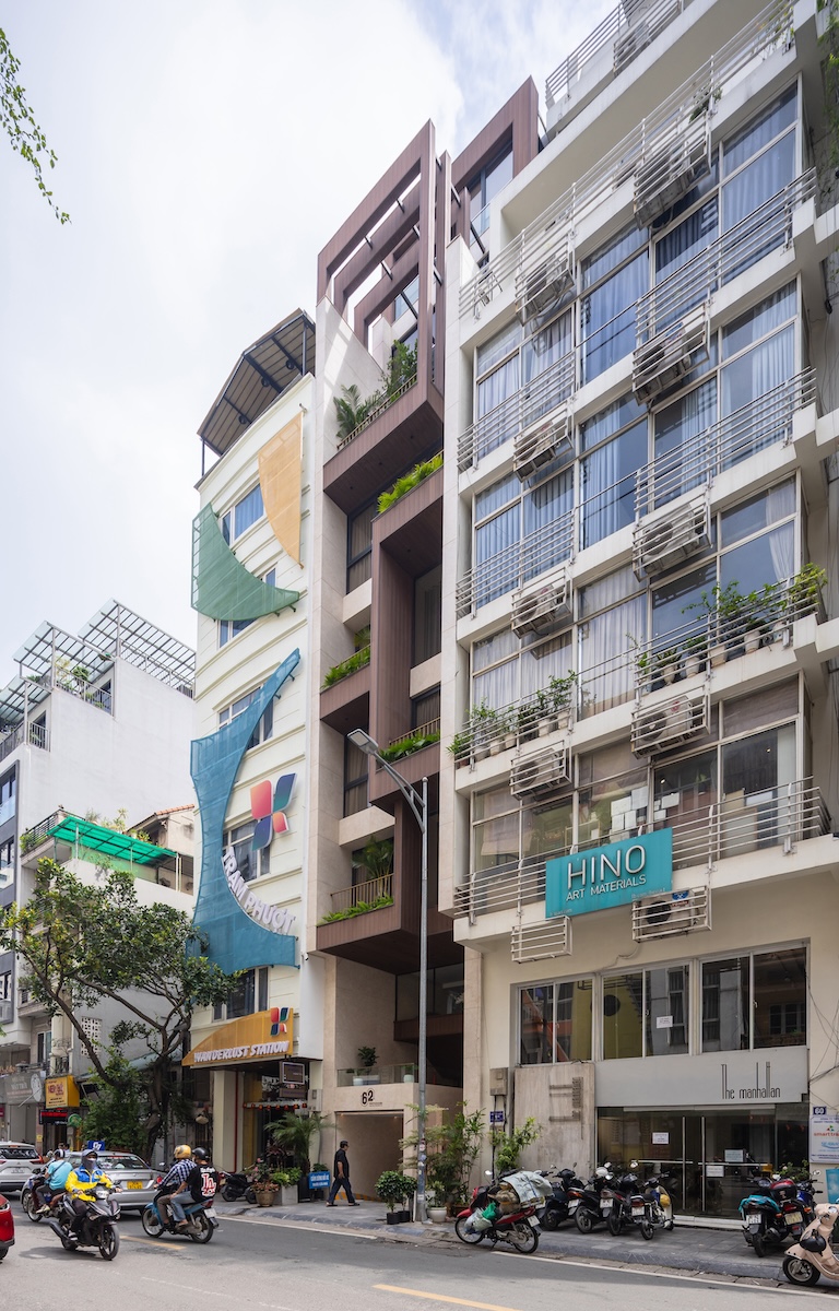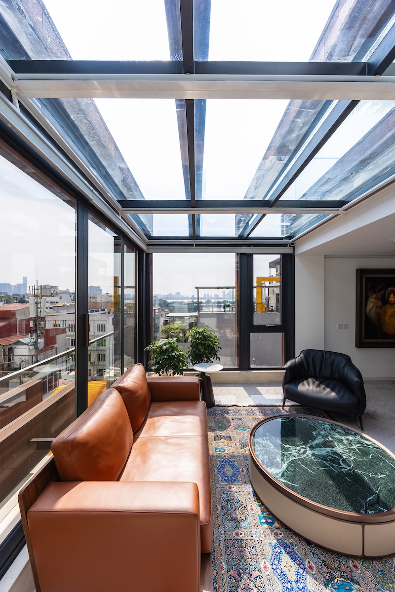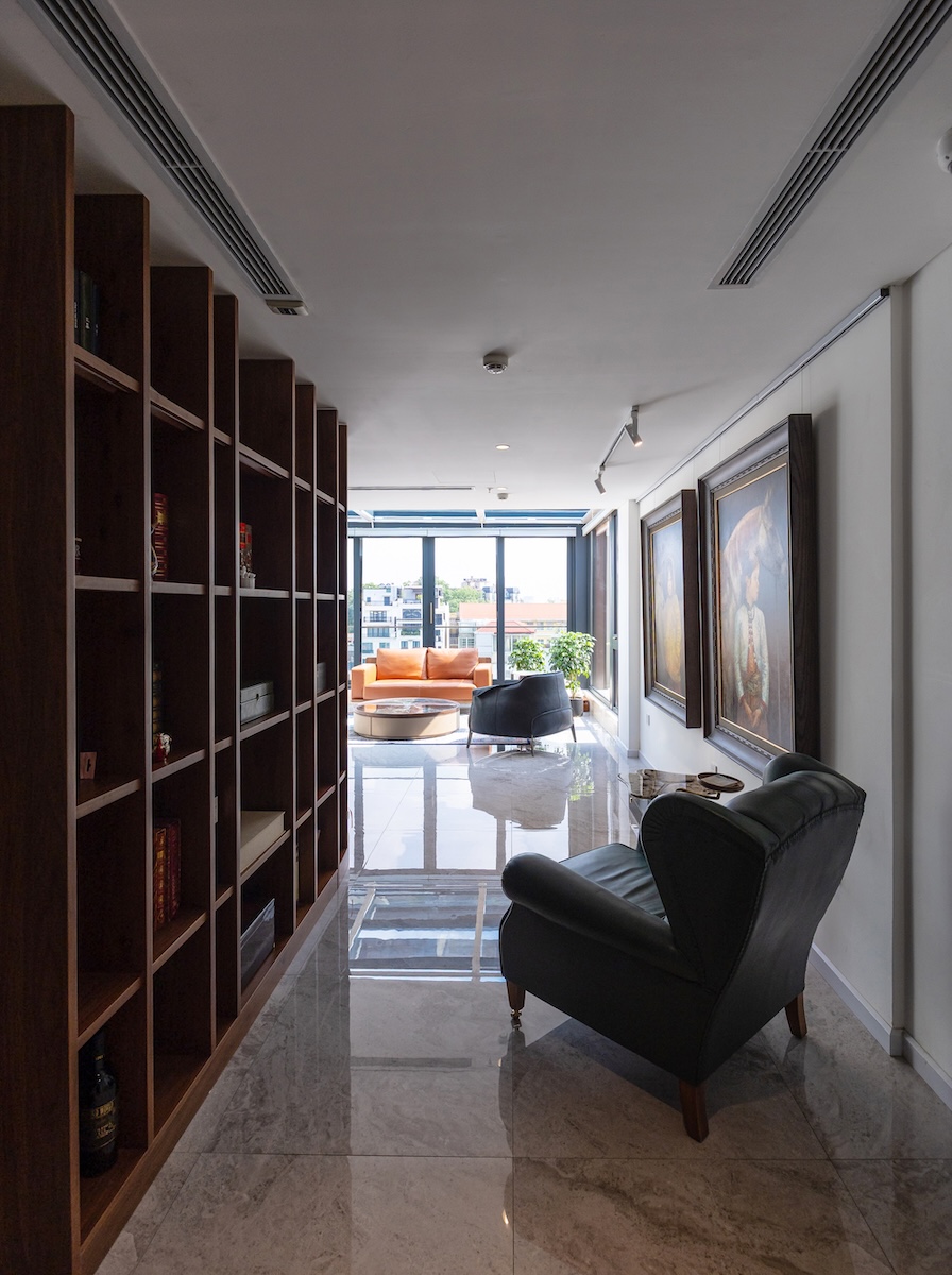 Lớp vỏ bao che thông minh Đối mặt với khói bụi và tiếng ồn từ trục đường lớn, mặt tiền hướng Nam được trang bị hệ logia đan xen cùng lam chắn nắng và cây xanh. “Lớp da thứ hai” này đóng vai trò như một bộ lọc tự nhiên, giữ cho không gian bên trong luôn tĩnh lặng, mát mẻ mà vẫn tràn ngập ánh sáng.