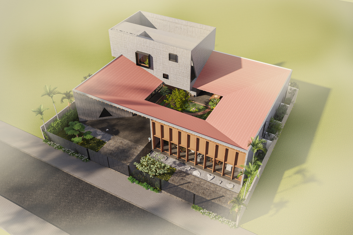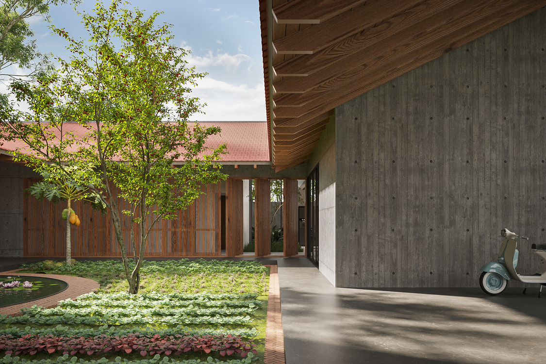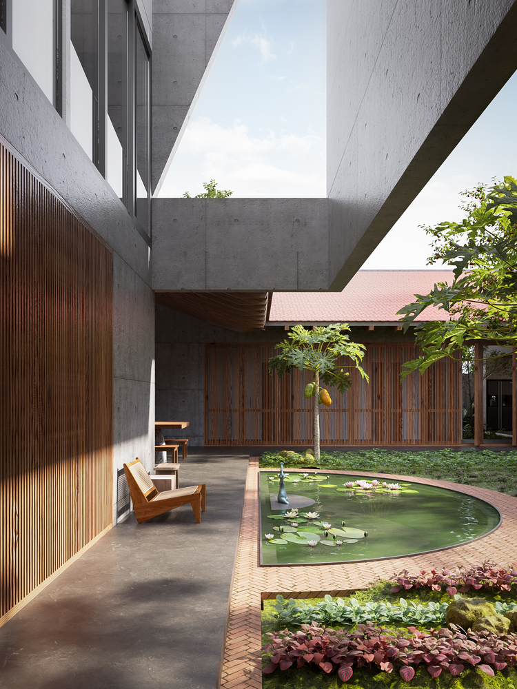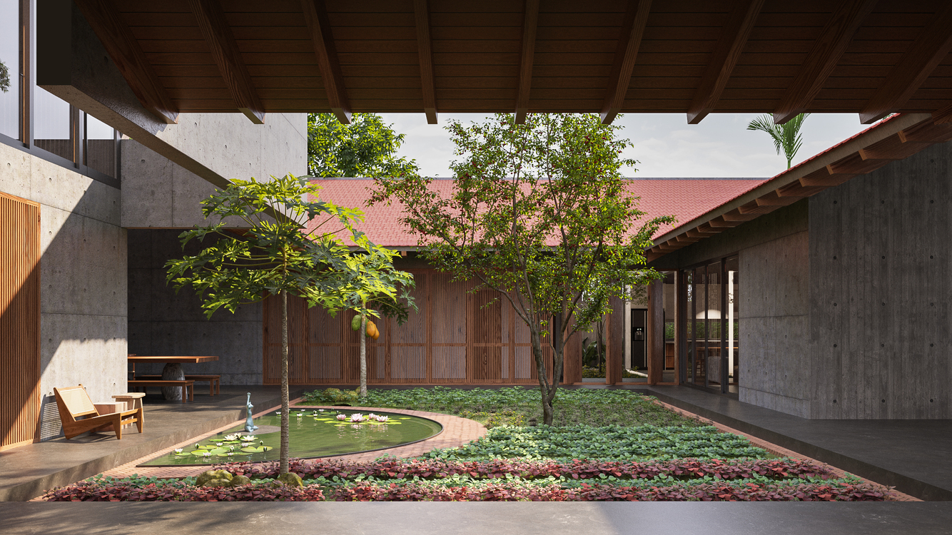 Nếp mái ngói truyền thống mang sắc đỏ ấm áp, ôm trọn lấy công trình, làm tôn lên hình khối giản dị và gợi cảm giác gần gũi, thân quen. Hàng hiên rộng trải dài bên dưới, giữ lại dáng dấp mái nhà xưa, đồng thời tạo lớp đệm che chở  không gian trước nắng gắt mùa khô và mưa dầm mùa đông. Ở phía sau, gạch thông gió đóng vai trò giải pháp thầm lặng, đảm bảo tiện nghi nhiệt và giảm phát thải co trong quá trình sản xuất vật liệu.