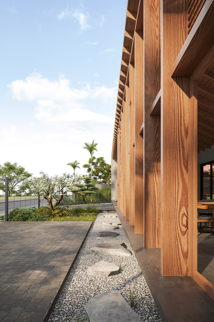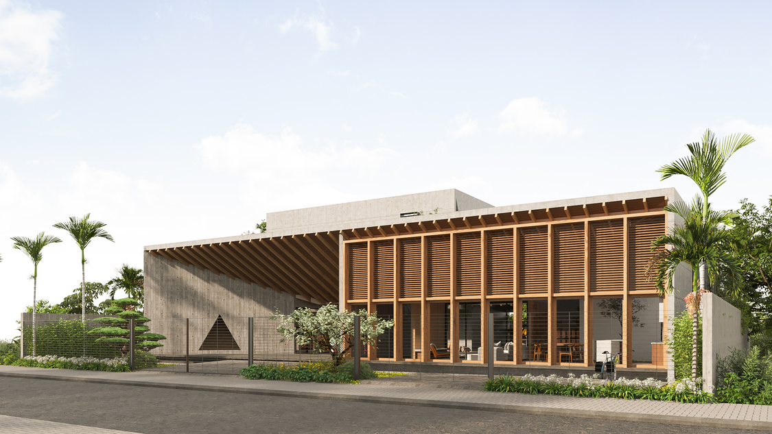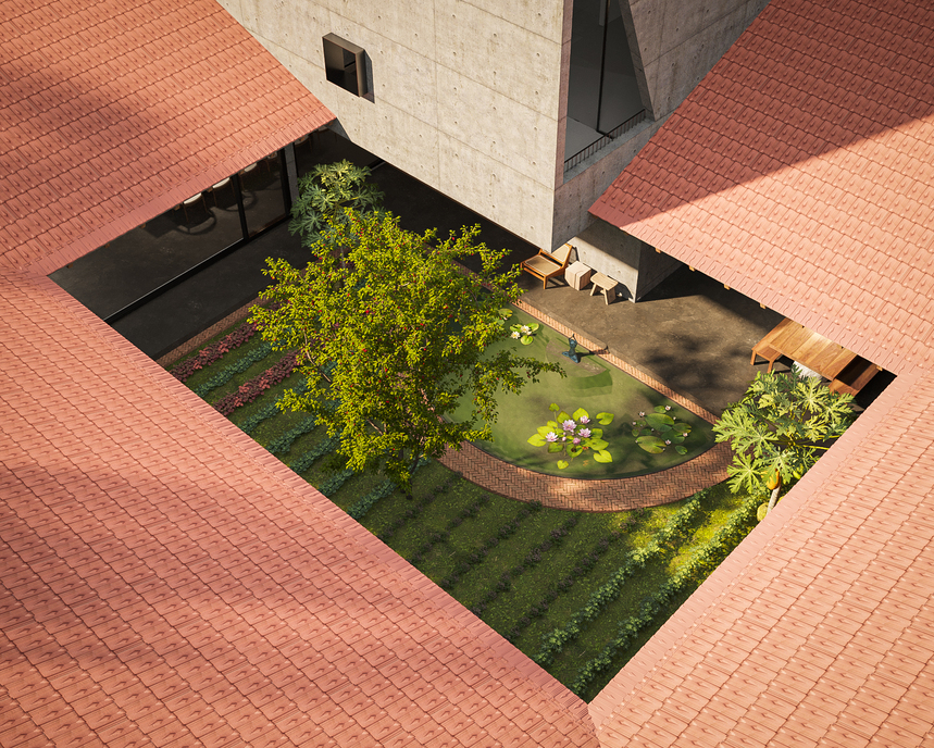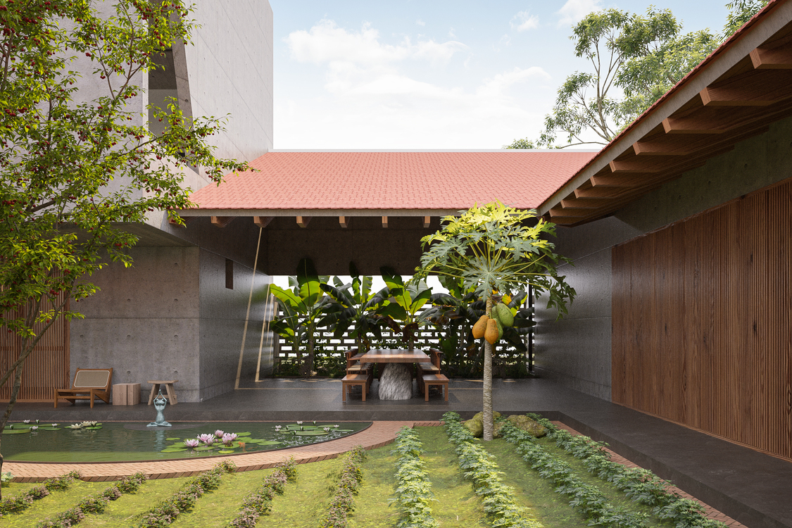 Nếp mái ngói truyền thống mang sắc đỏ ấm áp, ôm trọn lấy công trình, làm tôn lên hình khối giản dị và gợi cảm giác gần gũi, thân quen. Hàng hiên rộng trải dài bên dưới, giữ lại dáng dấp mái nhà xưa, đồng thời tạo lớp đệm che chở  không gian trước nắng gắt mùa khô và mưa dầm mùa đông. Ở phía sau, gạch thông gió đóng vai trò giải pháp thầm lặng, đảm bảo tiện nghi nhiệt và giảm phát thải co trong quá trình sản xuất vật liệu.