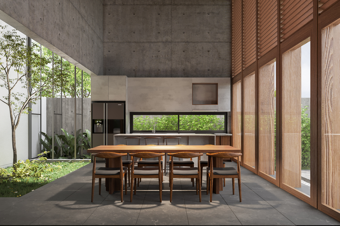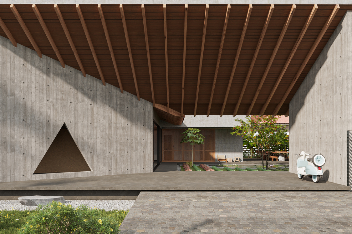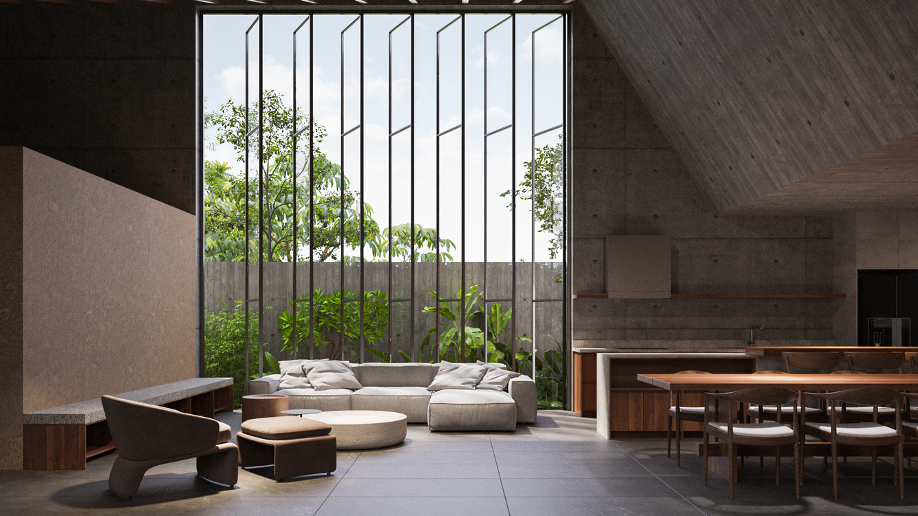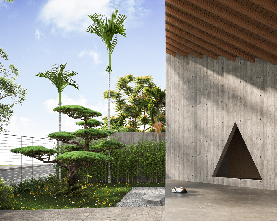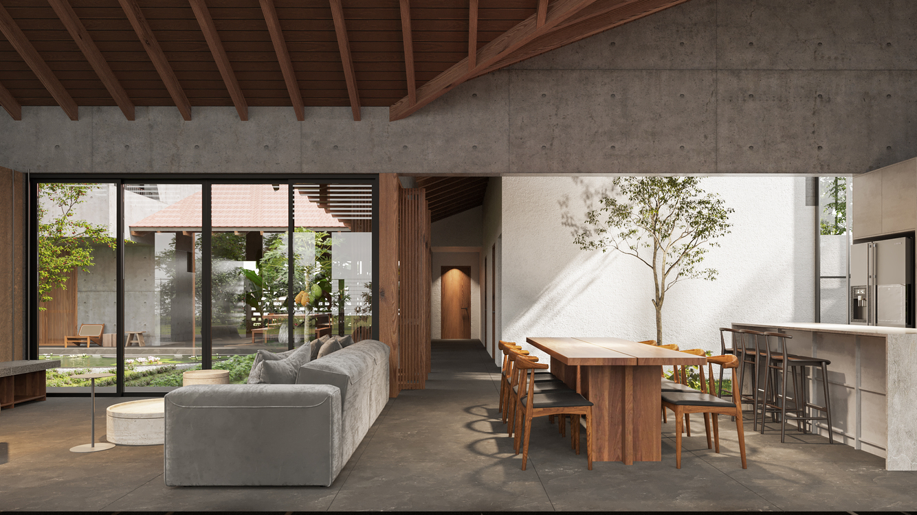 Bước vào bên trong, các hành lang nối tiếp giúp ánh sáng lan tỏa nhẹ nhàng và duy trì đối lưu không khí tự nhiên. Tường bê tông trần giữ vẻ thô mộc, đồng thời tối giản năng lượng thi công. Hệ cửa kính và lam gỗ định hình nhịp sáng – tối, đưa gió và ánh sáng đi sâu vào không gian sống. Thiên nhiên vì thế không “đi vào” ngôi nhà, mà hiện diện như một phần đời sống thường nhật.