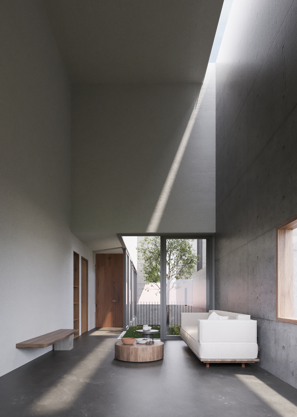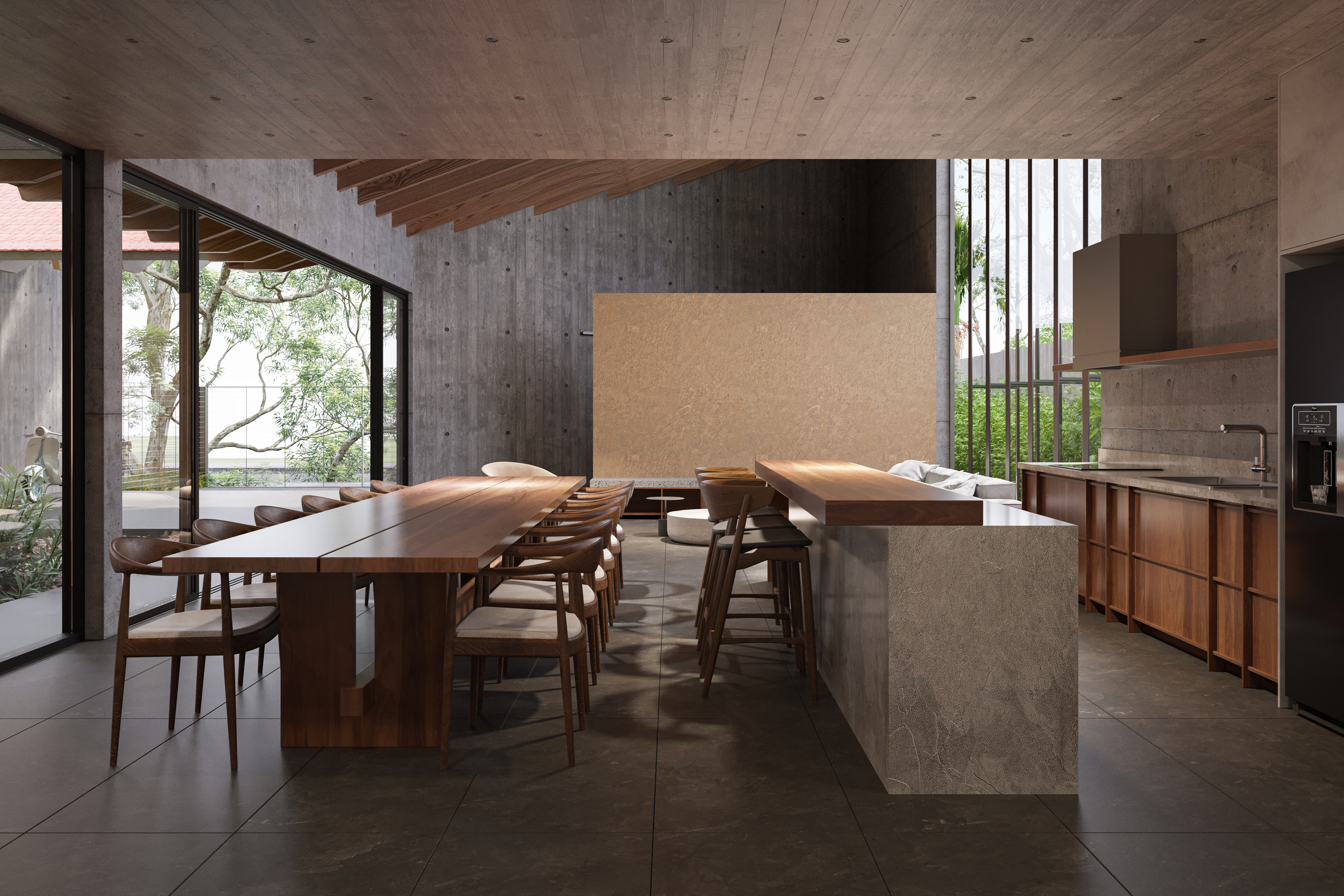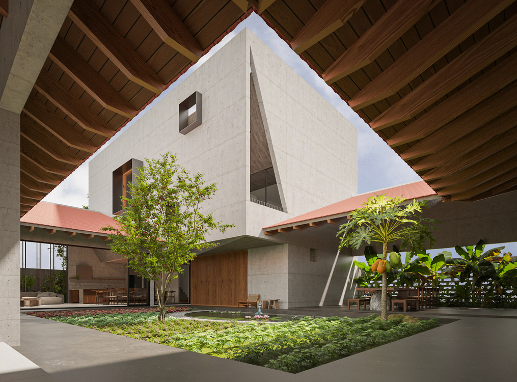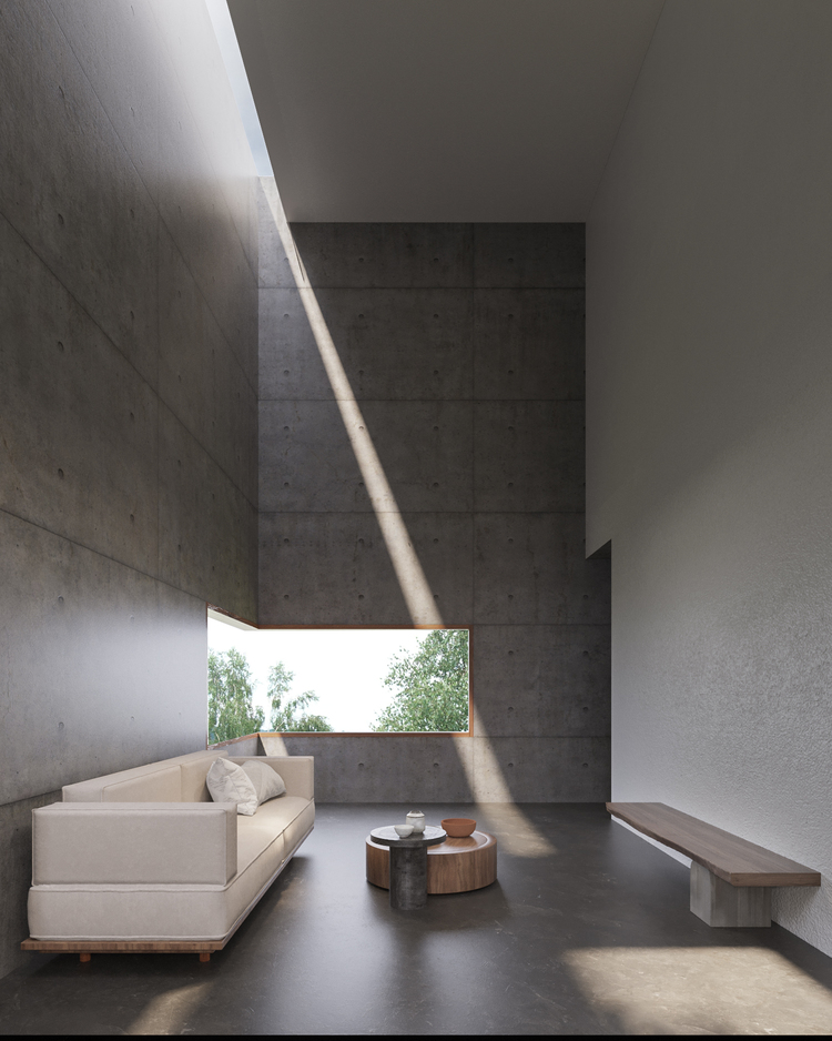 Bước vào bên trong, các hành lang nối tiếp giúp ánh sáng lan tỏa nhẹ nhàng và duy trì đối lưu không khí tự nhiên. Tường bê tông trần giữ vẻ thô mộc, đồng thời tối giản năng lượng thi công. Hệ cửa kính và lam gỗ định hình nhịp sáng – tối, đưa gió và ánh sáng đi sâu vào không gian sống. Thiên nhiên vì thế không “đi vào” ngôi nhà, mà hiện diện như một phần đời sống thường nhật.
