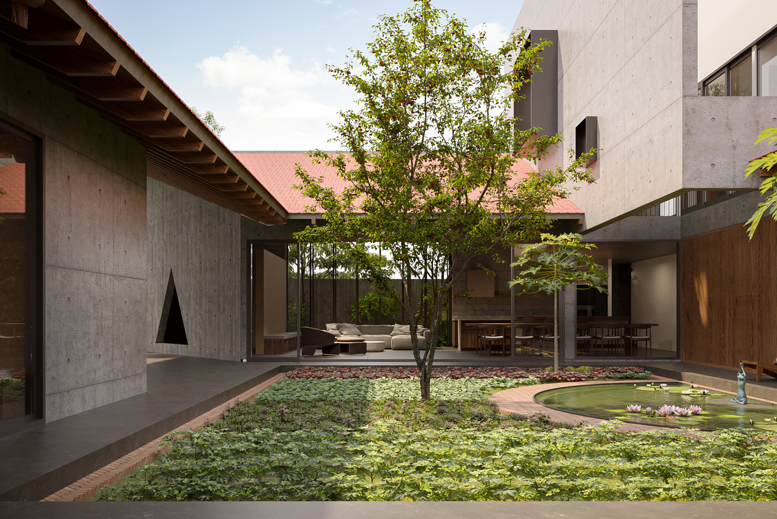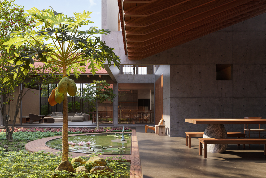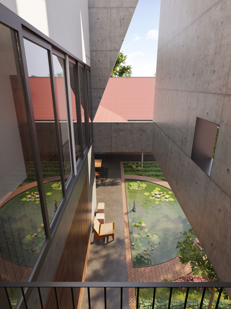 Khoảng sân trong là trái tim của à Ơi House, nơi các thành viên cùng ngồi thưởng trà, trò chuyện, trong khi trẻ nhỏ thoải mái vui đùa mà vẫn dễ dàng quan sát. Giữa sân, yếu tố mặt nước được thêm thắt nhẹ nhàng, góp phần điều hòa vi khí hậu, phản chiếu ánh sáng một cách tự nhiên. Hệ thống thu gom nước mưa từ mái nhà sử dụng cho việc tưới tiêu vườn rau, kết hợp với cây bản địa hạn chế tiêu thụ nước, vừa mang lại cảnh quan sinh động, vừa góp phần tiết kiệm nguồn nước.