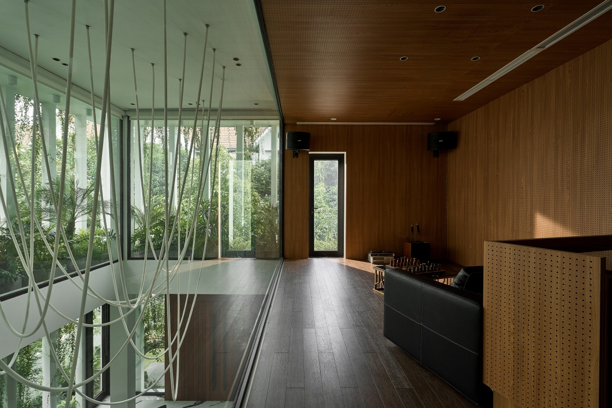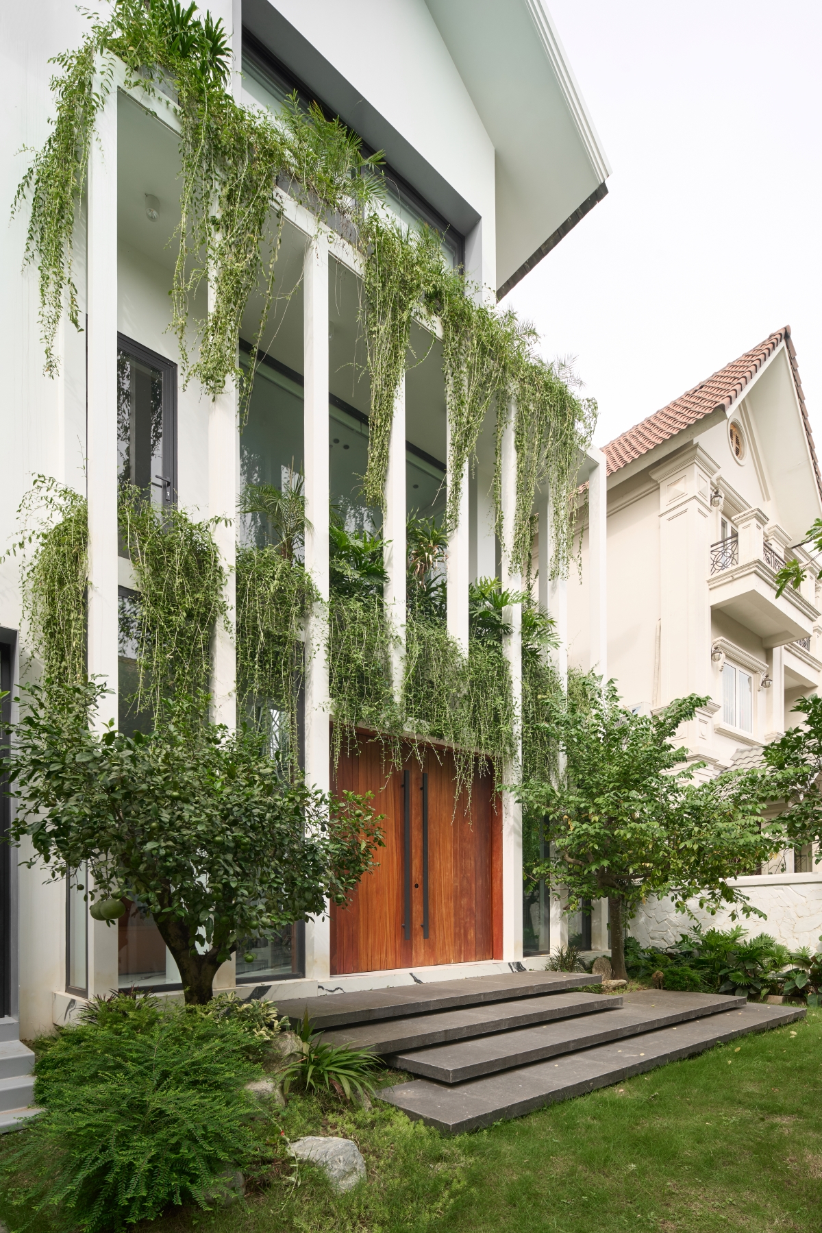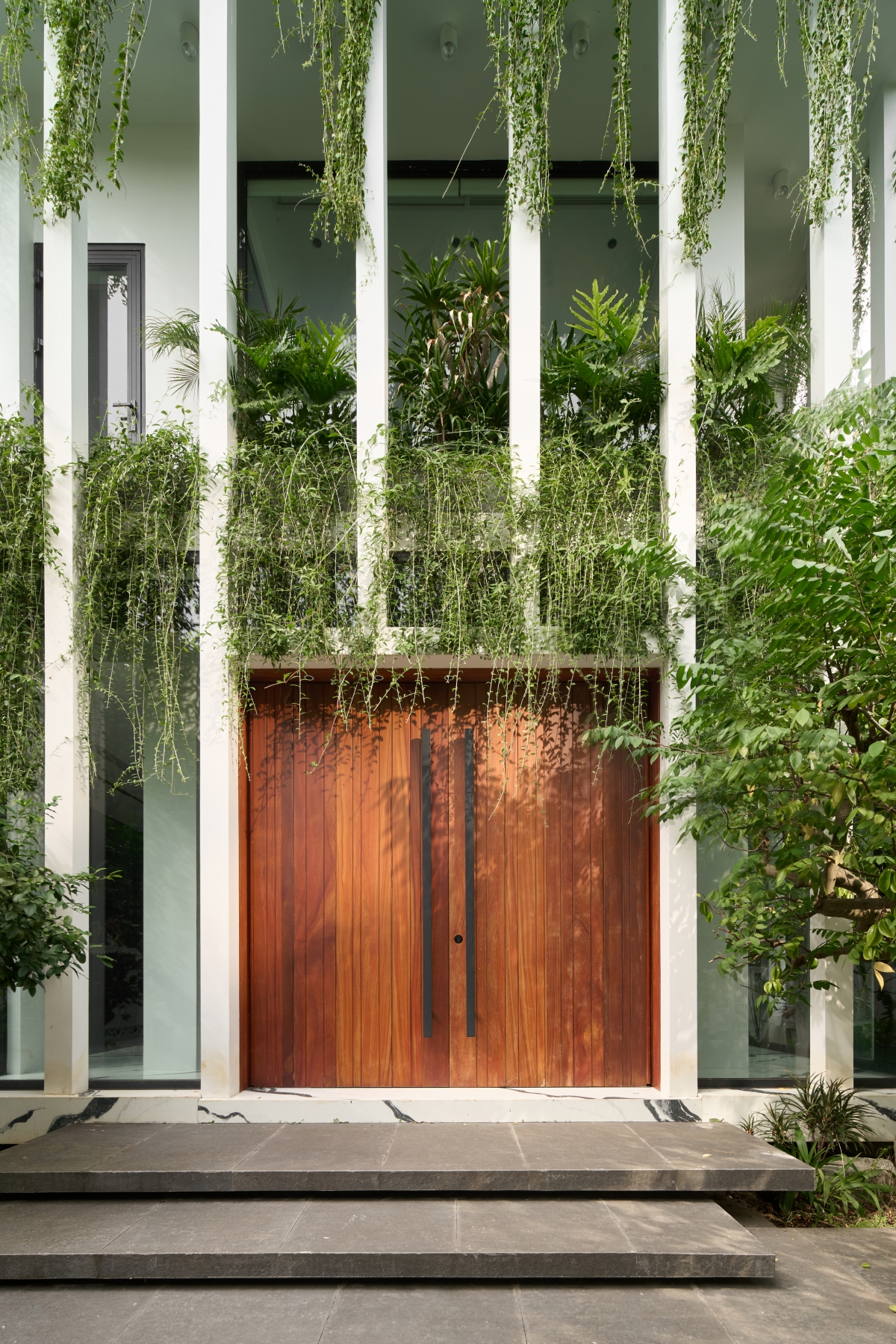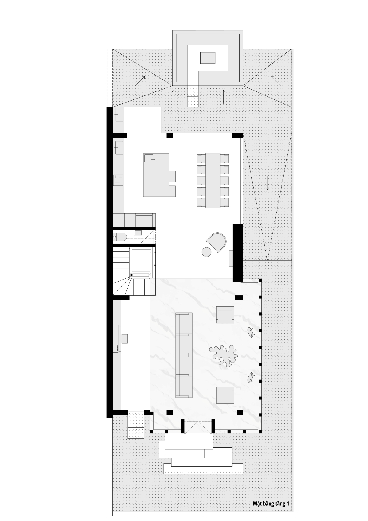 Gia chủ là người dành nhiều thời gian sinh hoạt ở nhà, do đó thiết kế muốn ưu tiên trải nghiệm tốt nhất cho khu vực chung là phòng khách và phòng bếp ăn. Trong đó khu bếp và phòng ăn được đập thông với vách cửa lùa lớn để view trọn con sông phía sau nhà. Phòng khách là điểm nhấn như một khối hộp độc lập cao theo chiều cao của 2 tầng nhà. Khoảng thông tầng được bọc bởi hệ lam kiến trúc thẳng đứng. Mặt tiếp xúc của hệ lam đứng quay về phía Bắc nên hạn chế được tối đa tia nắng mạnh rọi vào nhà. Hệ cây xanh được kết hợp cả cây đứng lẫn cây rũ, tối đa khả năng quan sát khi ngồi ở phòng khách. Ranh giới giữa trong nhà và ngoài nhà được tiêu biến nhờ hệ lam kiến trúc xen lẫn với hệ cây xanh.