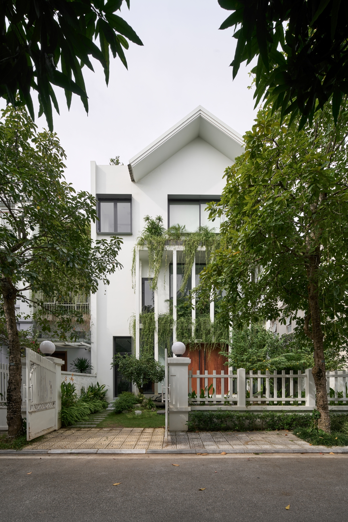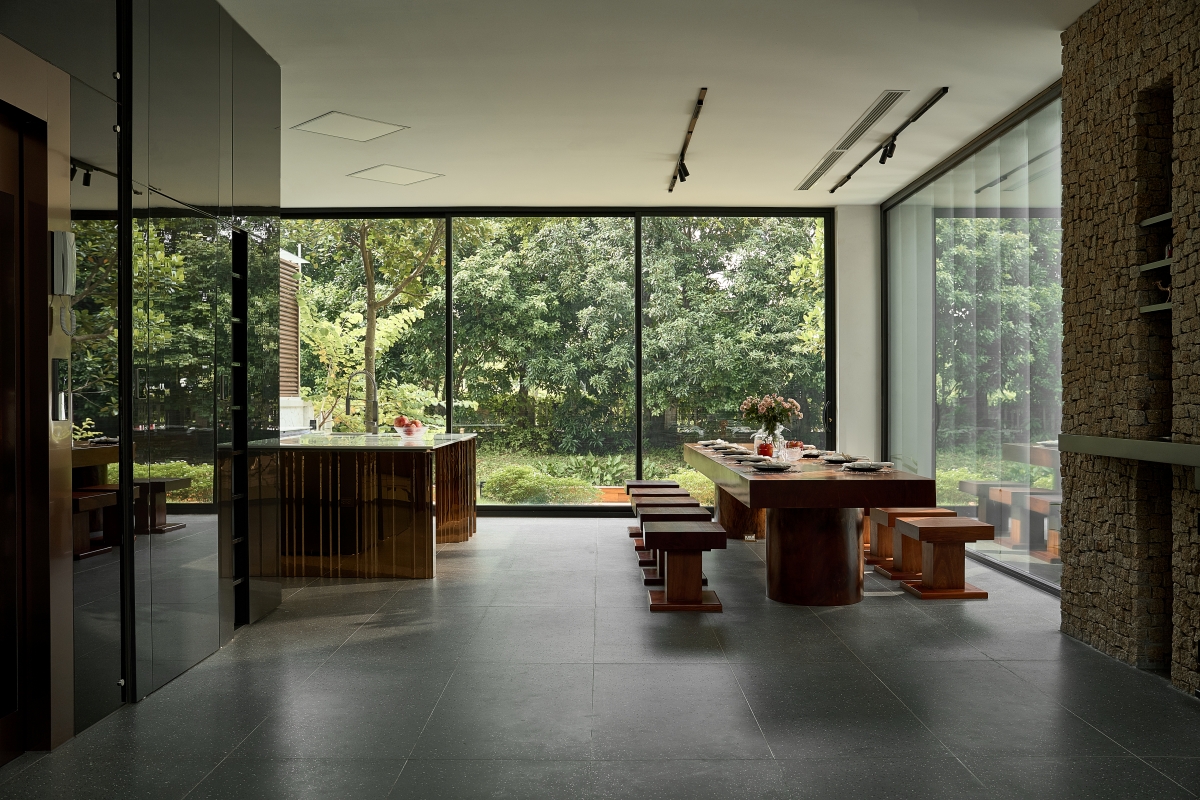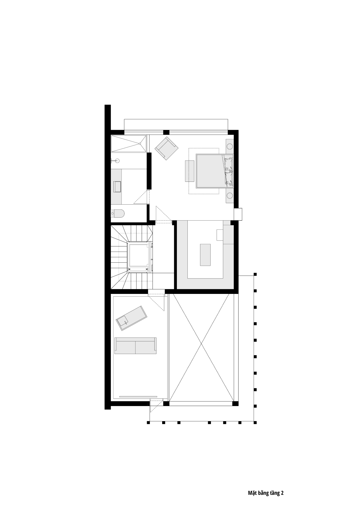 Gia chủ là người dành nhiều thời gian sinh hoạt ở nhà, do đó thiết kế muốn ưu tiên trải nghiệm tốt nhất cho khu vực chung là phòng khách và phòng bếp ăn. Trong đó khu bếp và phòng ăn được đập thông với vách cửa lùa lớn để view trọn con sông phía sau nhà. Phòng khách là điểm nhấn như một khối hộp độc lập cao theo chiều cao của 2 tầng nhà. Khoảng thông tầng được bọc bởi hệ lam kiến trúc thẳng đứng. Mặt tiếp xúc của hệ lam đứng quay về phía Bắc nên hạn chế được tối đa tia nắng mạnh rọi vào nhà. Hệ cây xanh được kết hợp cả cây đứng lẫn cây rũ, tối đa khả năng quan sát khi ngồi ở phòng khách. Ranh giới giữa trong nhà và ngoài nhà được tiêu biến nhờ hệ lam kiến trúc xen lẫn với hệ cây xanh.