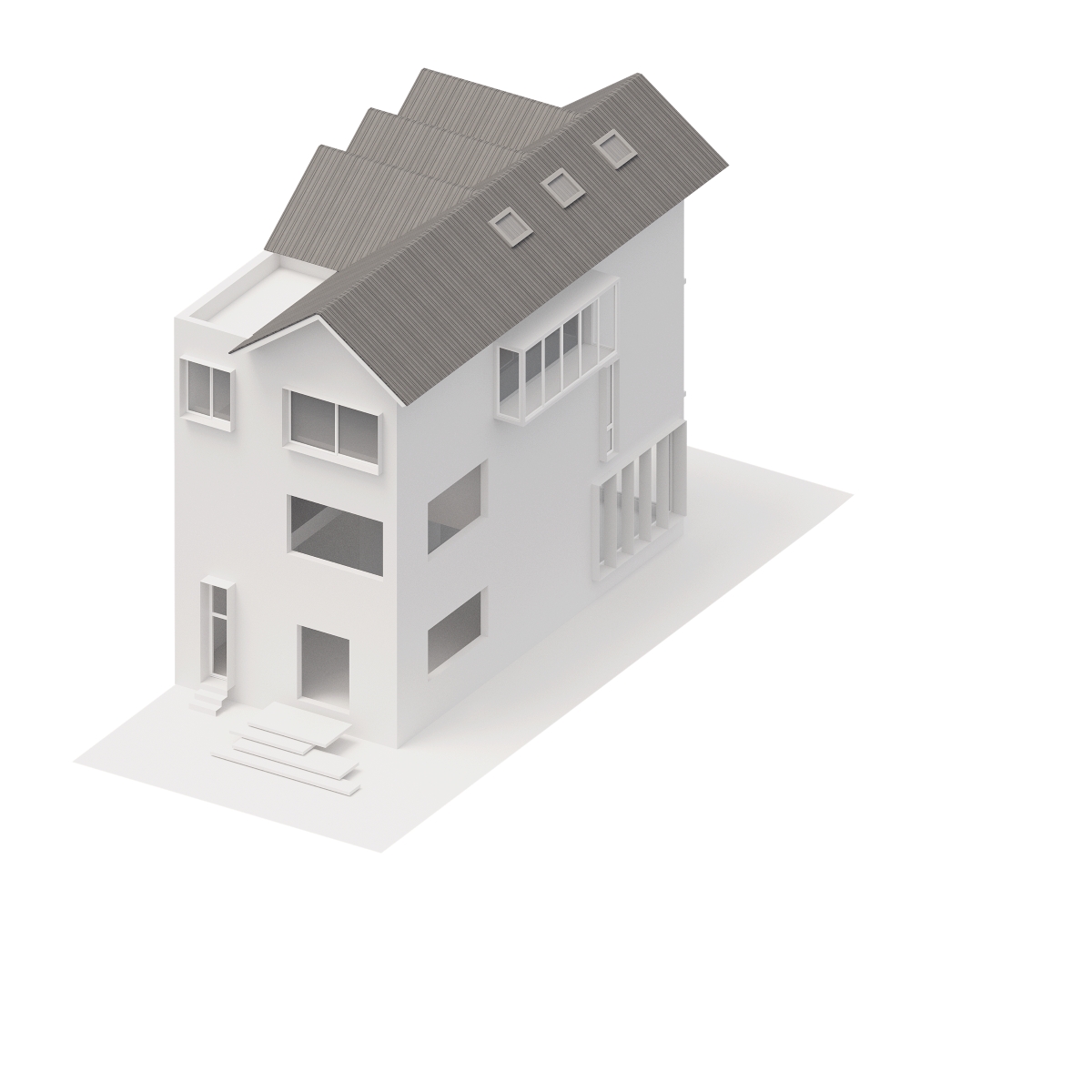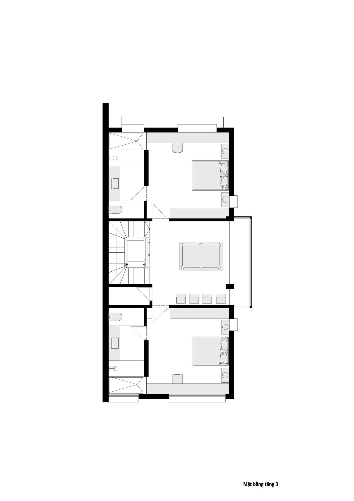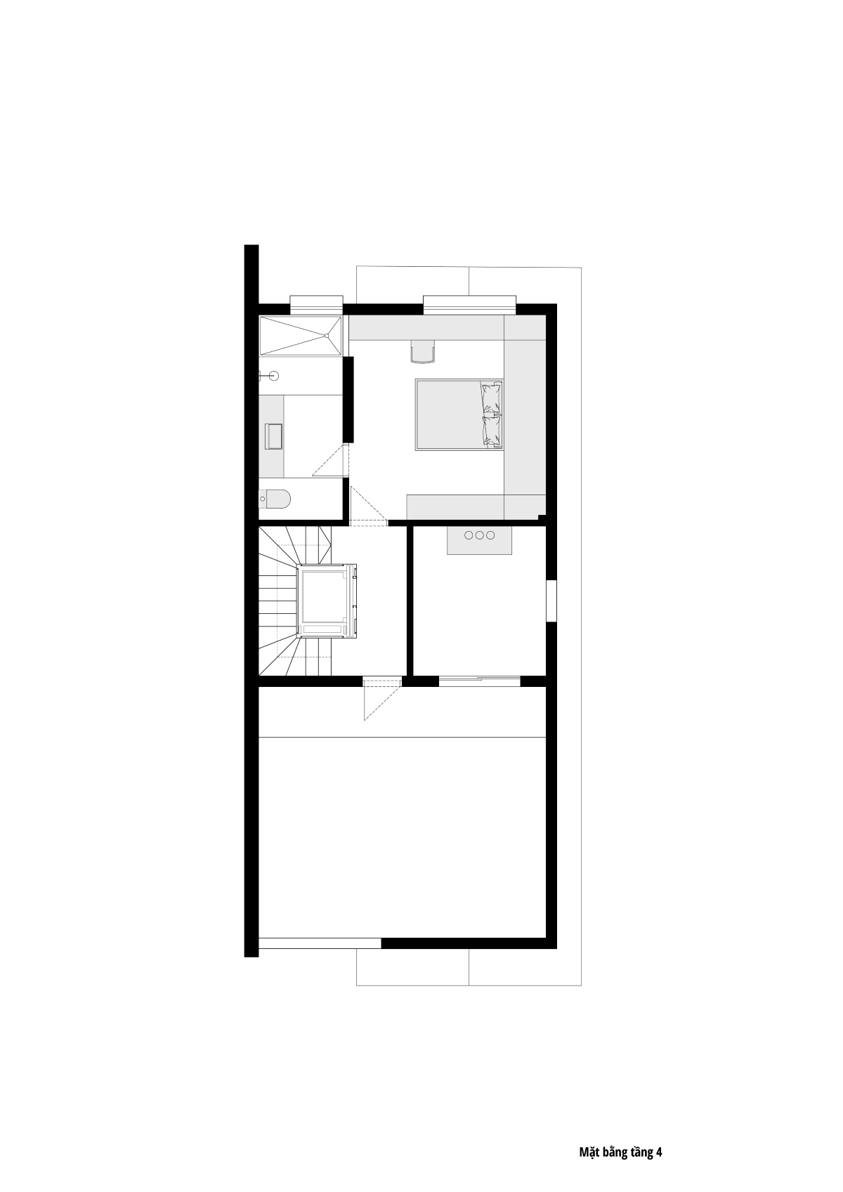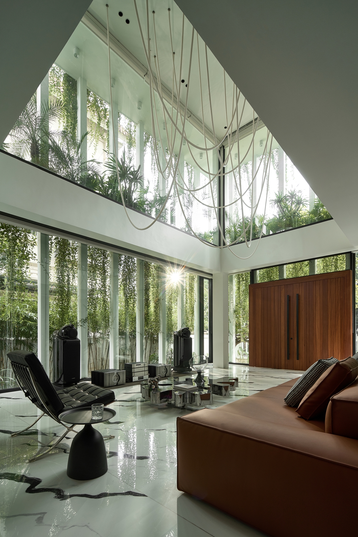 Gia chủ là người dành nhiều thời gian sinh hoạt ở nhà, do đó thiết kế muốn ưu tiên trải nghiệm tốt nhất cho khu vực chung là phòng khách và phòng bếp ăn. Trong đó khu bếp và phòng ăn được đập thông với vách cửa lùa lớn để view trọn con sông phía sau nhà. Phòng khách là điểm nhấn như một khối hộp độc lập cao theo chiều cao của 2 tầng nhà. Khoảng thông tầng được bọc bởi hệ lam kiến trúc thẳng đứng. Mặt tiếp xúc của hệ lam đứng quay về phía Bắc nên hạn chế được tối đa tia nắng mạnh rọi vào nhà. Hệ cây xanh được kết hợp cả cây đứng lẫn cây rũ, tối đa khả năng quan sát khi ngồi ở phòng khách. Ranh giới giữa trong nhà và ngoài nhà được tiêu biến nhờ hệ lam kiến trúc xen lẫn với hệ cây xanh.