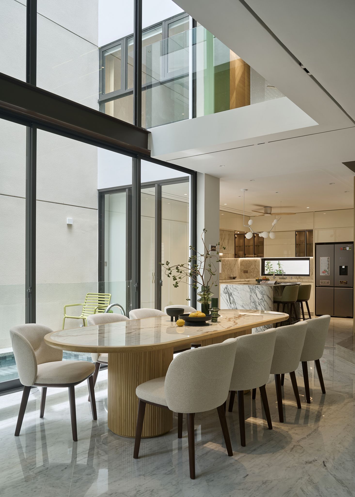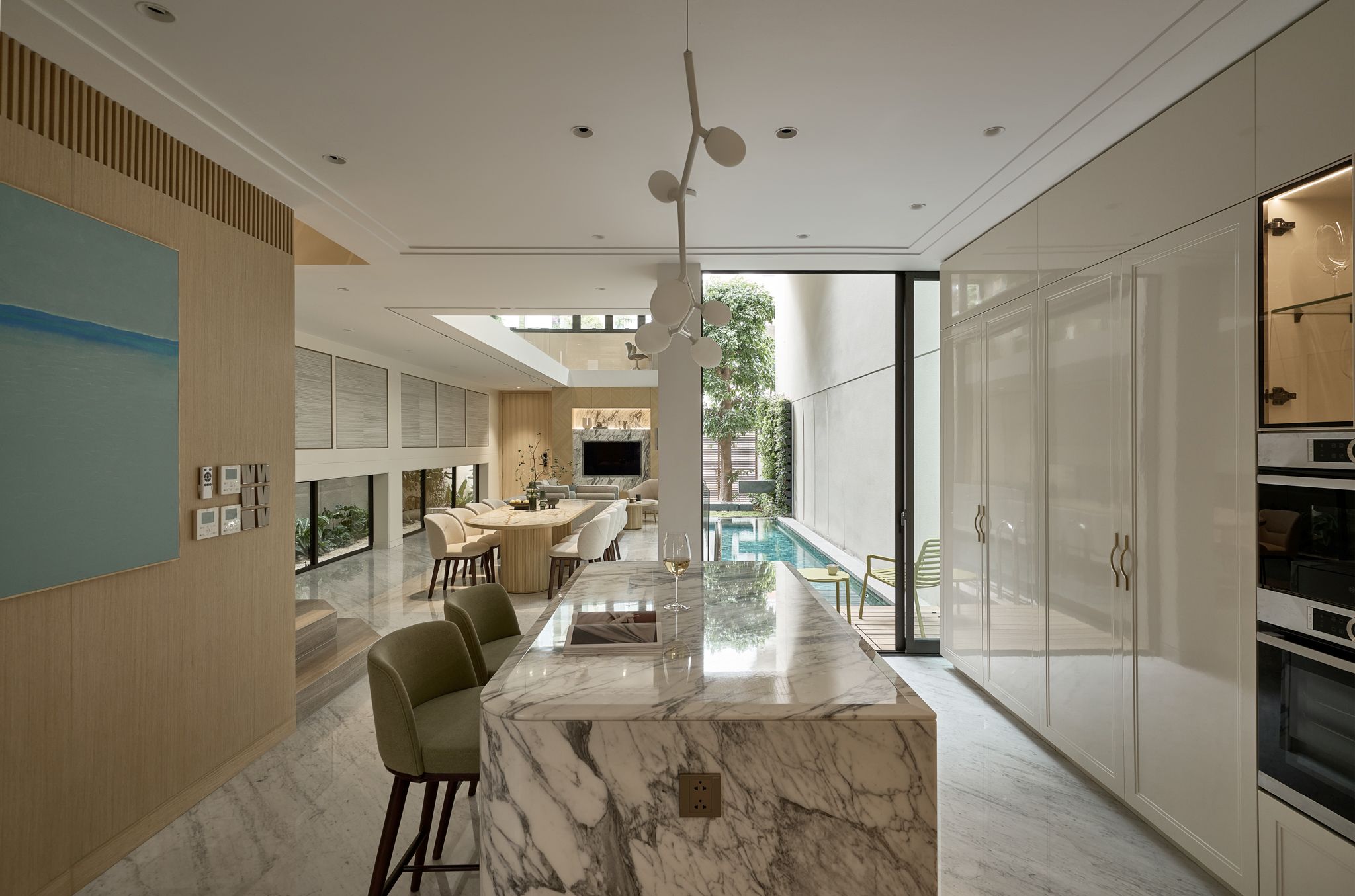 O9 Design Studio “đo ni đóng giày” mọi chi tiết cho nhu cầu trải nghiệm của gia chủ, kết hợp sự thoải mái ấm cúng với phong cách Modern Elegant. Tầng trệt thoáng đãng đón sáng với hệ vách kính trượt, xóa nhòa ranh giới giữa cảnh quan bên ngoài và không gian nội thất. Một hồ bơi muối khoáng màu xanh ngọc chảy từ phòng khách đến bếp. Âm thanh của nước nhẹ nhàng chữa lành, xóa đi những căng thẳng thường nhật, đem về sự bình yên.