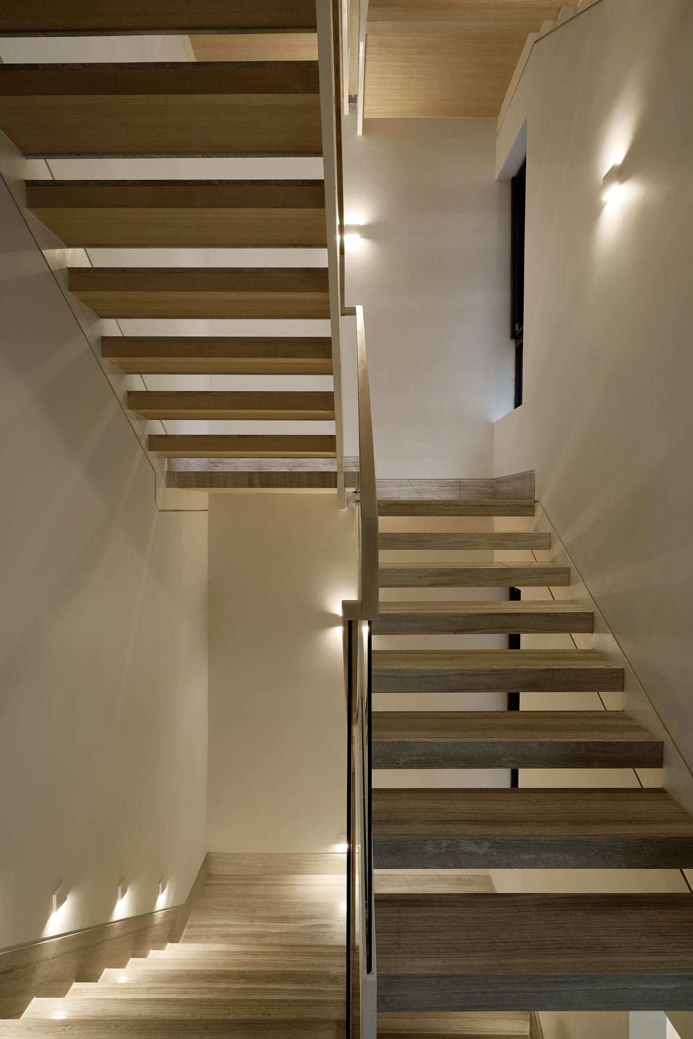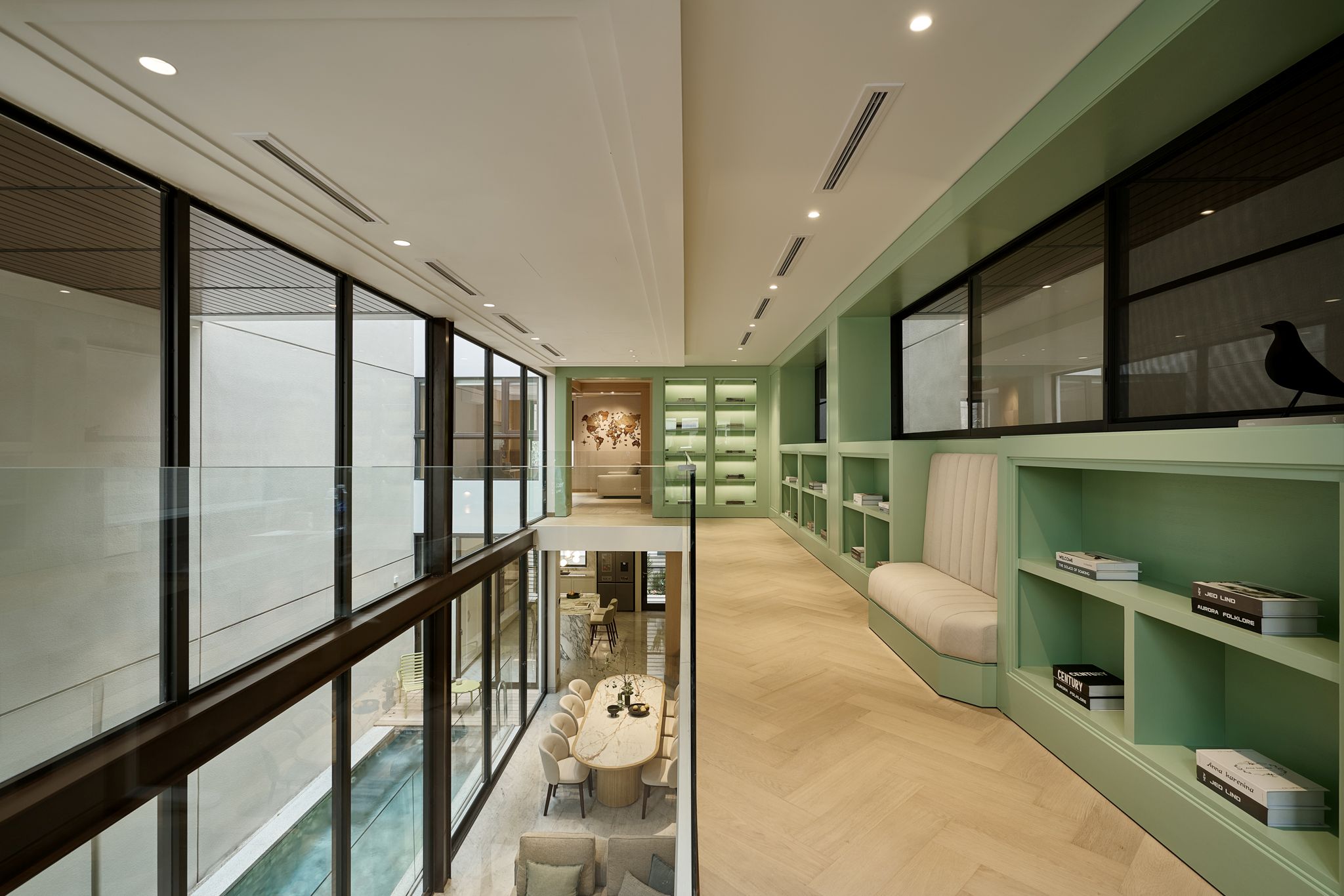 Ở tầng trên là một kệ sách xanh bạc hà uốn quanh khoảng thông tầng, tương phản với màu sàn gỗ ấm áp. Chiếc sofa dài bên cửa sổ tạo nên một góc đọc sách tĩnh lặng với tầm nhìn ra hồ bơi và sân vườn. Phòng sinh hoạt chung có thể linh hoạt chuyển đổi công năng – từ phòng nghe nhạc, chiếu phim trở thành phòng ngủ lại cho khách khi cần với chiếc sofa bed rộng rãi, gập mở tiện dụng.