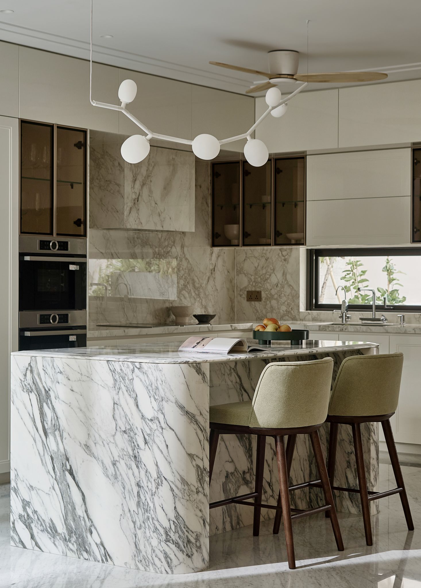 Trái tim ngôi nhà là gian bếp rộng rãi, đầy đủ tiện nghi, nổi bật với đảo bếp bằng đá cẩm thạch Arabescato – vừa là tác phẩm điêu khắc vừa là không gian gắn kết gia đình, bên dưới chiếc đèn chùm tỏa ánh sáng ấm áp trên mặt đá.