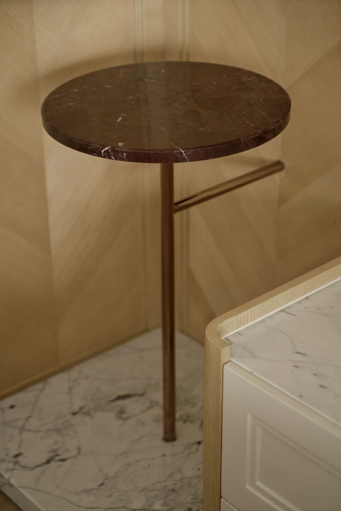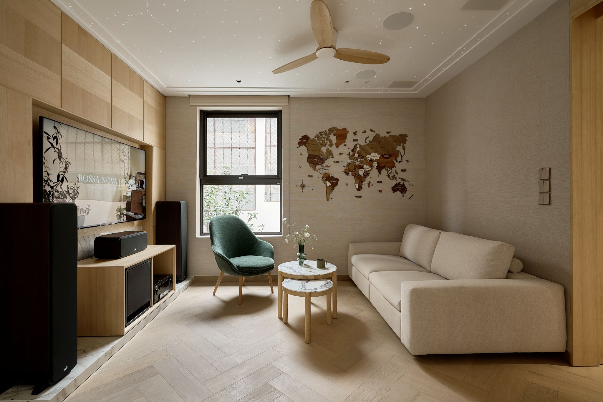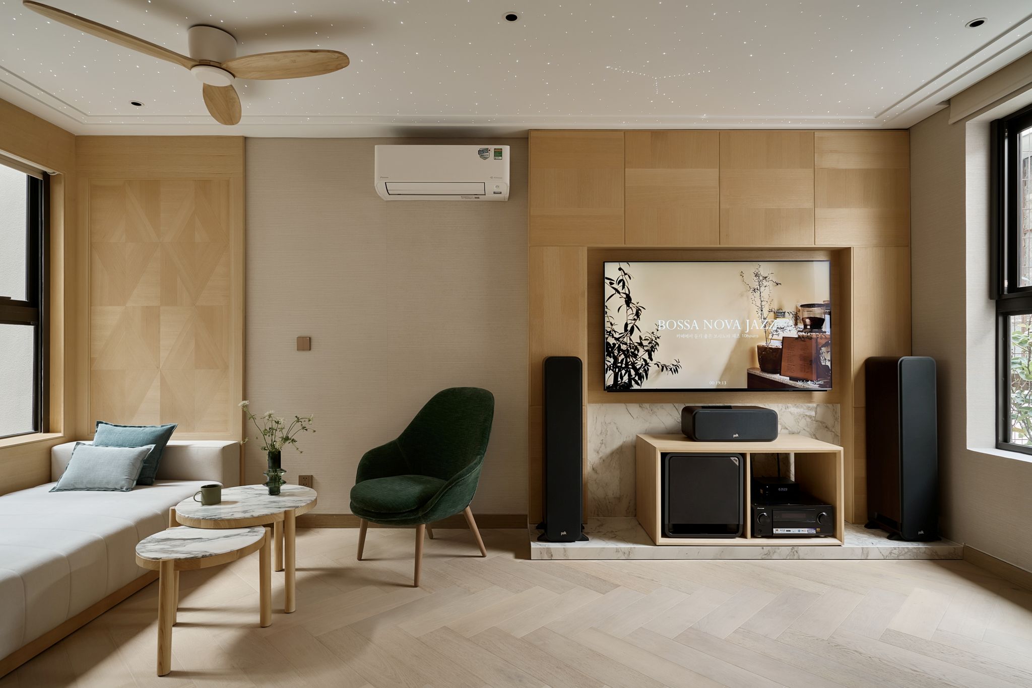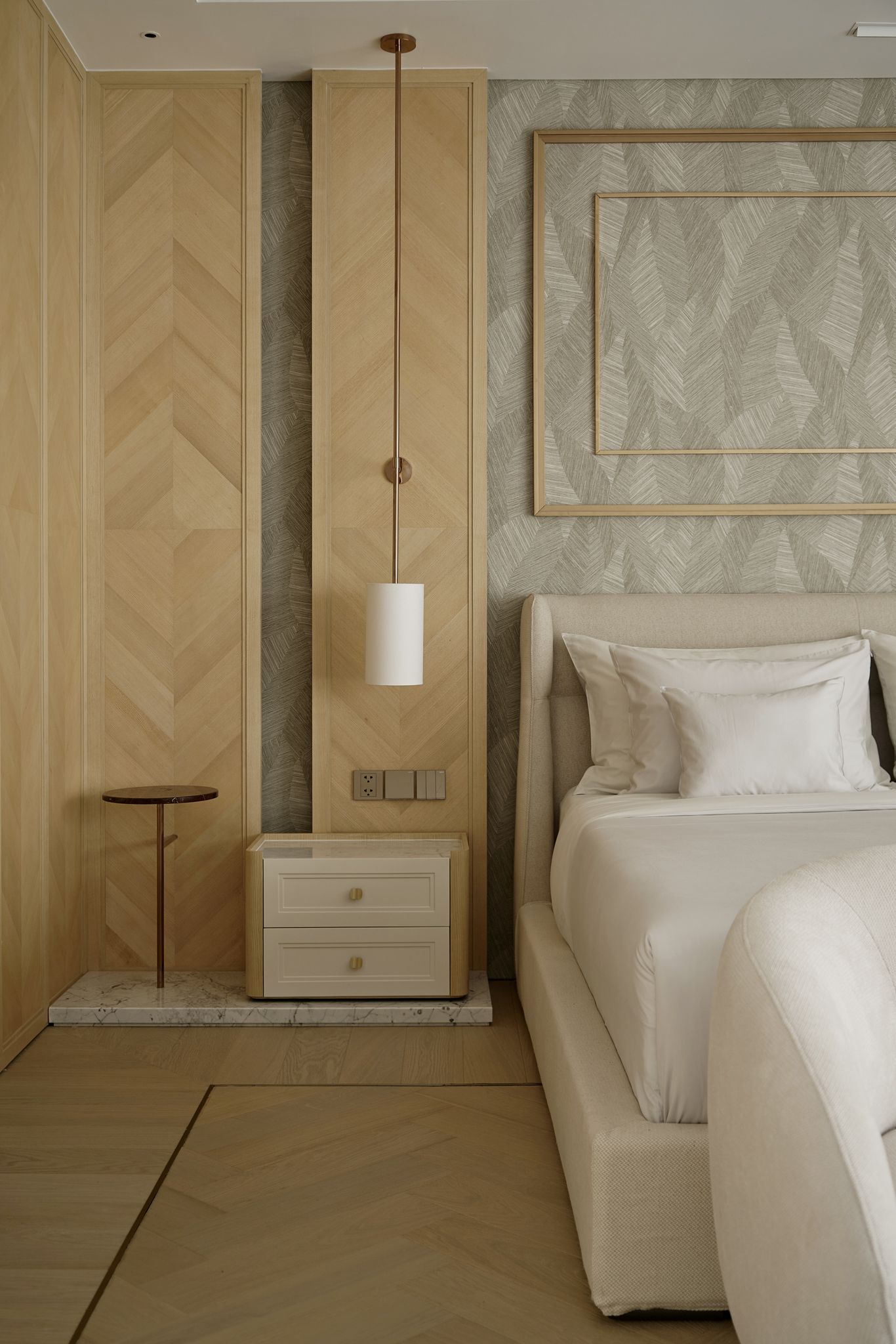Bảng vật liệu của Casa Candy là sự cân bằng giữa sự sang trọng và tính bền vững. Sàn gỗ sồi lát kiểu xương cá kết hợp với đồ gỗ chạm khắc thủ công lấy cảm hứng từ phong cách Art Deco tạo nên chiều sâu cho không gian. Dầu gốc nước giúp giữ được vẻ ấm áp tự nhiên của gỗ tần bì mà không chứa hợp chất VOC độc hại. Các vật liệu được lựa chọn để trường tồn theo thời gian, đảm bảo độ bền lâu dài và giảm thiểu tác động môi trường.