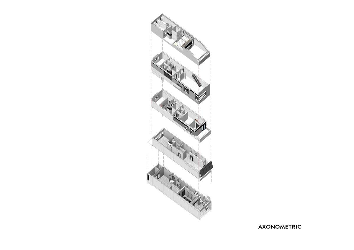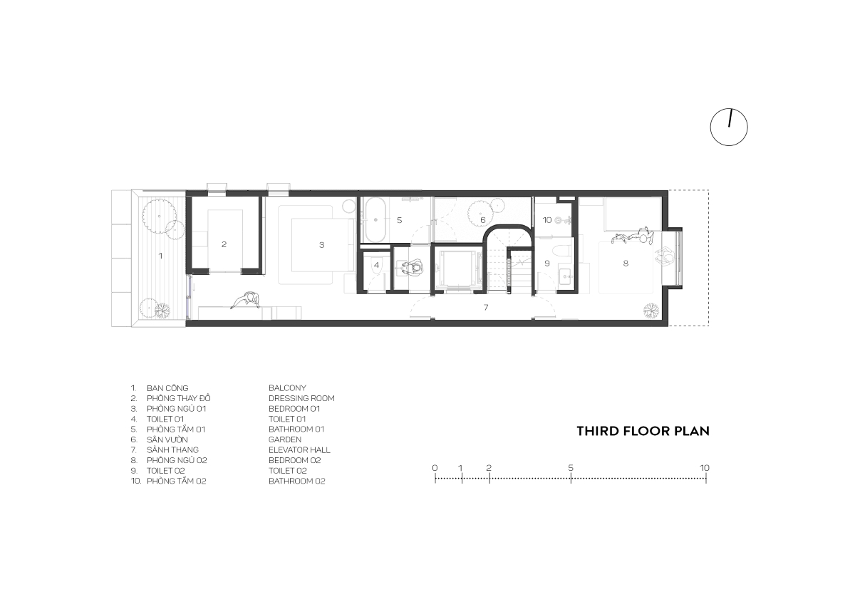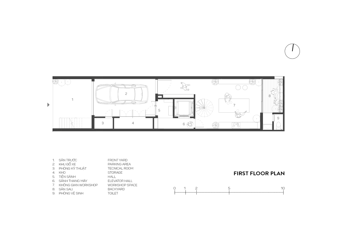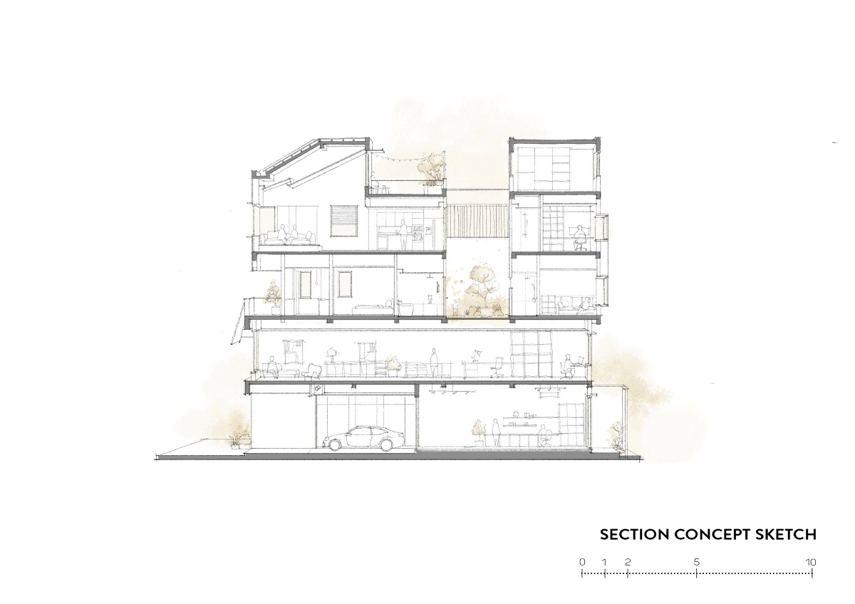 Xuất phát từ bối cảnh đô thị Việt Nam, khu đất mang đặc trưng điển hình của nhà ống với hình dáng chữ nhật kéo dài theo chiều sâu. Đặc điểm này đặt ra yêu cầu tổ chức không gian theo trục đứng, đồng thời cần một giải pháp bố trí hợp lý để đảm bảo sự liên kết thị giác, thông gió, chiếu sáng tự nhiên và trải nghiệm sống liền mạch giữa các tầng.