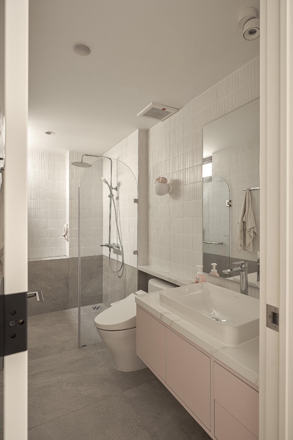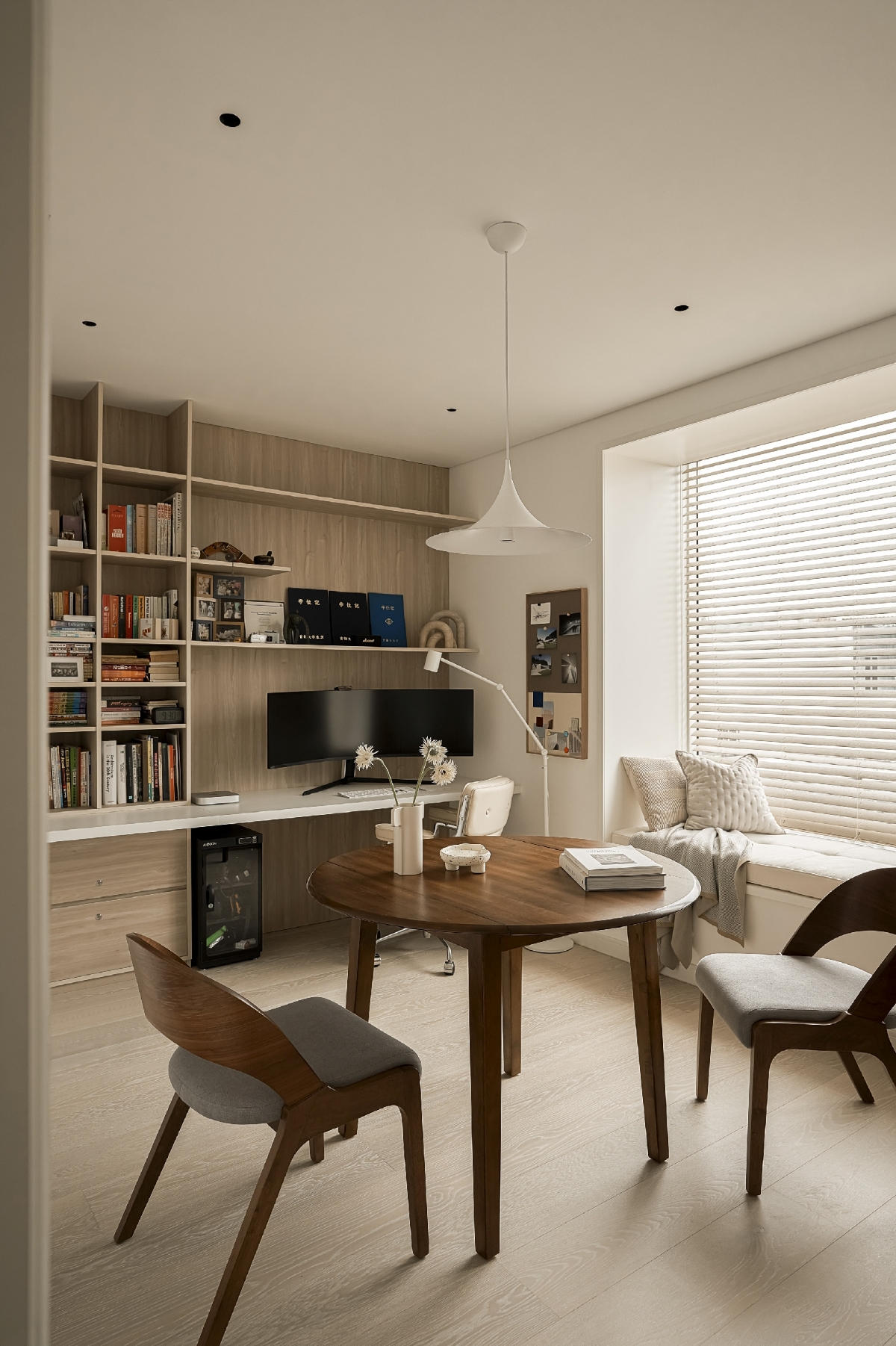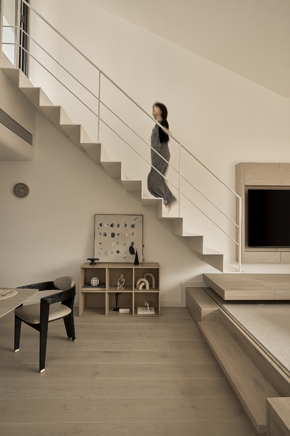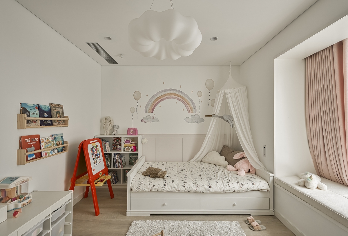 Bên cạnh không gian chung, ngôi nhà vẫn đảm bảo những khoảng riêng tư cần thiết cho từng thành viên. Người bố có góc làm việc yên tĩnh, tràn ngập ánh sáng tự nhiên để tập trung giải quyết công việc. Người mẹ sở hữu không gian workshop rộng rãi trải dài ở tầng 1 và tầng 2, phục vụ cho các hoạt động thủ công và sáng tạo. Trong khi đó, phòng ngủ của bé gái được thiết kế như một thế giới riêng đầy mơ mộng, với khung cửa sổ lớn – nơi khơi gợi trí tưởng tượng và nuôi dưỡng sự sáng tạo.