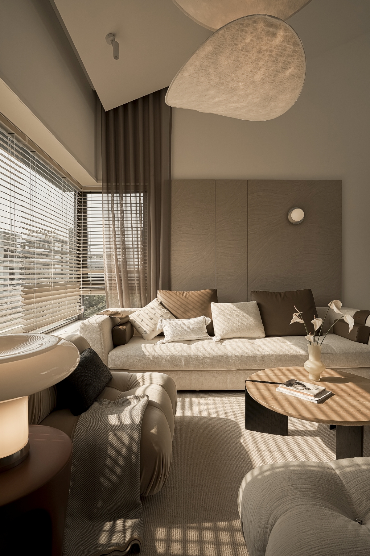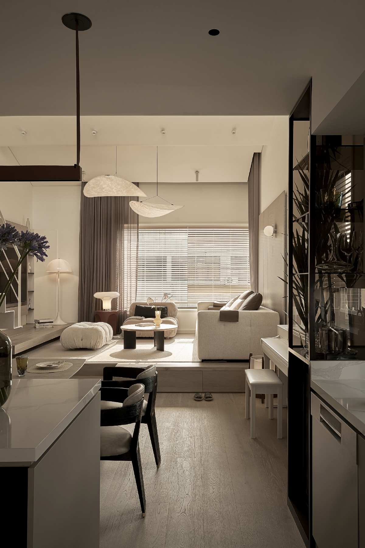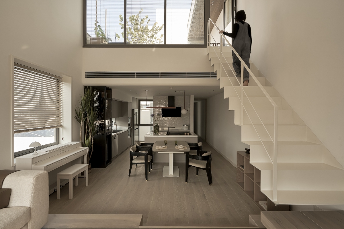 Với concept đề cao sự tương tác trong đời sống thường nhật, giải pháp mặt cắt thông tầng tại khu vực phòng khách đóng vai trò như “trái tim” của ngôi nhà. Tại đây, các thành viên có thể nhìn thấy, lắng nghe và cảm nhận sự hiện diện của nhau dù đang ở những không gian khác nhau. Từ phòng khách, tầm nhìn mở rộng về khu bếp, khoảng xanh sân vườn và cả không gian sân thượng, tạo nên một dòng chảy sinh hoạt liên tục và giàu cảm xúc.