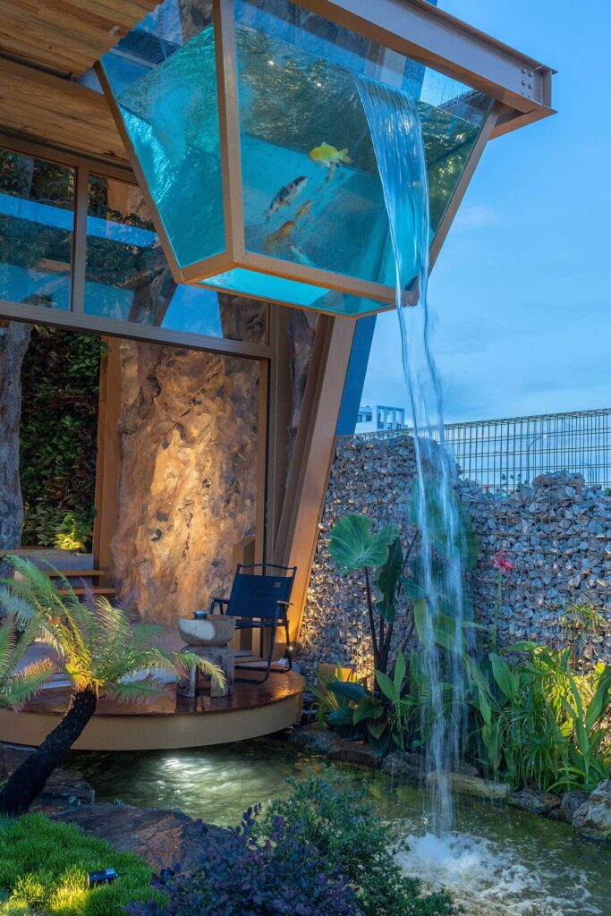 Các khoảng thông tầng lớn đóng vai trò như “lá phổi” của ngôi nhà, giúp không khí nóng có đường thoát lên cao và hỗ trợ dòng đối lưu tự nhiên. Cây xanh được bố trí xen kẽ ở nhiều lớp không gian để tạo bóng mát, làm mềm vi khí hậu và giảm bức xạ nhiệt lên bề mặt công trình. Mặt nước của hồ cá góp phần làm dịu nhiệt độ cục bộ, tăng cảm giác thư giãn và bổ sung độ ẩm phù hợp trong điều kiện khí hậu nóng.