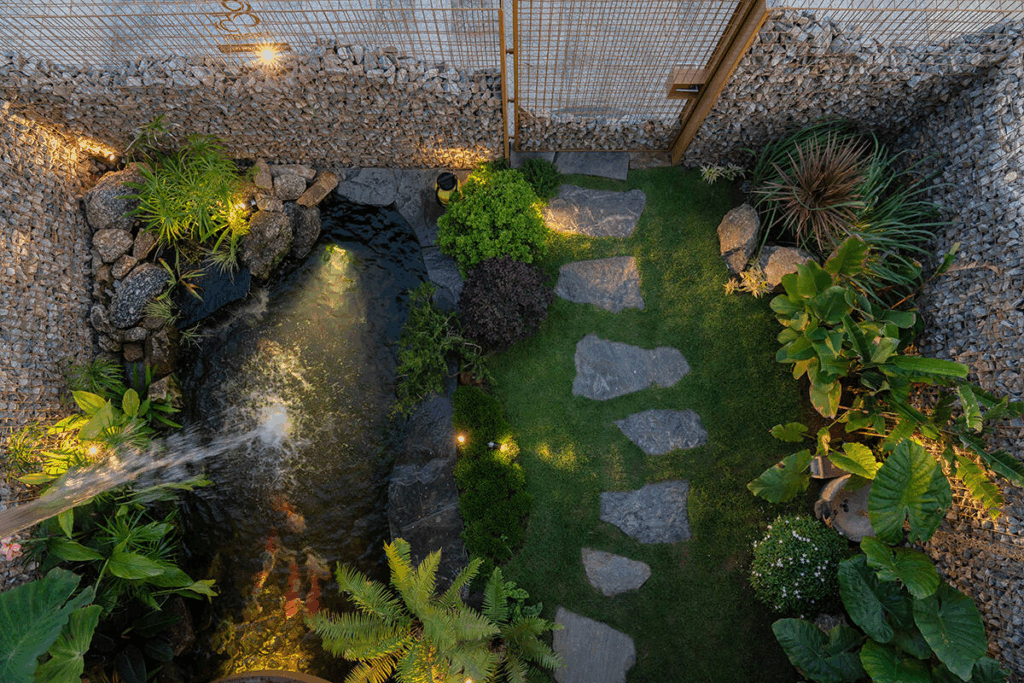 PV: Ga.o House có một hệ sinh thái khá thú vị với hồ cá, vườn cây, hệ thống thu nước mưa và các khoảng thông tầng lớn. Anh có thể chia sẻ cách những yếu tố này được kết nối để tạo nên một vòng tuần hoàn vi khí hậu cho công trình?
