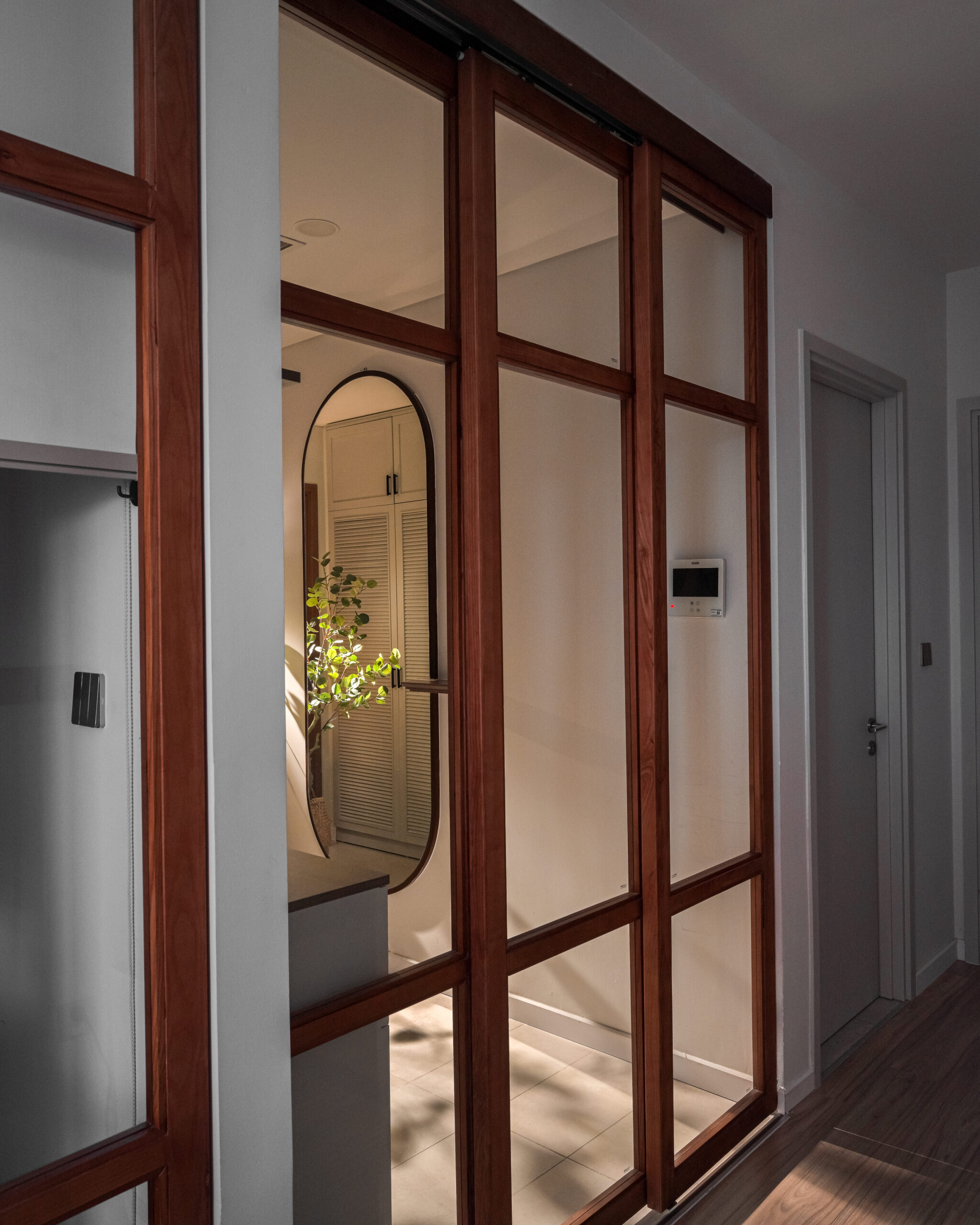Hành lang với khu vực mang giày ngăn cách với phần còn lại của ngôi nhà theo cách bố trí thường thấy của các căn nhà Hàn Quốc. Công dụng ngăn cách bụi, tiếng ồn và những bộn bề sau lớp cửa.