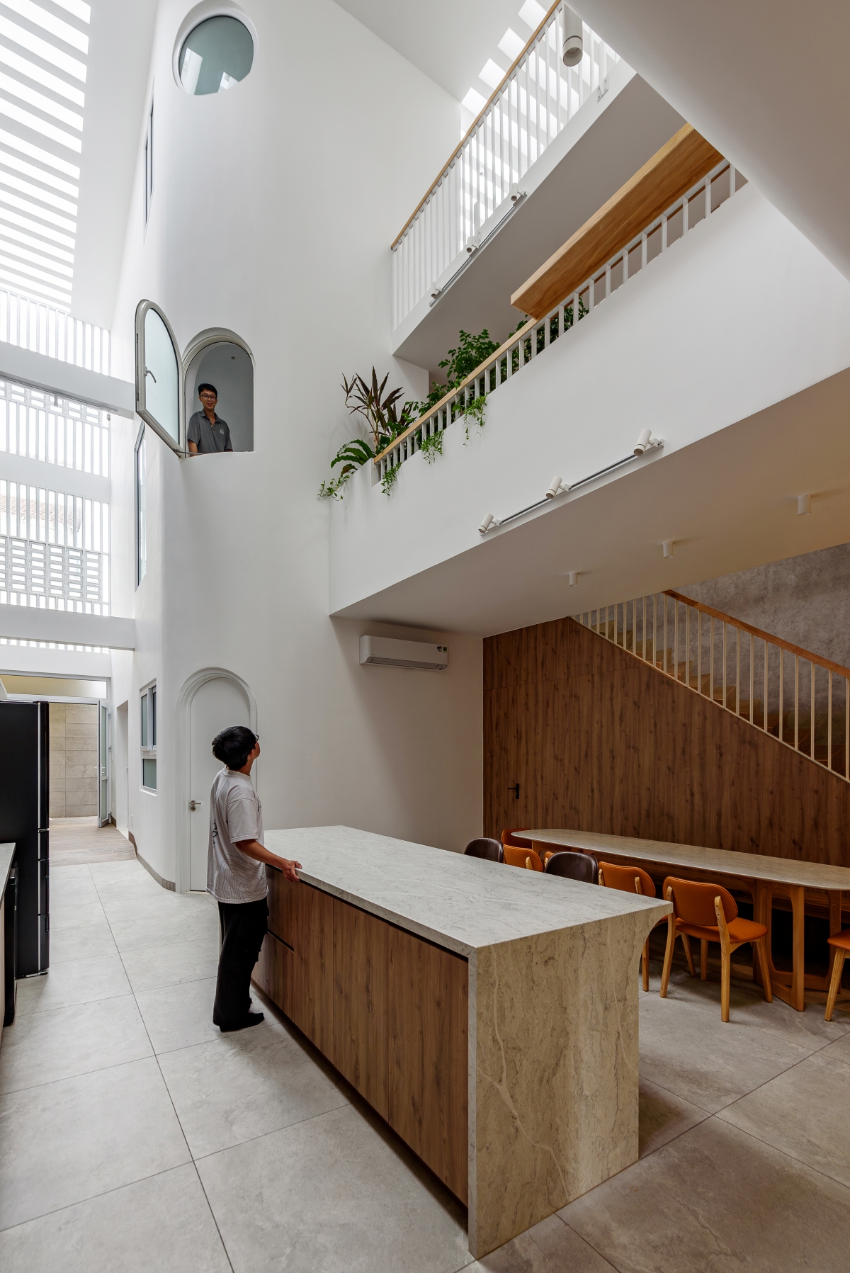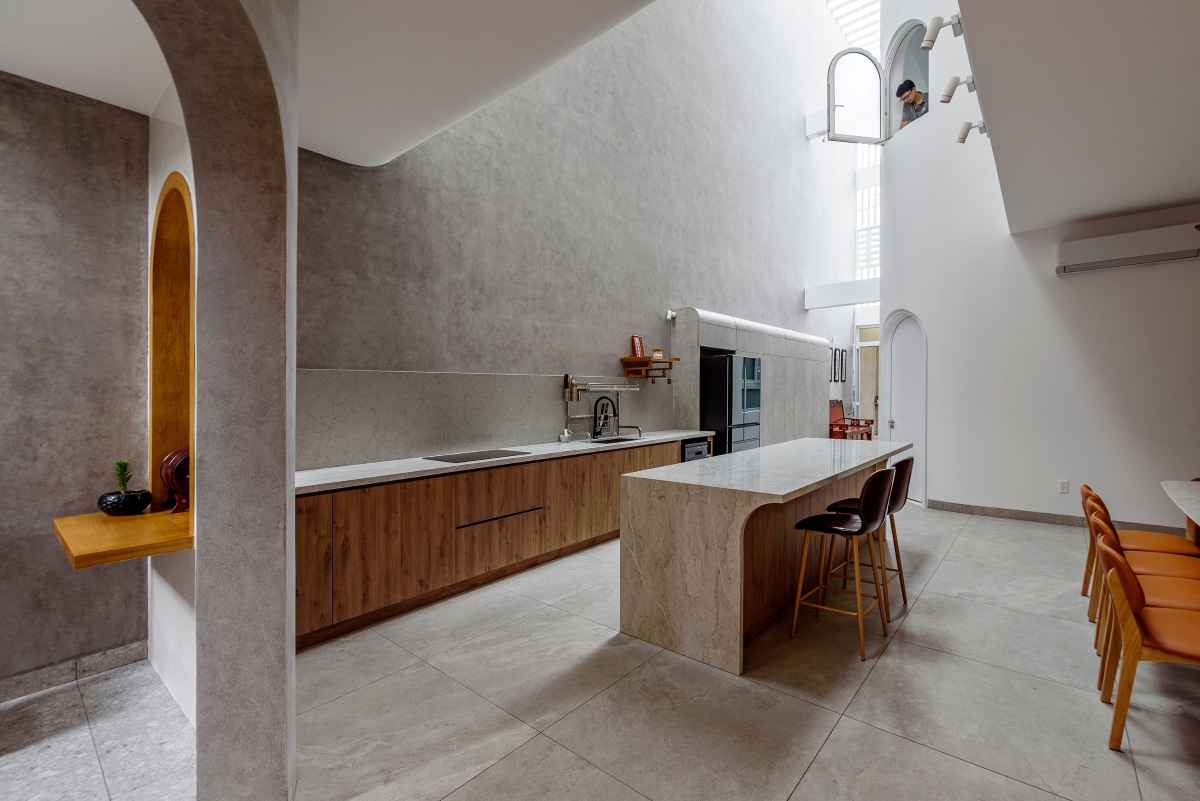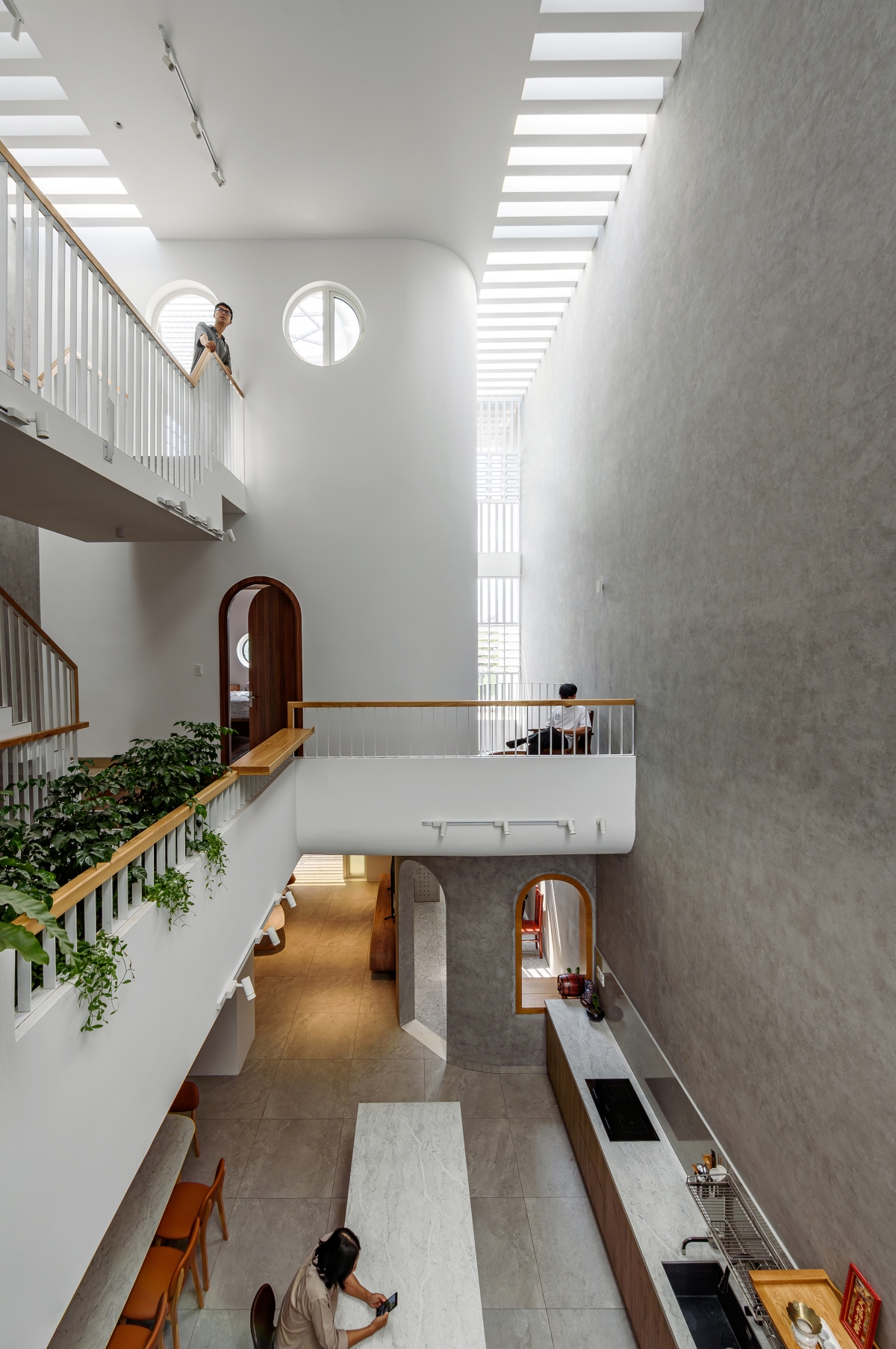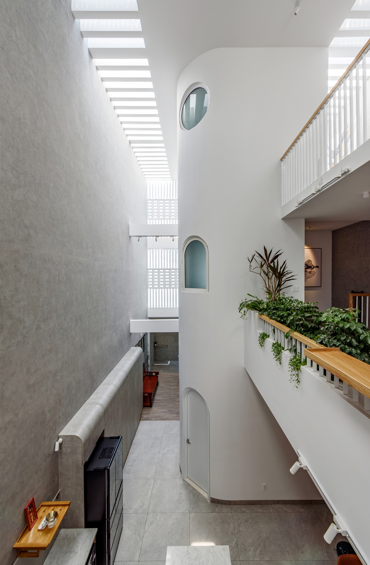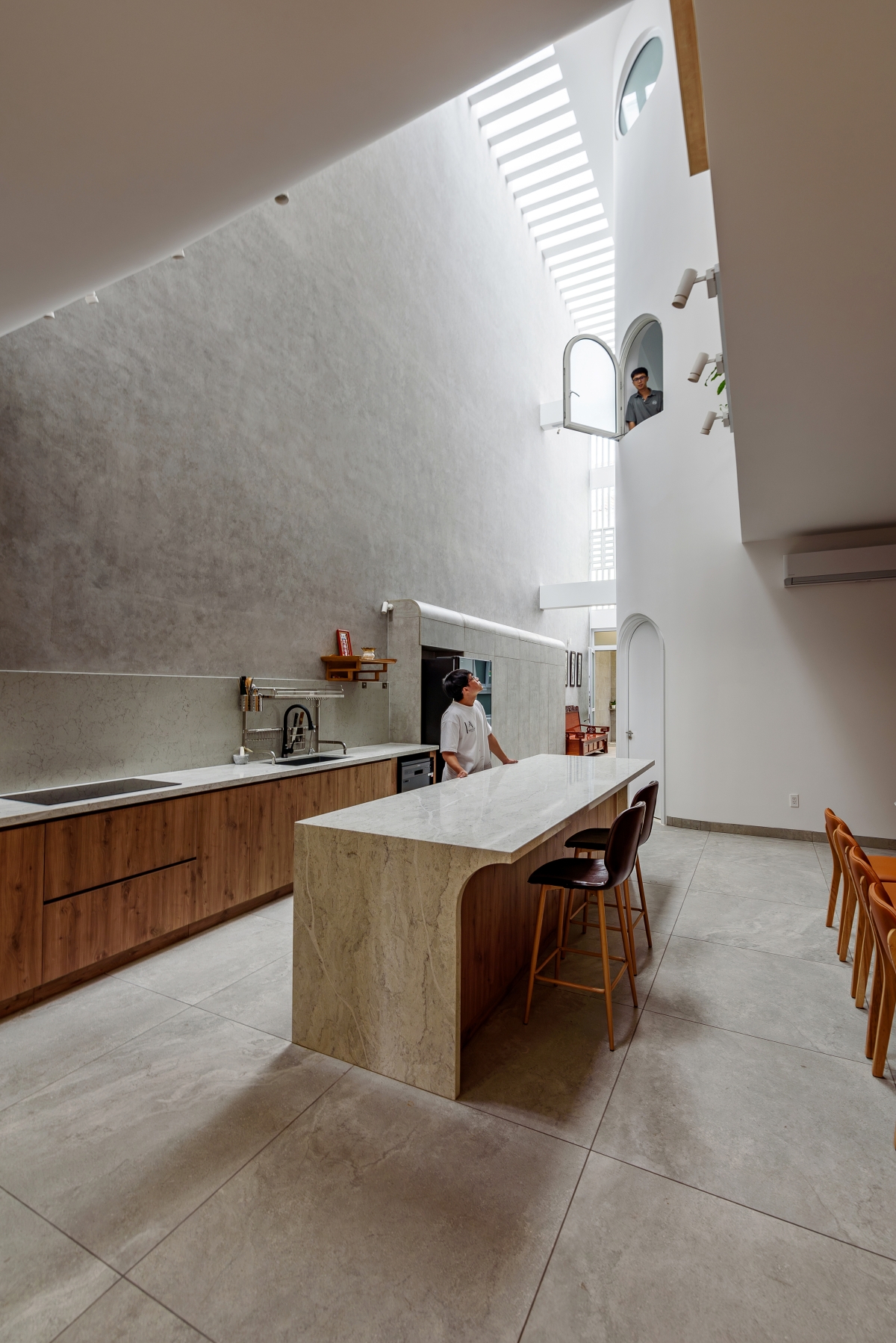 Hệ thống khe sáng này còn đóng vai trò quan trọng trong thông gió tự nhiên, với các cửa lá xếp được bố trí linh hoạt ở hai đầu, cho phép điều chỉnh dòng khí lưu thông trong nhà. Nhờ vậy, ngôi nhà luôn duy trì được sự mát mẻ, thoáng đãng mà không phụ thuộc vào điều hòa nhân tạo – một giải pháp vừa hiệu quả, vừa bền vững.