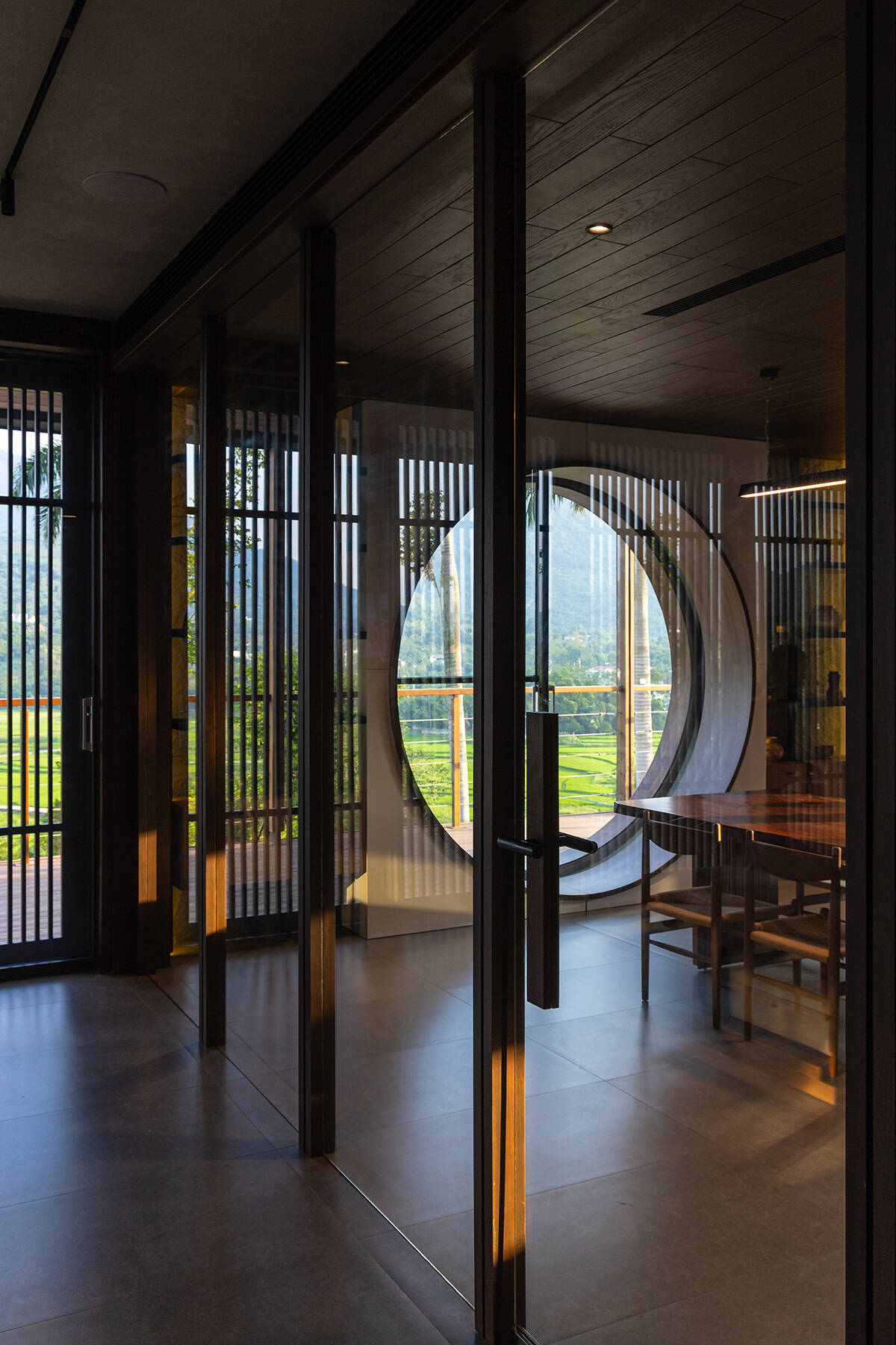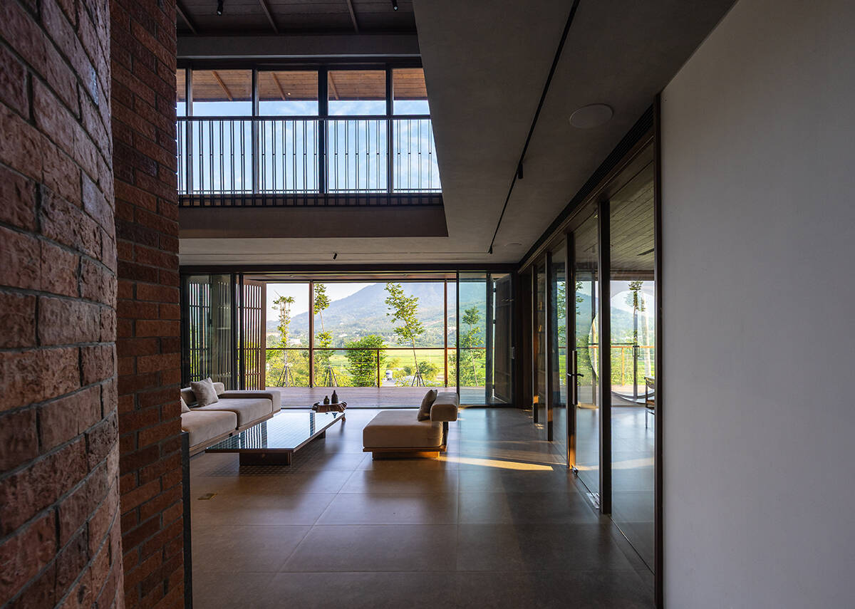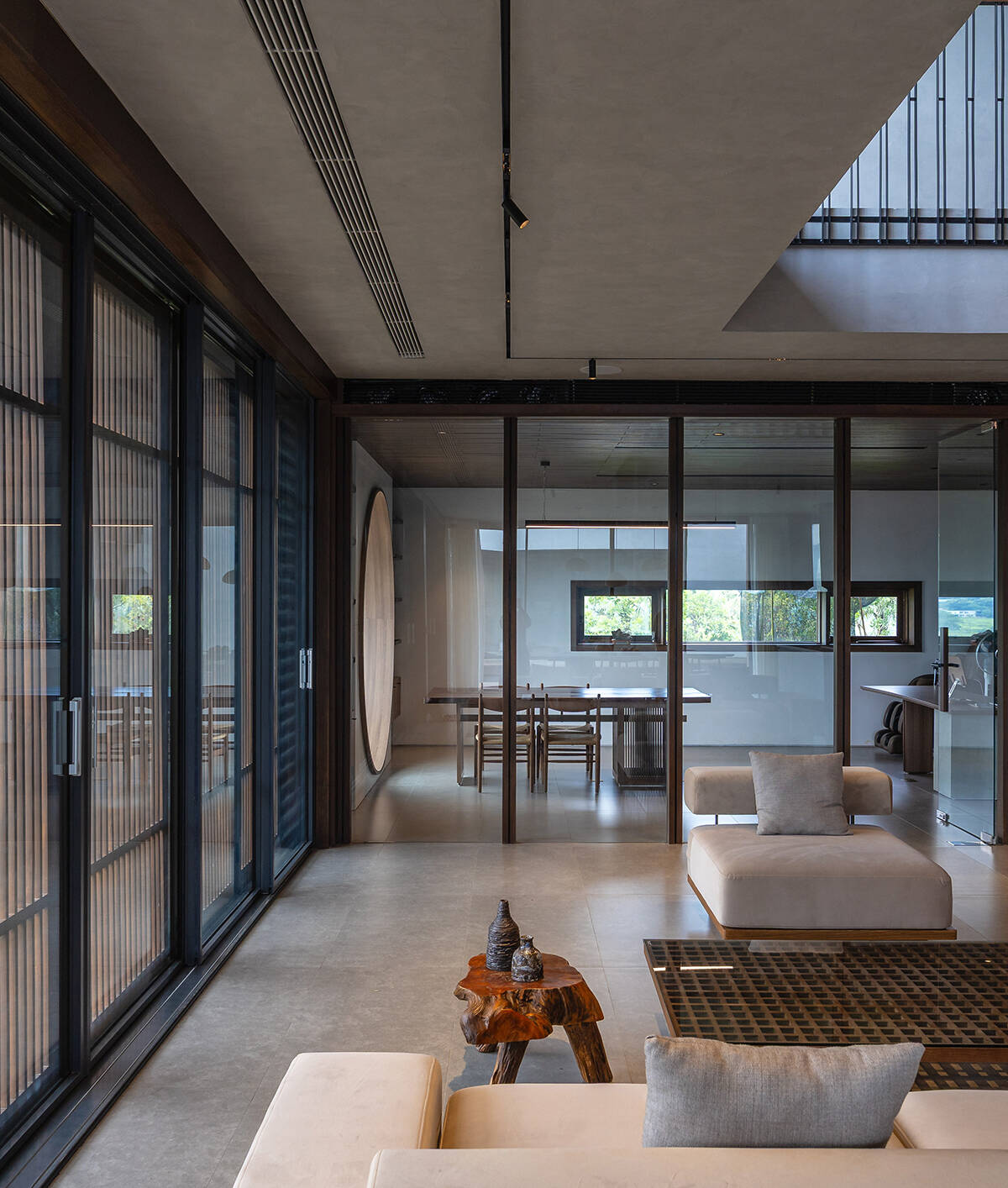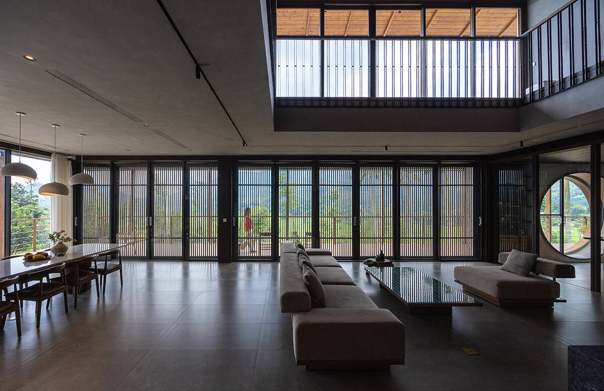 Trên nền một cấu trúc đã có sẵn, nhóm thiết kế của PAK Architects lựa chọn tiếp cận bằng phương pháp “tái thiết lập mối quan hệ giữa con người và cảnh quan”. Nhờ lợi thế địa hình trên cao, công trình được mở rộng tối đa tầm nhìn thông qua những mảng kính lớn chạy dọc mặt đứng. Tuy vậy, hệ mái hiên bao quanh cùng lớp cửa kép tích hợp lam chắn nắng đóng, mở linh hoạt sẽ giúp kiểm soát vi khí hậu, tạo lớp đệm chuyển tiếp nhẹ nhàng giữa nội thất và môi trường tự nhiên. Khi khép lại, ánh sáng lọt qua hệ lam gợi lên những lớp bóng đổ giàu tính thi vị; khi mở ra, ranh giới không gian gần như biến mất, để kiến trúc tan vào cảnh quan.
