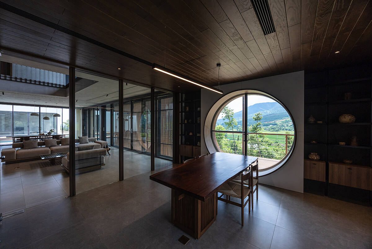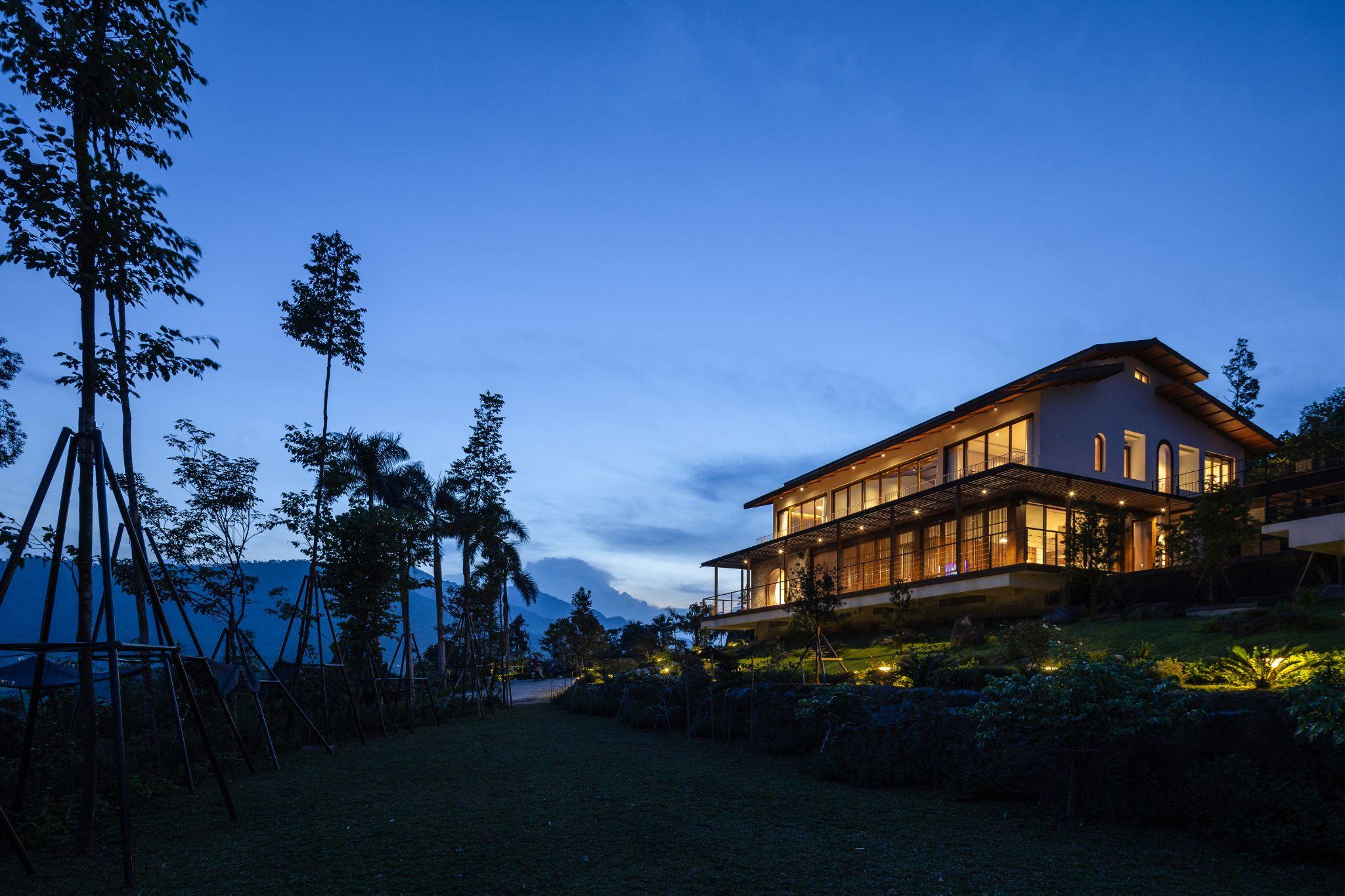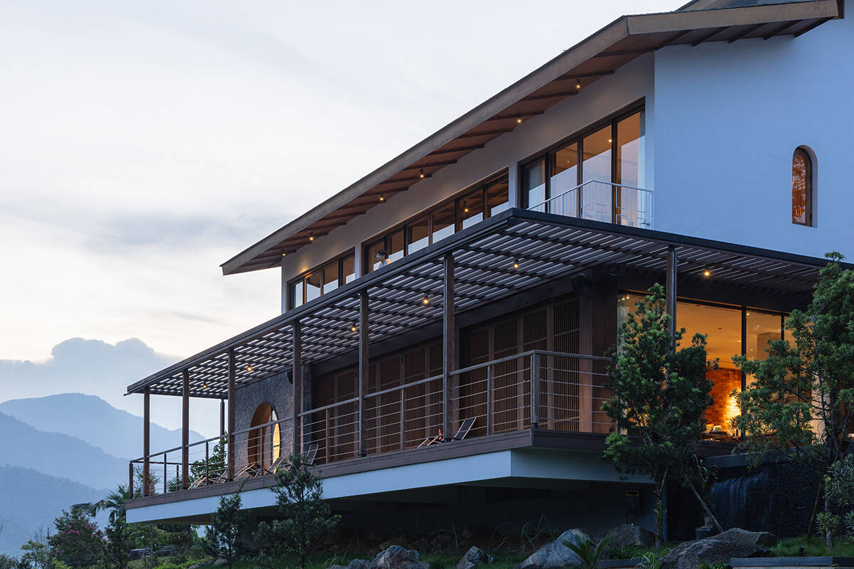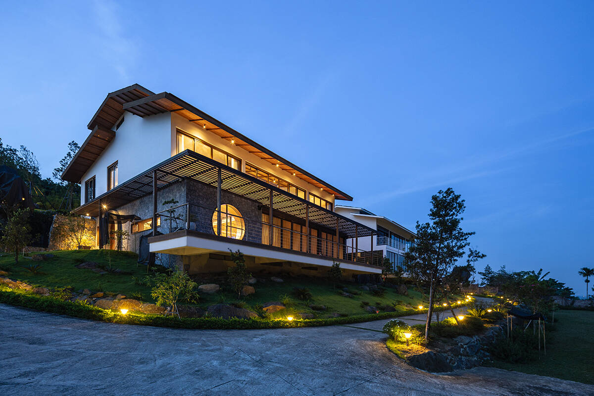 Trên nền một cấu trúc đã có sẵn, nhóm thiết kế của PAK Architects lựa chọn tiếp cận bằng phương pháp “tái thiết lập mối quan hệ giữa con người và cảnh quan”. Nhờ lợi thế địa hình trên cao, công trình được mở rộng tối đa tầm nhìn thông qua những mảng kính lớn chạy dọc mặt đứng. Tuy vậy, hệ mái hiên bao quanh cùng lớp cửa kép tích hợp lam chắn nắng đóng, mở linh hoạt sẽ giúp kiểm soát vi khí hậu, tạo lớp đệm chuyển tiếp nhẹ nhàng giữa nội thất và môi trường tự nhiên. Khi khép lại, ánh sáng lọt qua hệ lam gợi lên những lớp bóng đổ giàu tính thi vị; khi mở ra, ranh giới không gian gần như biến mất, để kiến trúc tan vào cảnh quan.