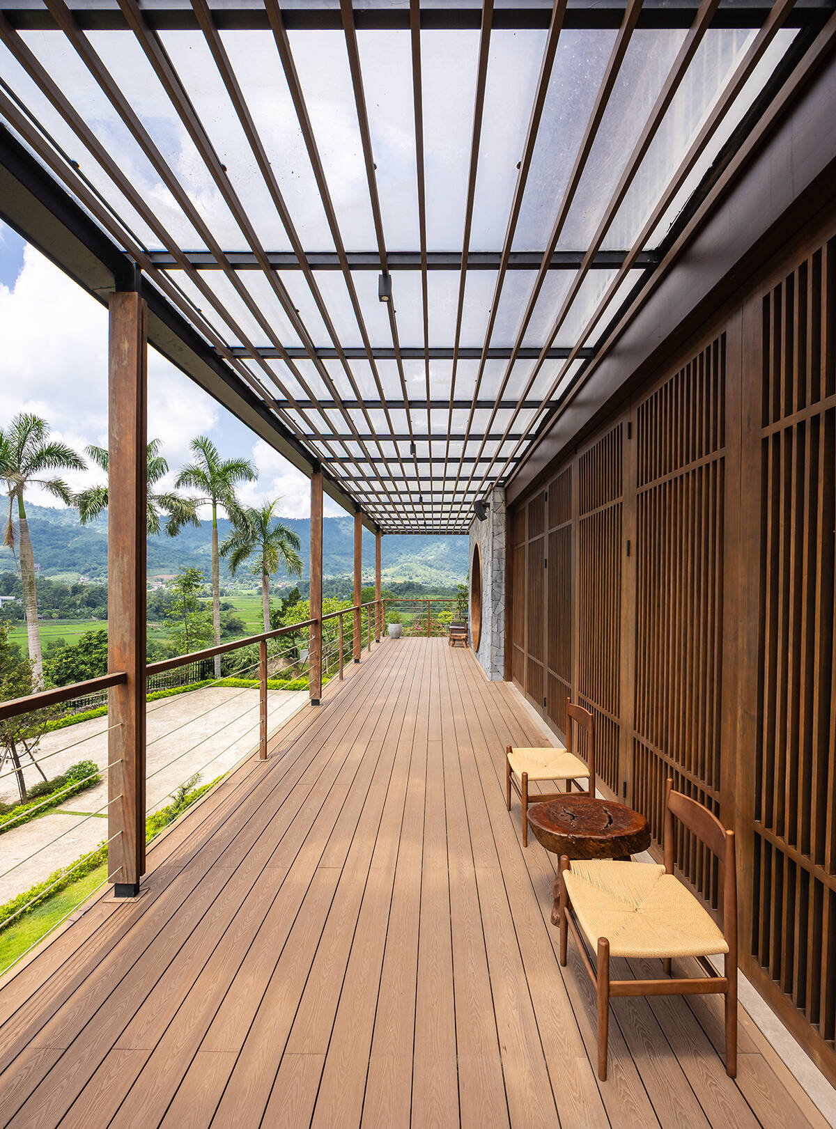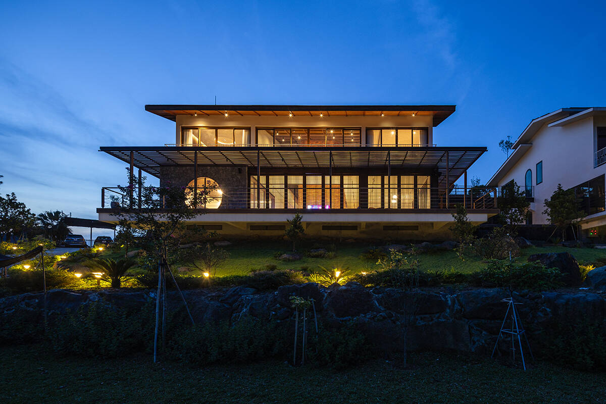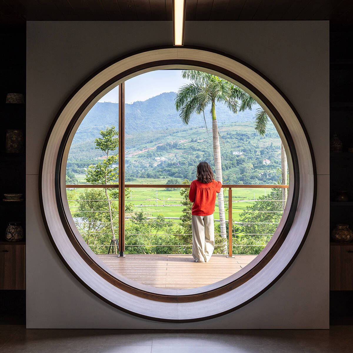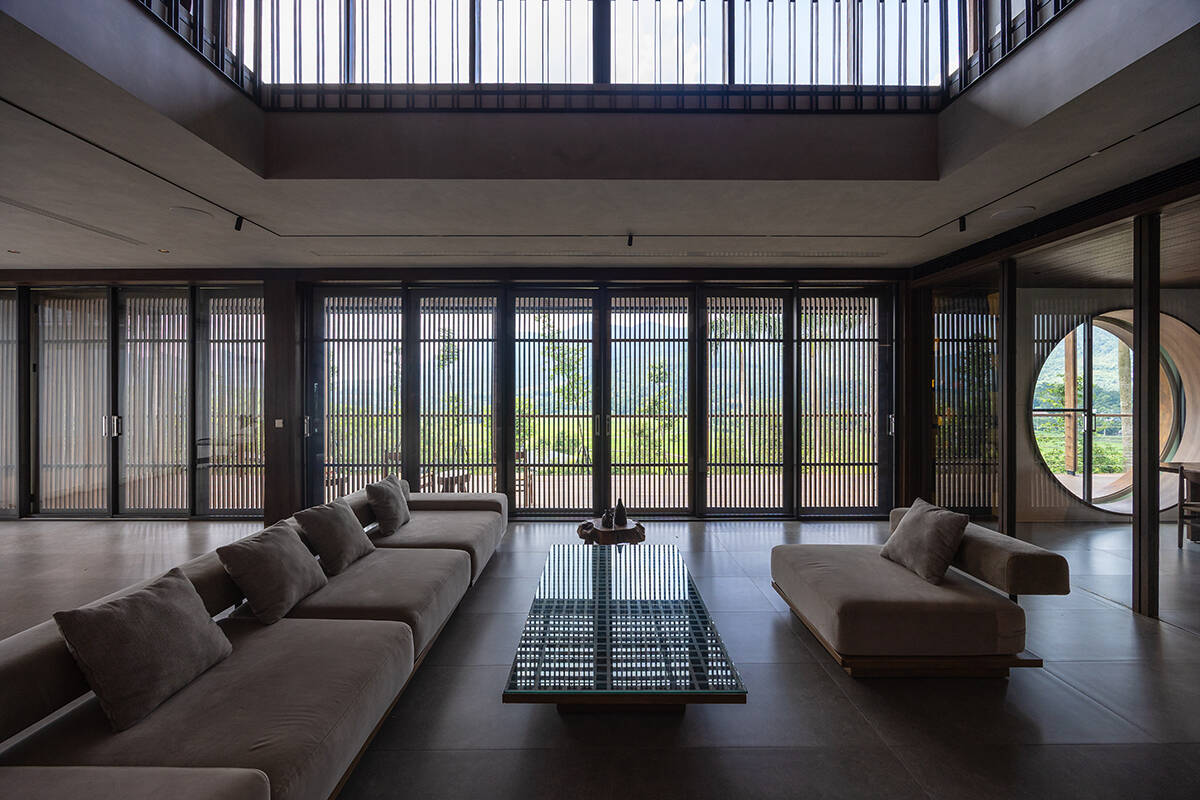 Trên nền một cấu trúc đã có sẵn, nhóm thiết kế của PAK Architects lựa chọn tiếp cận bằng phương pháp “tái thiết lập mối quan hệ giữa con người và cảnh quan”. Nhờ lợi thế địa hình trên cao, công trình được mở rộng tối đa tầm nhìn thông qua những mảng kính lớn chạy dọc mặt đứng. Tuy vậy, hệ mái hiên bao quanh cùng lớp cửa kép tích hợp lam chắn nắng đóng, mở linh hoạt sẽ giúp kiểm soát vi khí hậu, tạo lớp đệm chuyển tiếp nhẹ nhàng giữa nội thất và môi trường tự nhiên. Khi khép lại, ánh sáng lọt qua hệ lam gợi lên những lớp bóng đổ giàu tính thi vị; khi mở ra, ranh giới không gian gần như biến mất, để kiến trúc tan vào cảnh quan.
