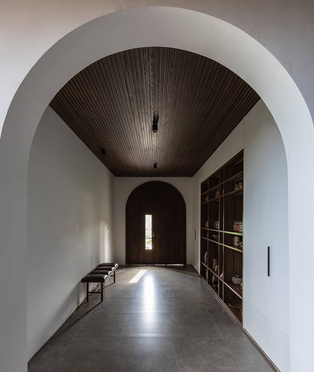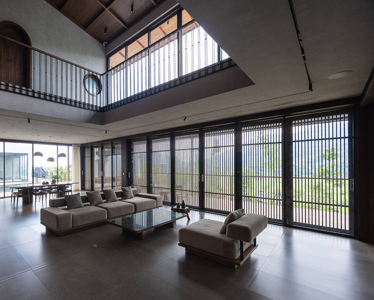 Bước vào bên trong, không gian được tổ chức quanh một khoảng thông tầng lớn, đây cũng là “trục giao thông và trục kết nối” của ngôi nhà. Tuyến di chuyển bao quanh khoảng rỗng này cho phép các thành viên gia đình tương tác trực quan trong khi vẫn đảm bảo sự riêng tư cho từng khối chức năng. Nhóm thiết kế khai thác các yếu tố đặc trưng của kiến trúc truyền thống Việt như mái chéo, hiên rộng, kèo gỗ, các khoảng đệm và tiền sảnh, nhưng đưa chúng vào một tinh thần tối giản, đương đại hơn. Những chi tiết này không chỉ giải quyết công năng mà còn được dùng như chất liệu cảm xúc, nơi ký ức và bản sắc văn hoá được tái hiện.