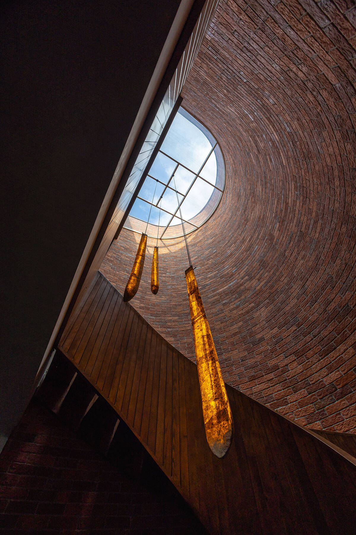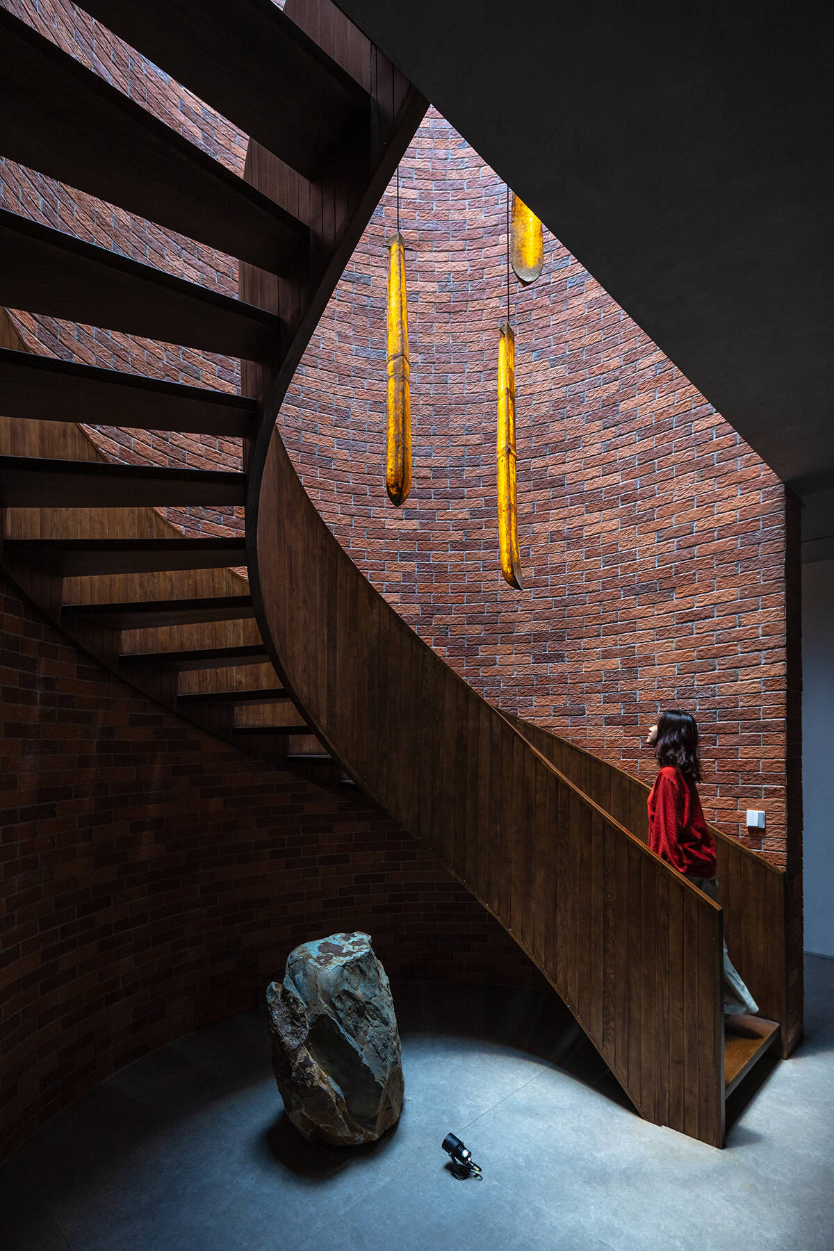 Đặc biệt, cấu trúc cầu thang kết hợp giếng trời là điểm nhấn cảm xúc của toàn bộ công trình. Lấy cảm hứng từ hình ảnh “lò gạch” trong câu chuyện gia chủ chia sẻ, nhóm thiết kế tạo nên một không gian thẳng đứng nơi ánh sáng, chuyển động con người và thời gian được nhìn thấy rõ rệt qua từng bậc thang. Đây chính là “trục tự sự” của DongBen Mansion, một hành trình ký ức được chuyển hóa thành kiến trúc.