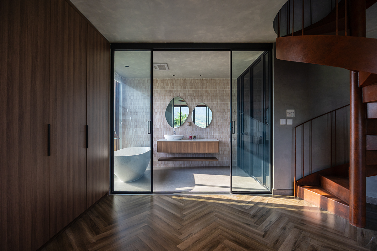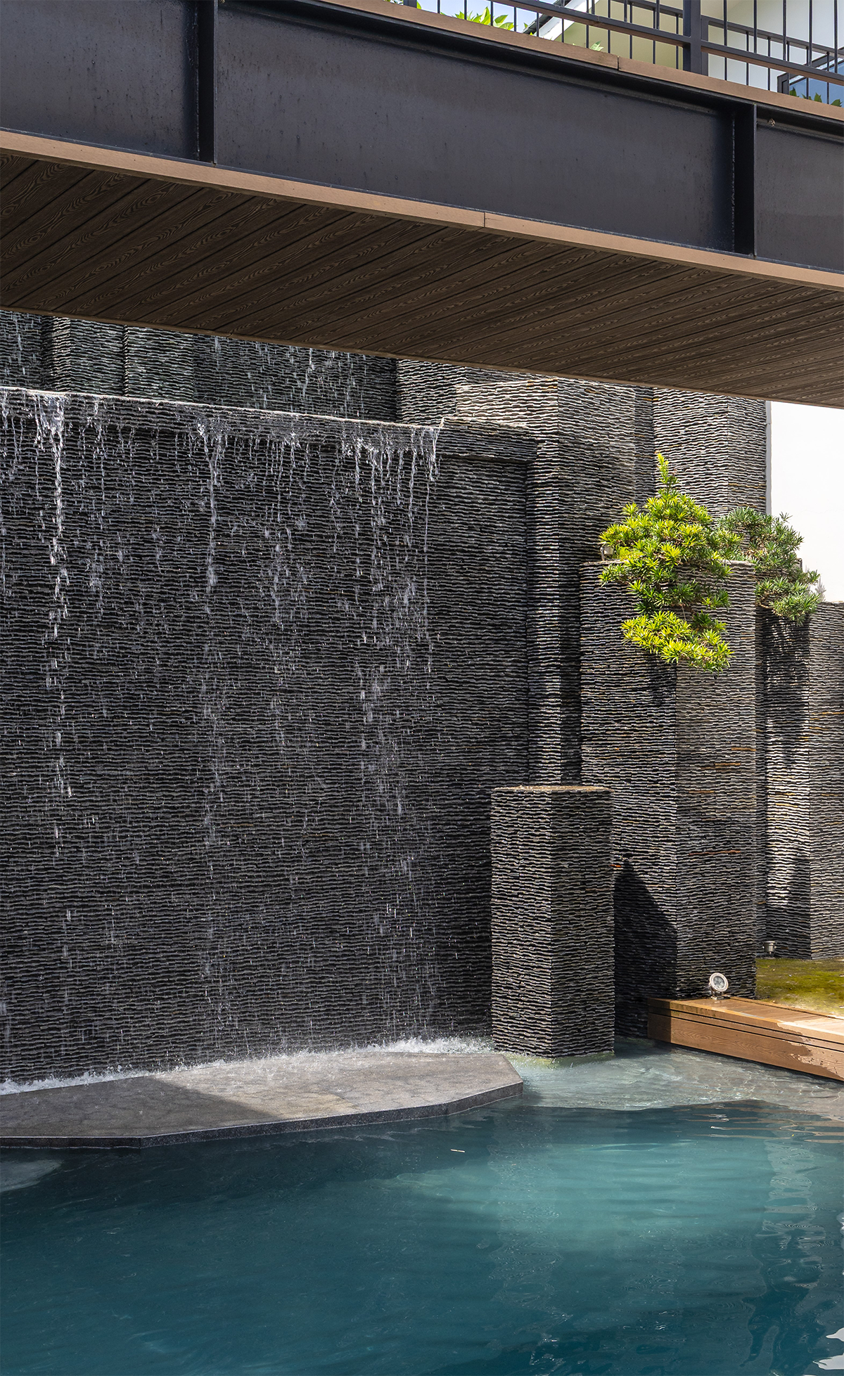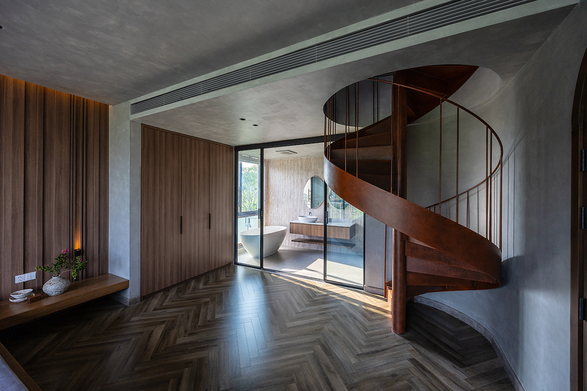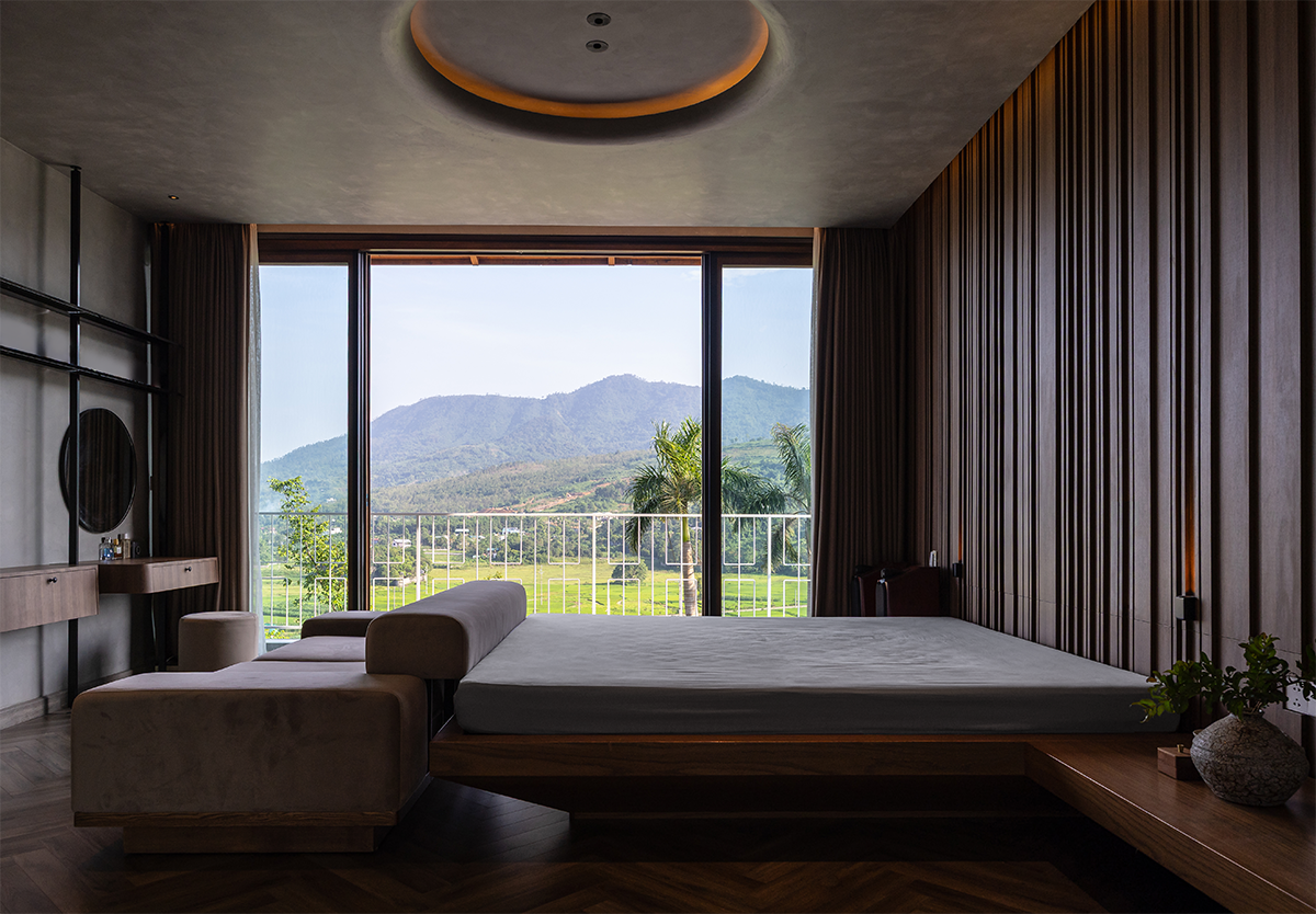 Về vật liệu, dự án ưu tiên những chất liệu mộc mạc và bền vững: gỗ, đá, gạch thô… kết hợp với các chi tiết nội thất tối giản, tinh tế. Hệ thống cảnh quan gồm sân vườn, bể bơi và thác nước được thiết kế tiếp nối triết lý “gần thiên nhiên” của công trình, tạo nên các lớp trải nghiệm liên tục từ trong ra ngoài.
