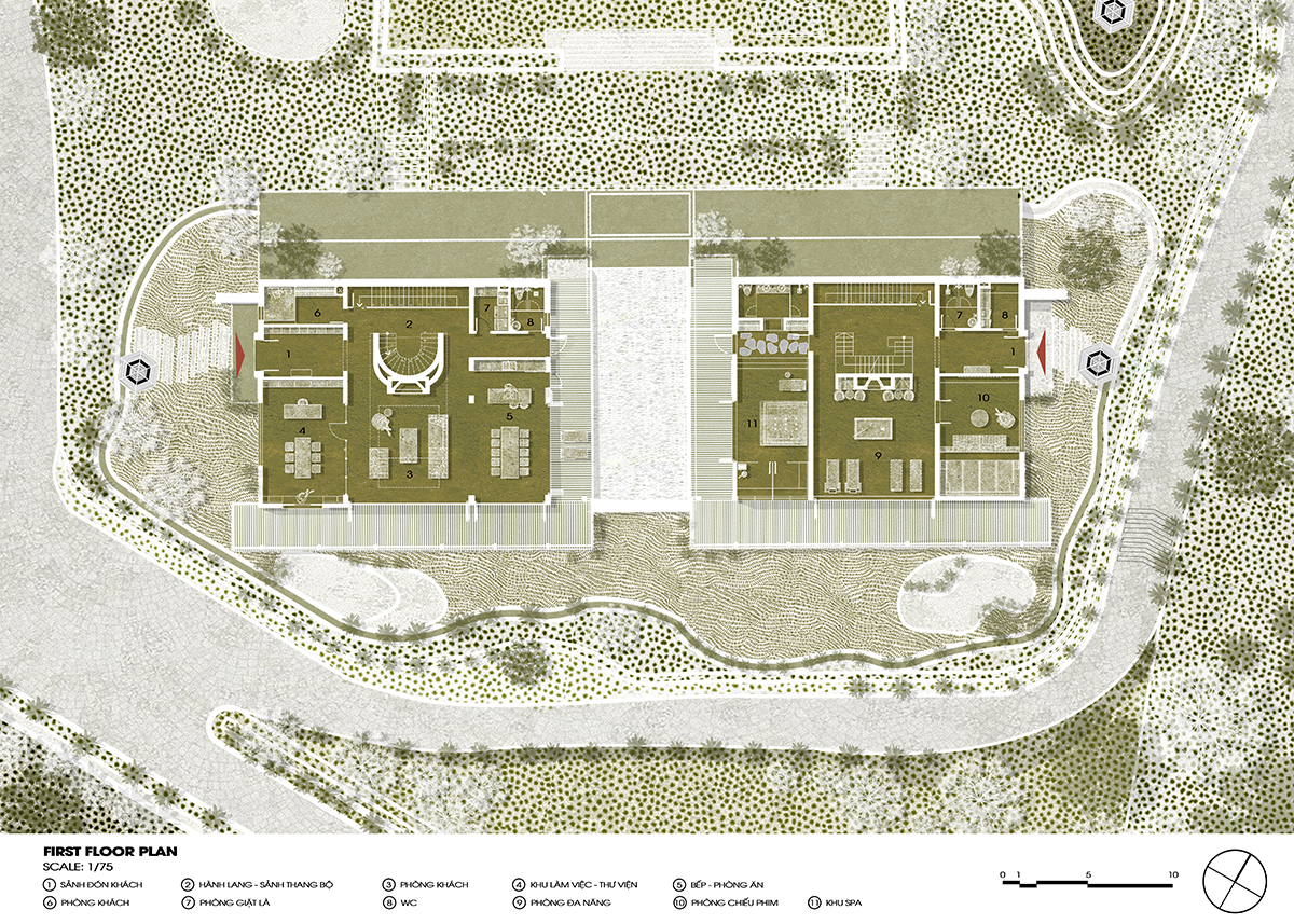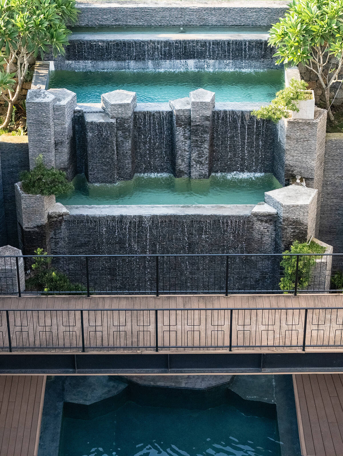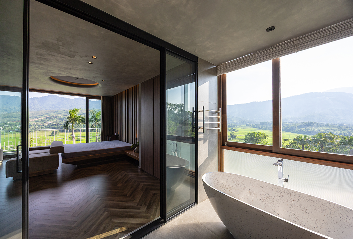 Về vật liệu, dự án ưu tiên những chất liệu mộc mạc và bền vững: gỗ, đá, gạch thô… kết hợp với các chi tiết nội thất tối giản, tinh tế. Hệ thống cảnh quan gồm sân vườn, bể bơi và thác nước được thiết kế tiếp nối triết lý “gần thiên nhiên” của công trình, tạo nên các lớp trải nghiệm liên tục từ trong ra ngoài.