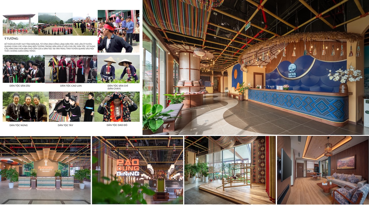 Ý tưởng thiết kế: từ hình ảnh cổng làng, mái lán dân tộc ở Tân Trào cùng các hình ảnh biểu tượng trong văn hóa lễ hội của các dân tộc,ảnh hoa văn thổ cẩm của 6 dân tộc tại huyện sơn dương, tỉnh tuyên quang. Nhằm Gìn giữ và phát huy những giá trị cốt lõi, bản địa về truyền thống, văn hóa của vùng đất lịch sử. Từ đó đổi mới cách kết hợp yếu tố kiến trúc và chi tiết nội thất thổ cẩm, tỷ mỷ mang lại không gian nội thất tích cực, thu hút giúp phát triển văn hóa, du lịch là Tân Trào.
