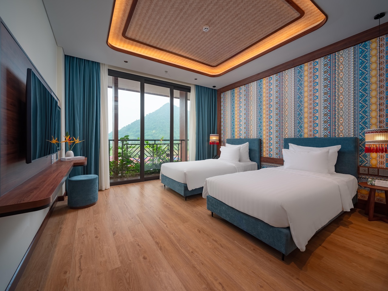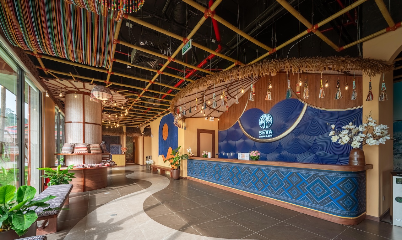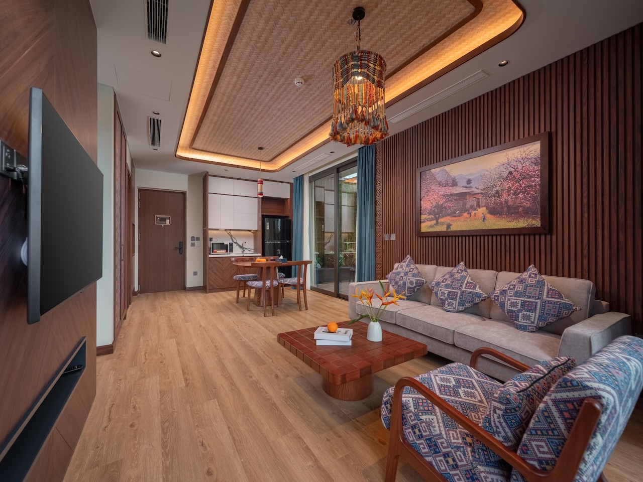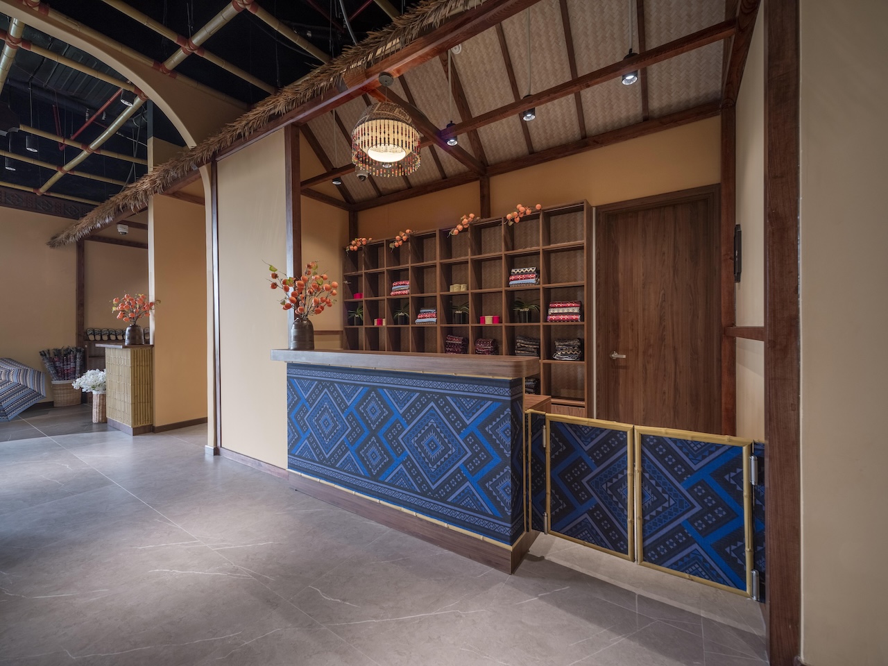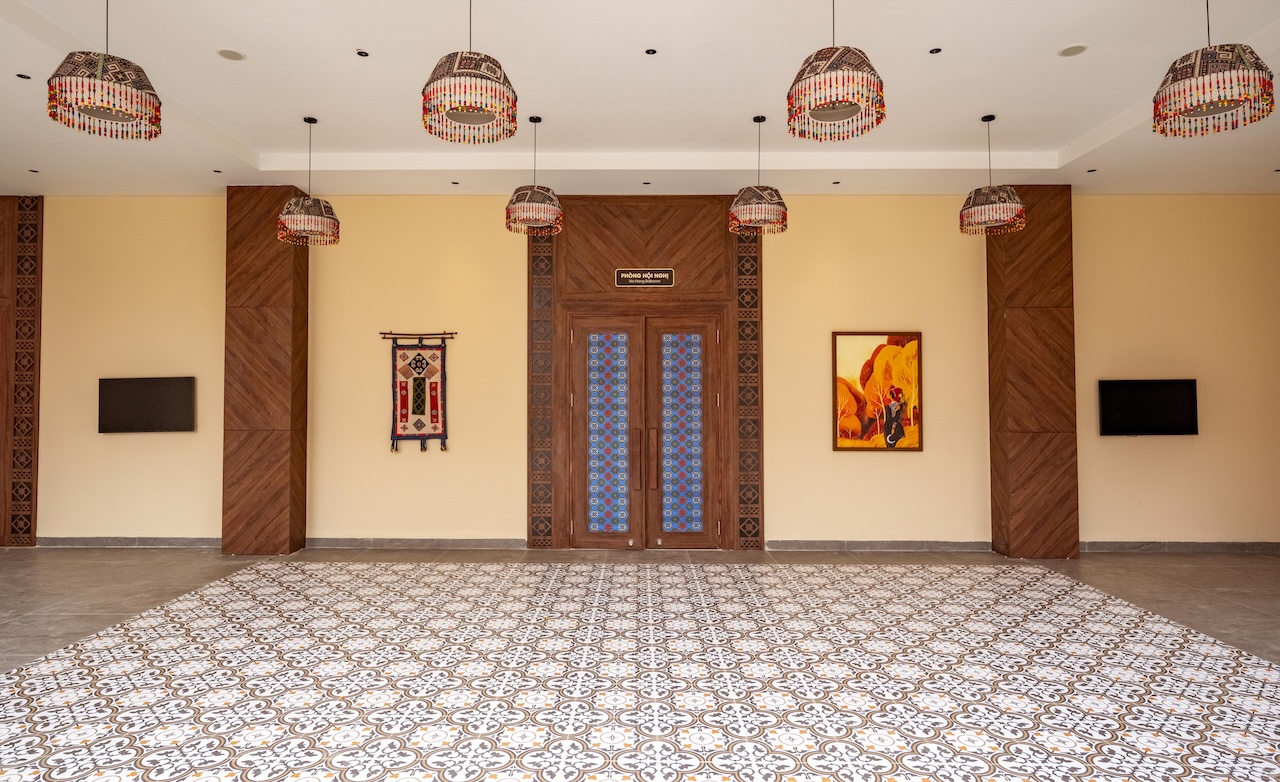 Không gian sảnh đón tiếp: Không gian được thiết kế kết hợp với các chất liệu bản địa nhằm tôn vinh vẻ đẹp của vùng miền. Sự kết hợp giữa Tre (Bamboo), Thổ cẩm và Phong cảnh thiên nhiên tạo nên một tổng thể vừa sang trọng, vừa ấm cúng và gần gũi. Hệ trần tre độc đáo: Điểm ấn tượng nhất là hệ lưới tre đan cài tầng bậc. Thiết kế này vừa giúp che đi các hệ thống kỹ thuật, vừa tạo hiệu ứng thị giác mạnh mẽ, gợi nhắc đến những nếp nhà truyền thống của người dân vùng cao.