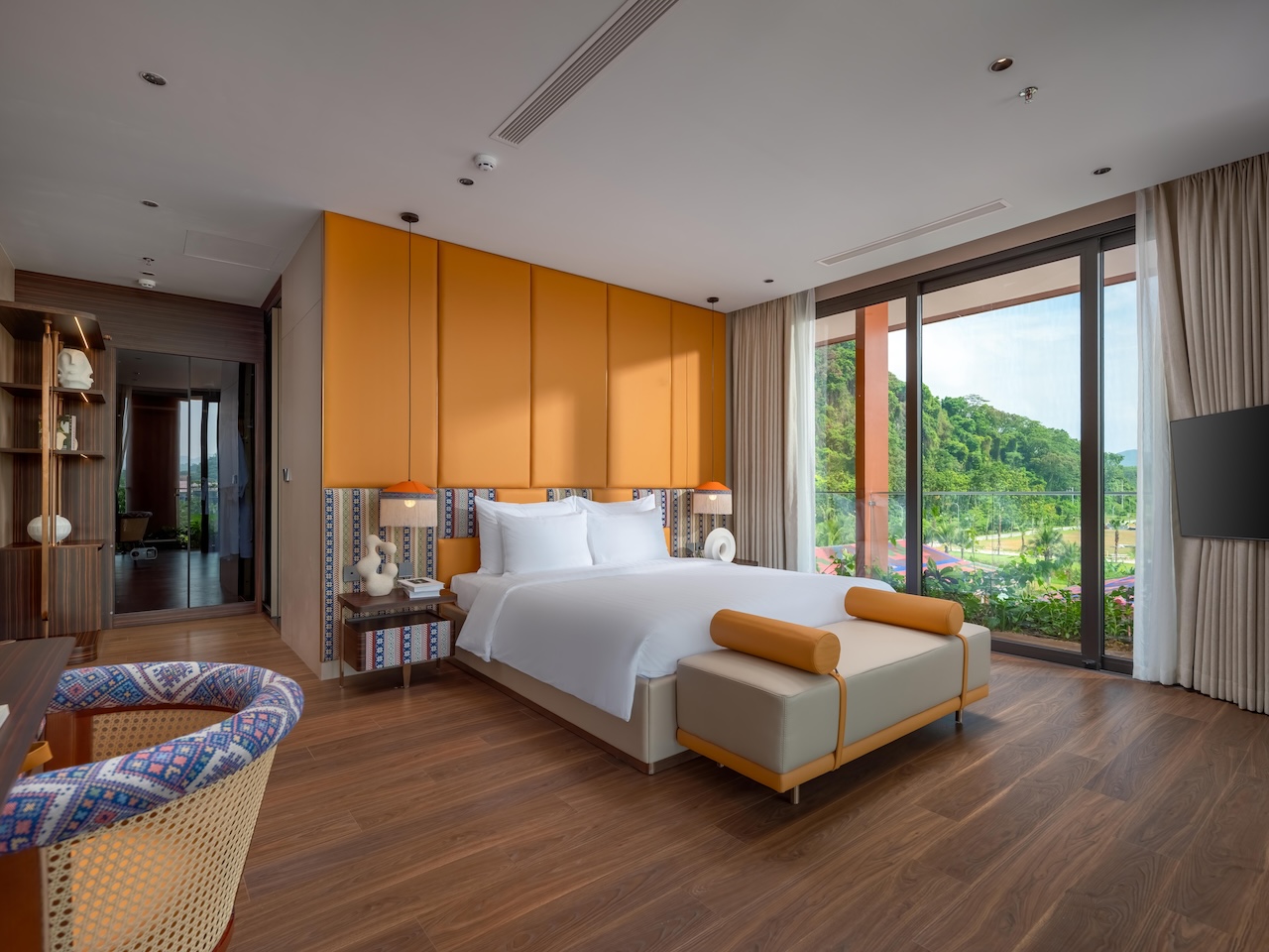 Không gian phòng ngủ: Không gian mở với diện kính rộng và ban công với cây xanh xóa nhòa ranh giới. Đèn chùm trang trí với tua rua vải là một nét chấm phá nghệ thuật đậm chất thủ công. Sự kết hợp giữa gỗ ốp hình xương cá hiện đại và dải giấy dán tường mang hoa văn thổ cẩm chạy dọc theo đầu giường tạo nên một sự giao thoa thị giác thú vị. Sofa và ghế đơn sử dụng chất liệu vải có họa tiết đồng bộ với gối tựa, tạo nên một câu chuyện xuyên suốt về màu sắc và văn hóa.