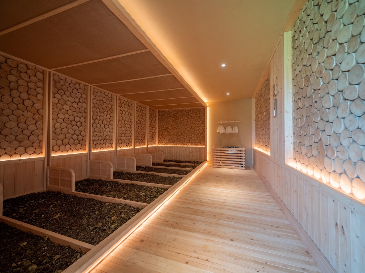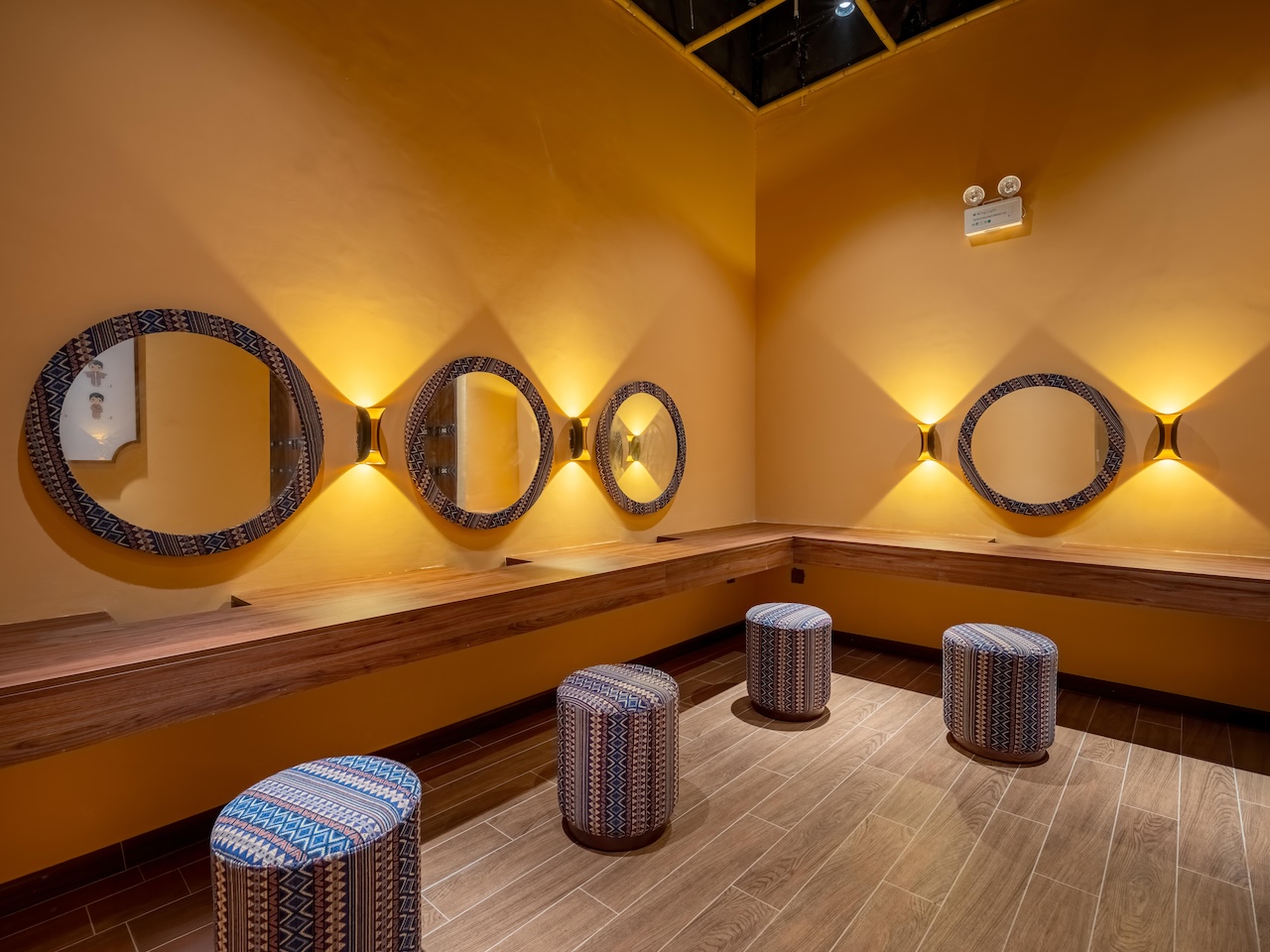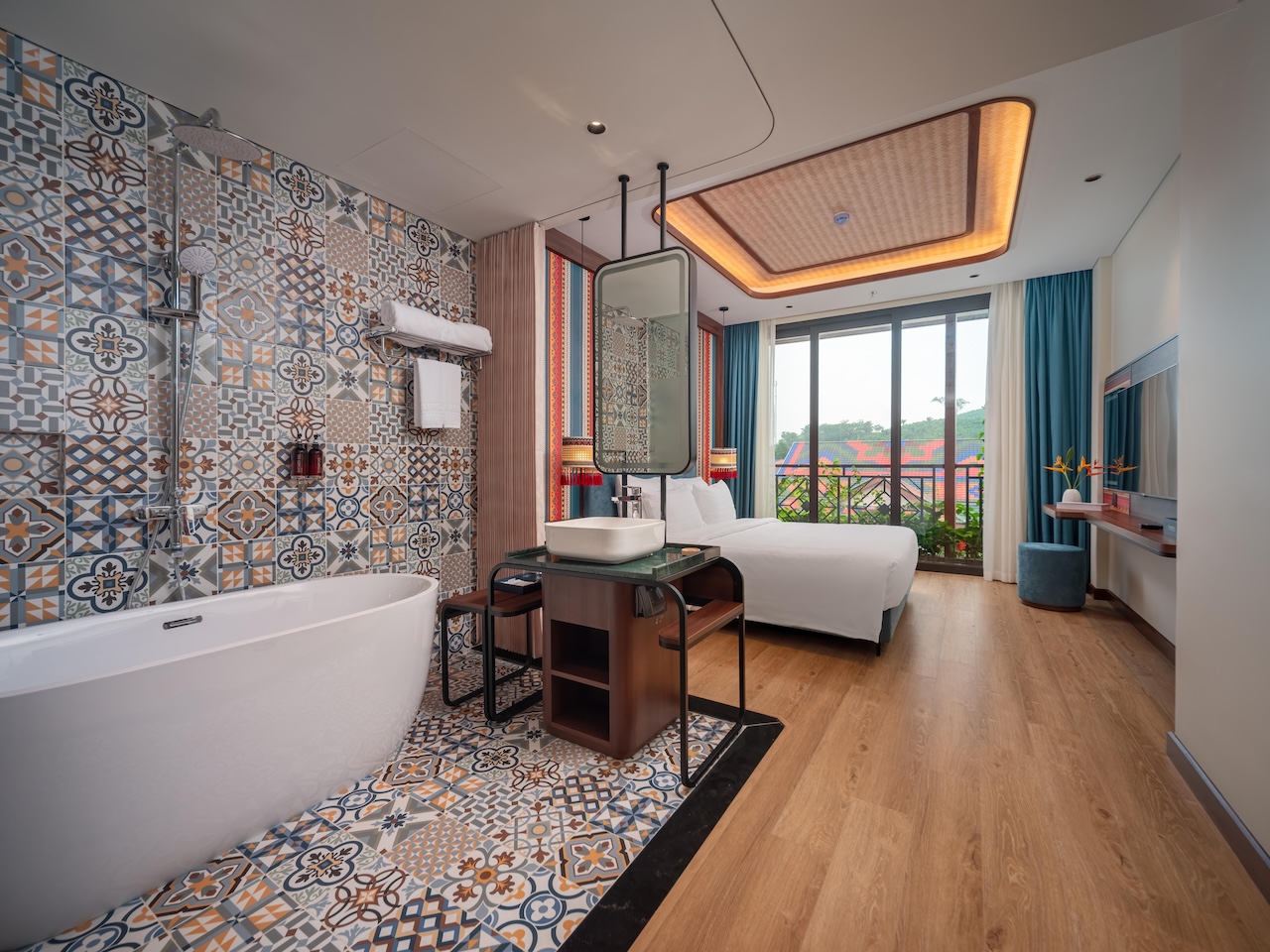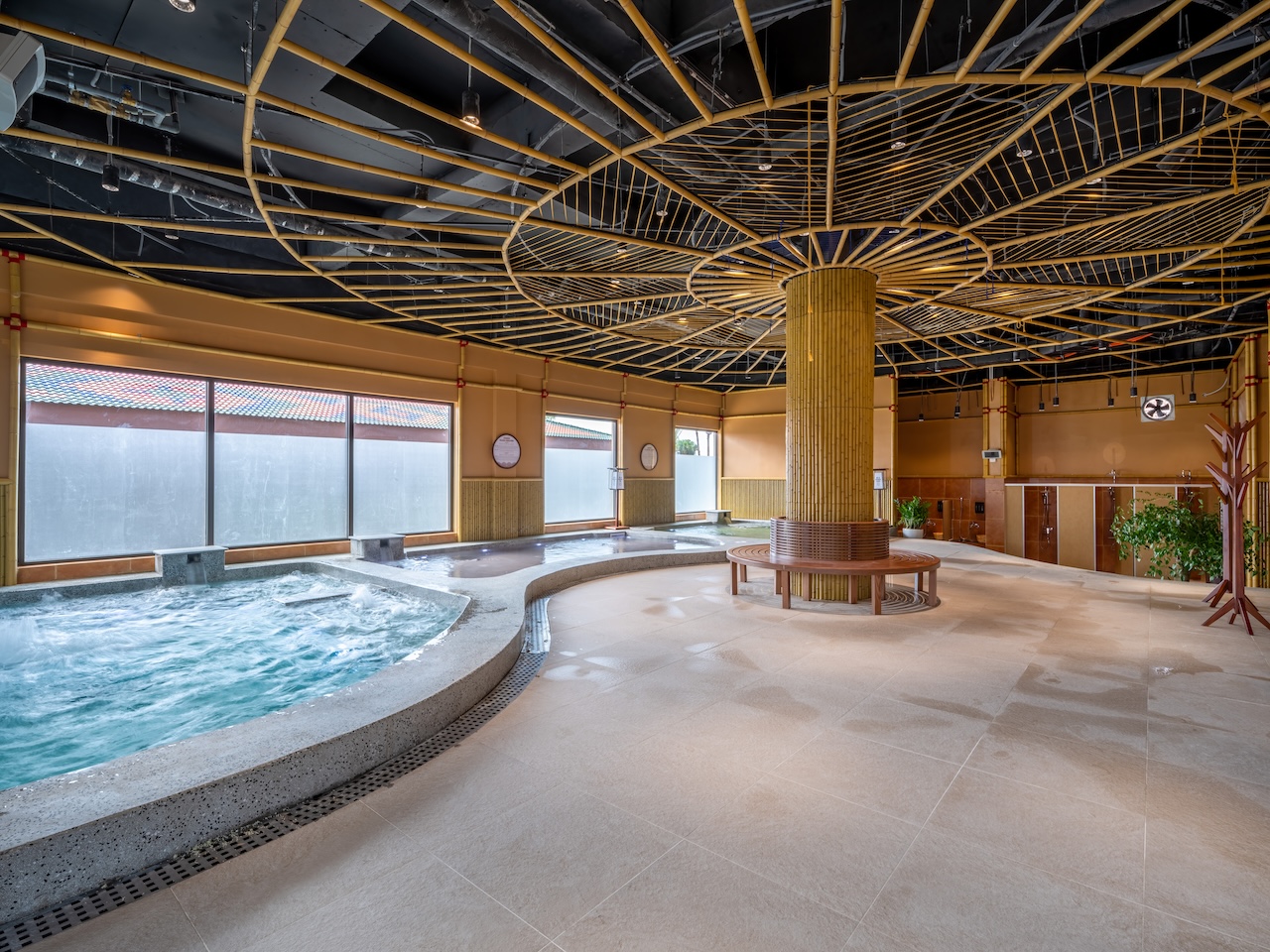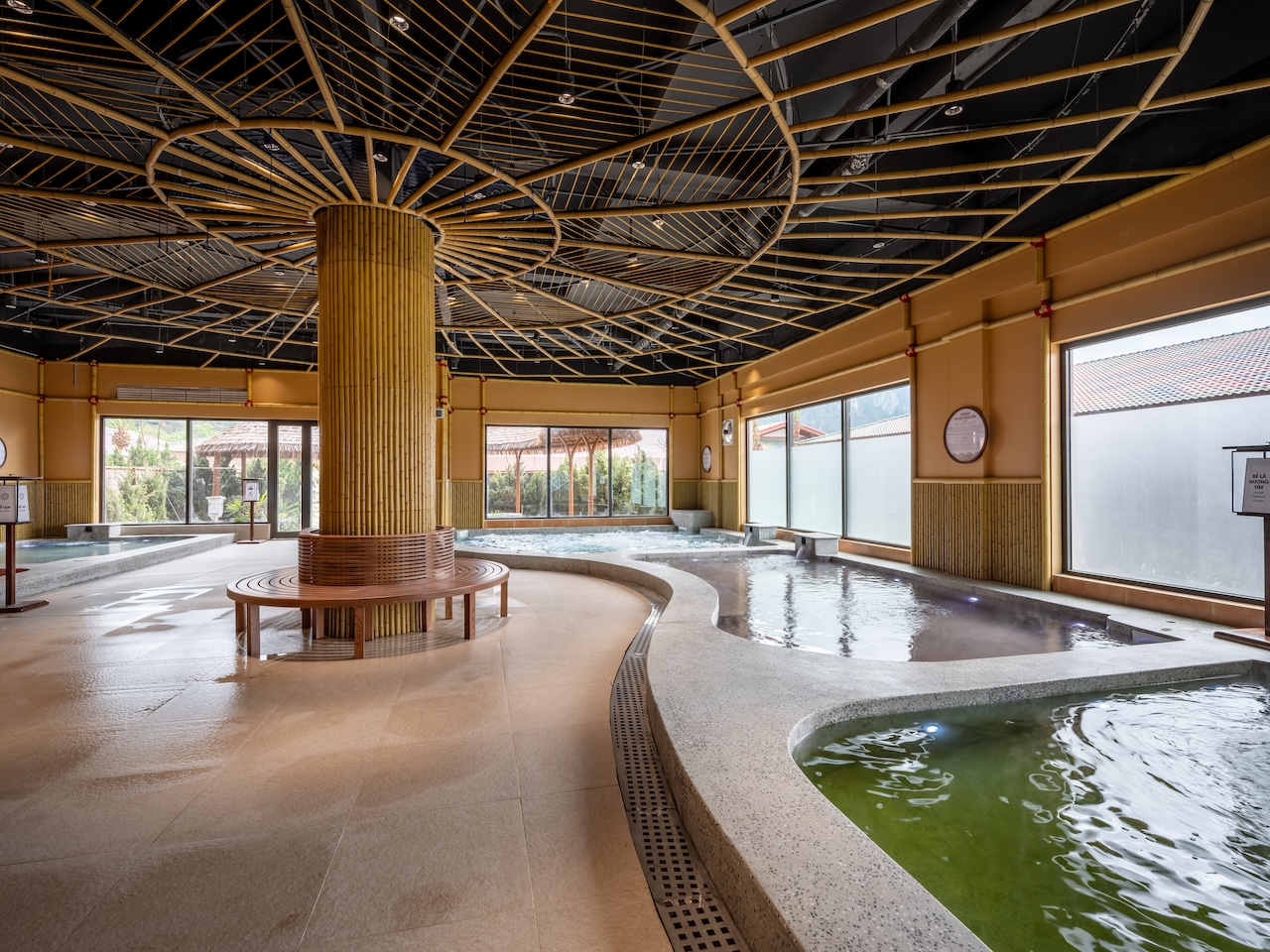 Không gian Onsen & Spa: mang đến cảm giác mềm mại, thư thái và giàu tính nghệ thuật thủ công, dẫn dắt du khách vào một hành trình chăm sóc nghỉ ngơi. Họa tiết Thổ cẩm đương đại kết hợp hệ mái lợp lá kết hợp với các chùm tua rua trang trí, tạo nên một “không gian trong không gian”, gợi nhớ đến nón cọ – nét văn hóa đặc trưng ở Tân Trào. Cấu trúc trần tre, gỗ khắc họa tiết thổ cẩm và Chỉ màu: gợi nhớ đến những khung cửi dệt vải truyền thống.