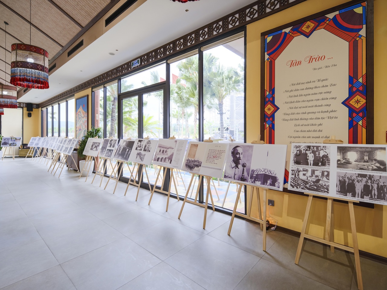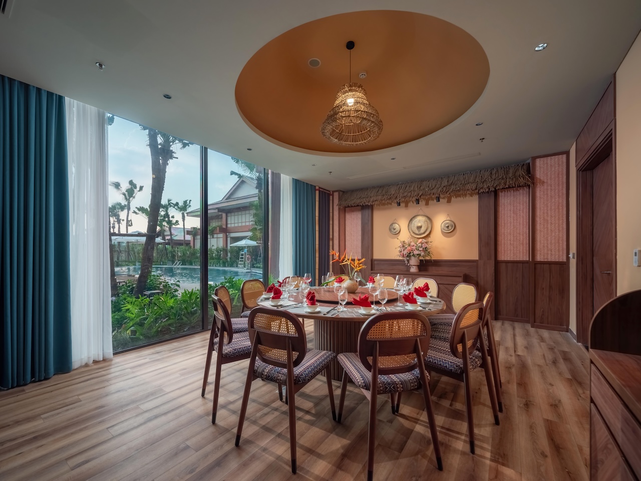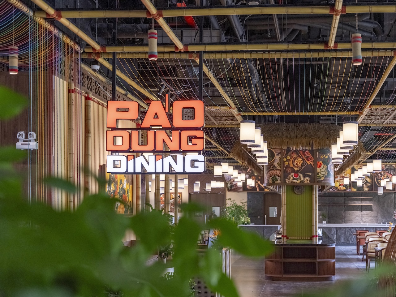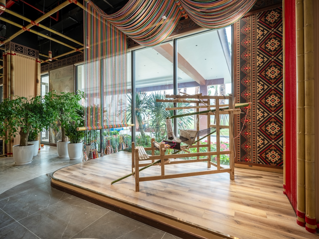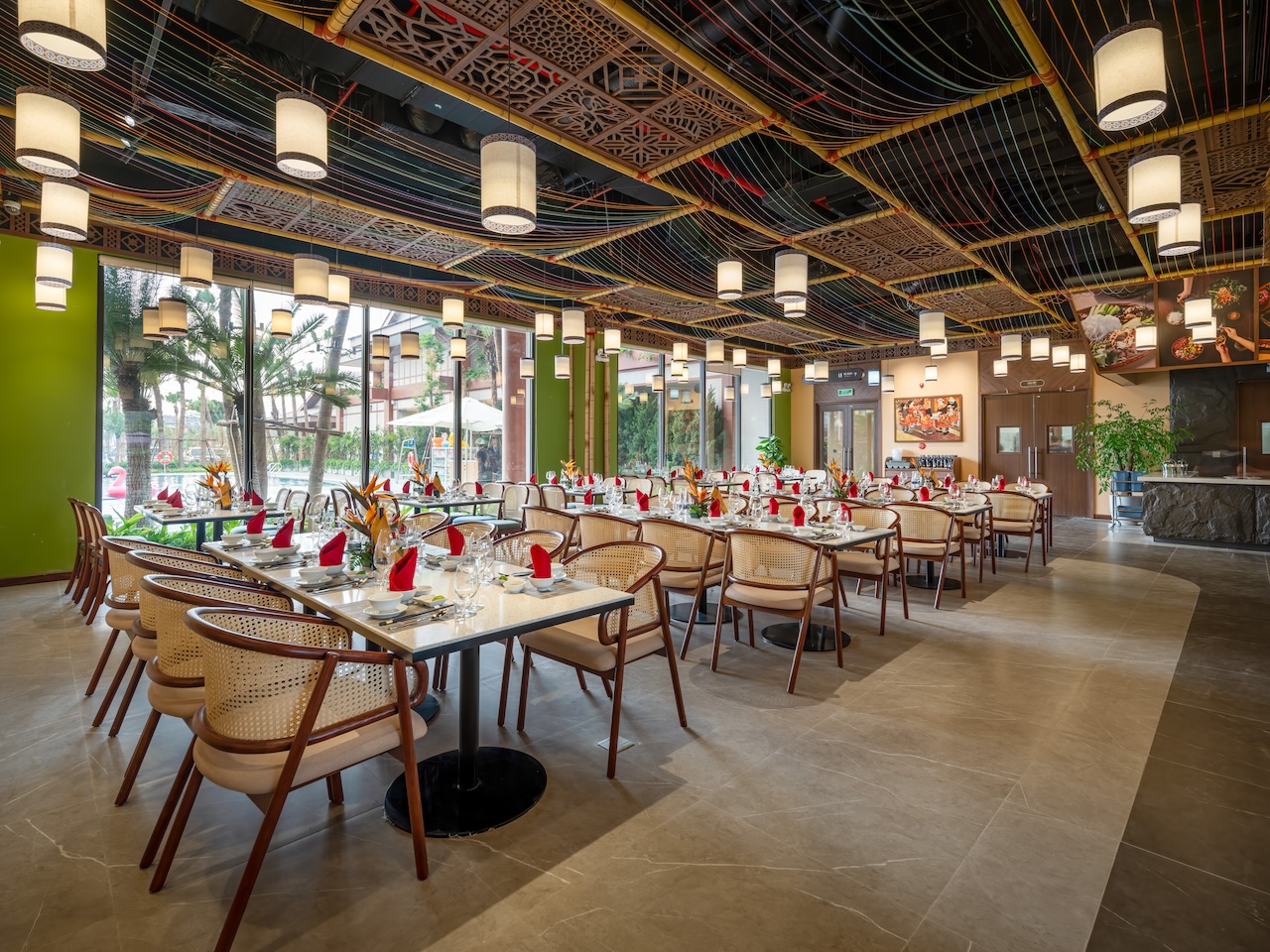 Không gian Nhà hàng: là nơi tái hiện không khí của một phiên chợ vùng cao nhưng được chuẩn mực hóa trong không gian ẩm thực sang trọng. Hệ trần với hàng trăm chiếc đèn lồng hình trụ bọc vải thổ cẩm treo dày đặc trên hệ khung tre. Các dải chỉ màu đan xen tạo nên một bầu không khí rộn ràng, giàu năng lượng. Khu vực trung tâm: Quầy buffet được thiết kế như một ngôi nhà sàn thu nhỏ với mái lá và cột tre, nơi trưng bày các bức tranh về ẩm thực bản địa, giúp du khách không chỉ thưởng thức món ăn mà còn “thưởng thức” cả văn hóa vùng miền.