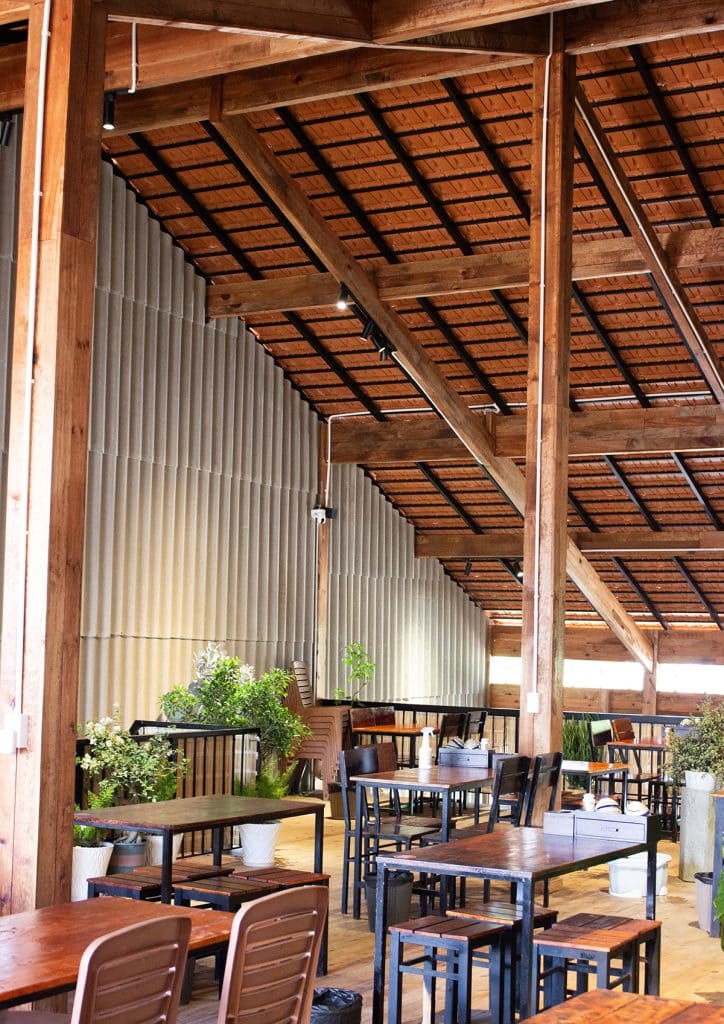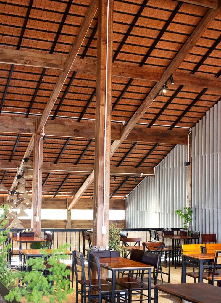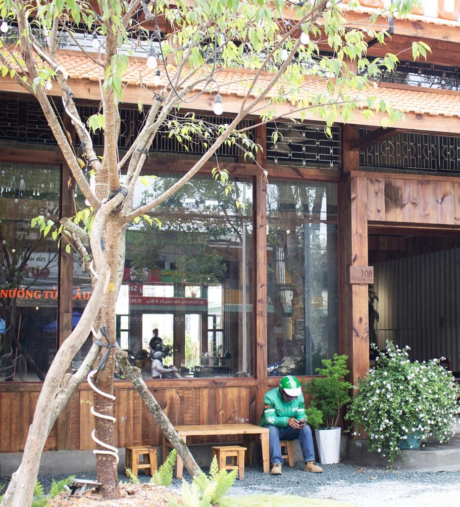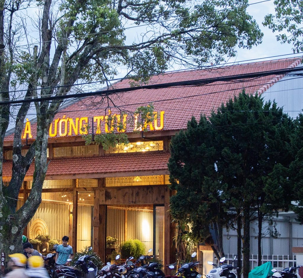 Một không gian có mặt tiền chính hướng Tây được xử lý bằng những giải pháp thiết kế độc đáo, vừa đảm bảo công năng, vừa cân bằng vi khí hậu, ánh sáng và đối lưu gió. Gà Nướng Tửu Lầu lấy cảm hứng từ những triền đồi và hình ảnh đặc trưng của Tây Nguyên, sử dụng vật liệu bản địa để tạo nên một không gian hoài niệm, mộc mạc và gợi cảm xúc.