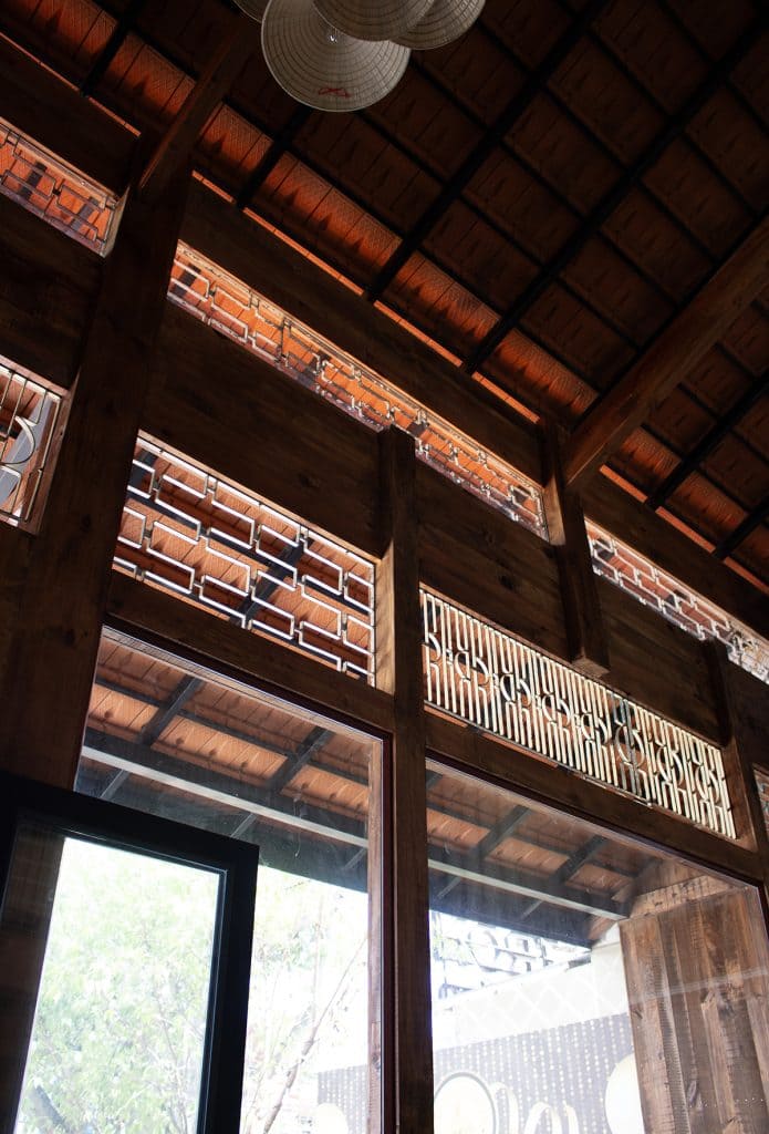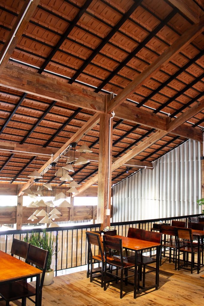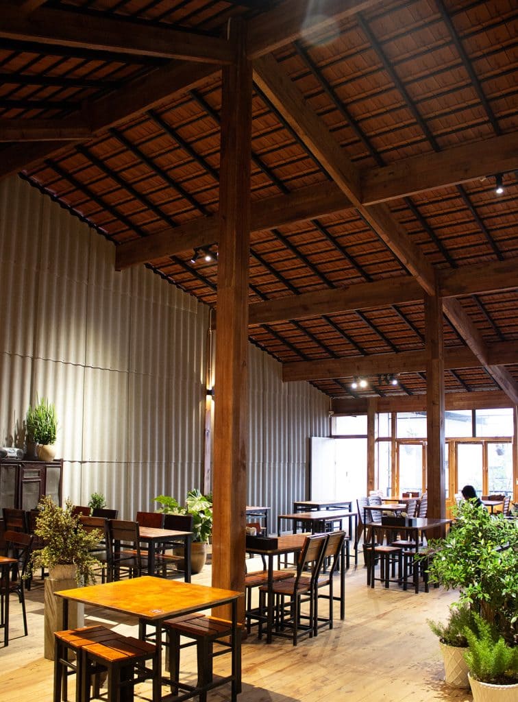 Tổng thể nội thất không chỉ tái hiện hình ảnh quen thuộc của một ngôi nhà Tây Nguyên, mà còn đem đến trải nghiệm văn hóa, nơi thực khách vừa thưởng thức ẩm thực vừa sống trọn trong bầu không khí ấm cúng, mộc mạc và chan chứa tình cảm bản địa.