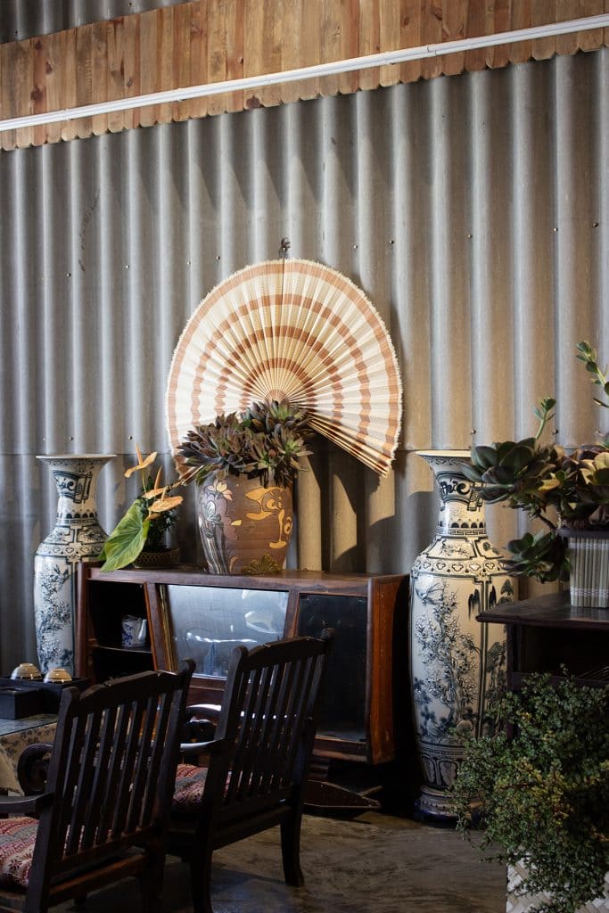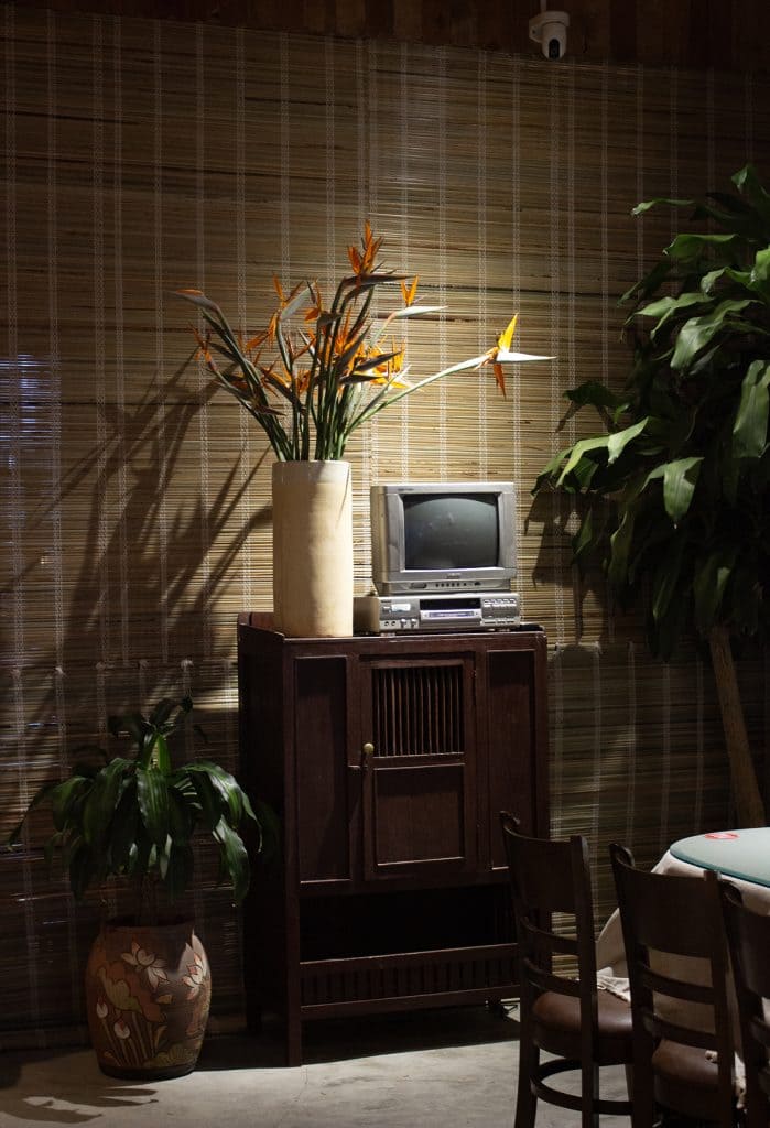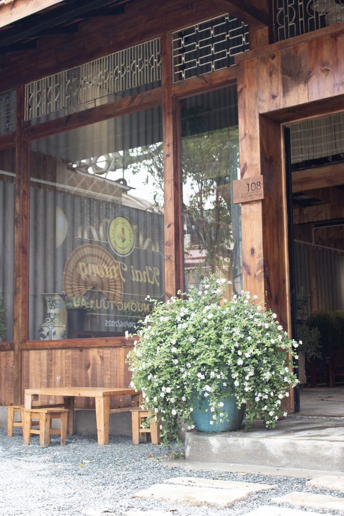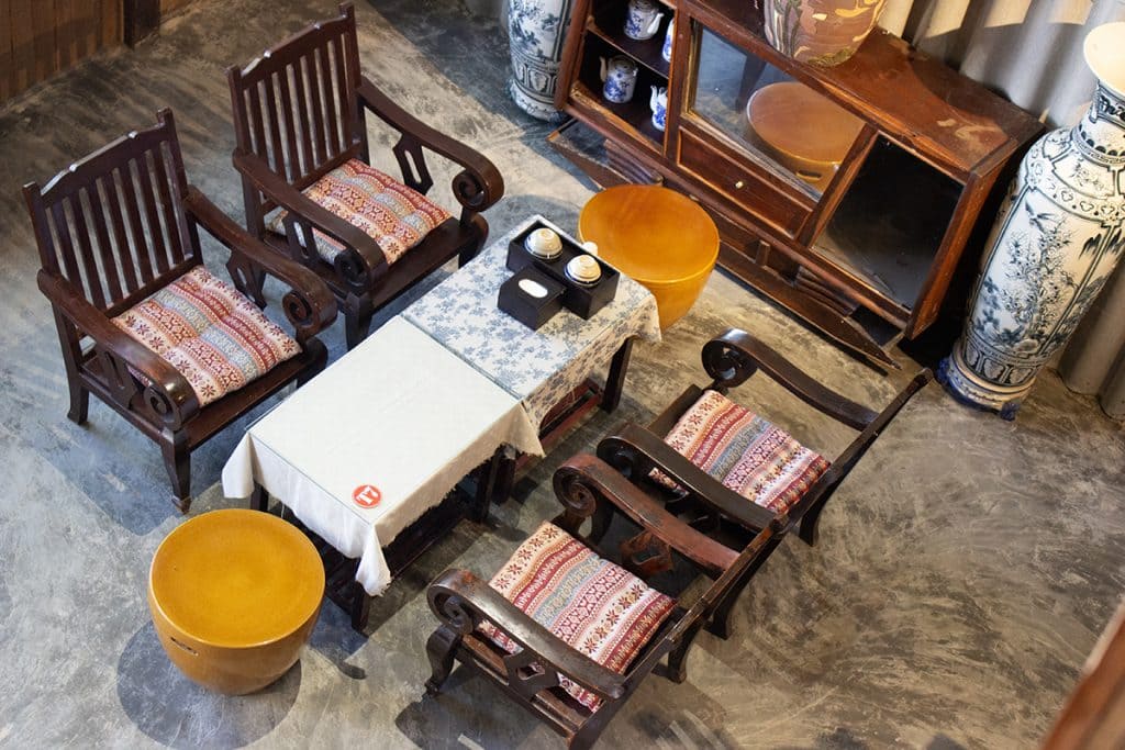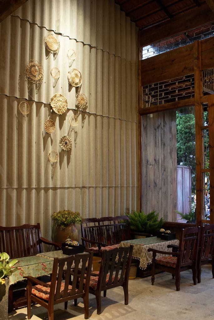 Không gian nội thất mang đậm nét hoài cổ và bản sắc địa phương. Những bộ bàn ghế gỗ truyền thống được phối cùng nệm hoa văn thổ cẩm, tạo điểm nhấn văn hóa đặc trưng. Các vật dụng quen thuộc như tủ gỗ cũ, kệ trưng bày gốm sứ, quạt nan tre, ti vi băng hình được sắp đặt khéo léo, gợi nhớ ký ức xưa.