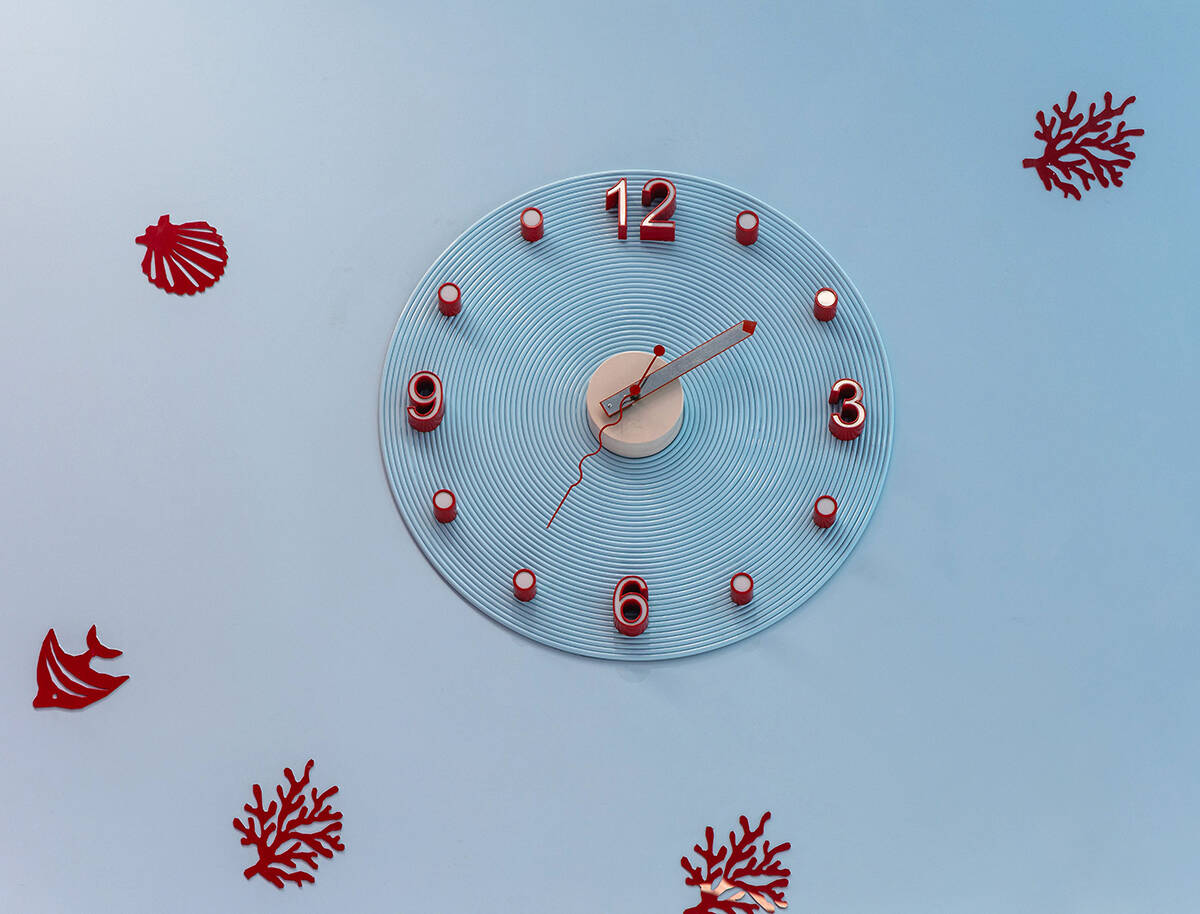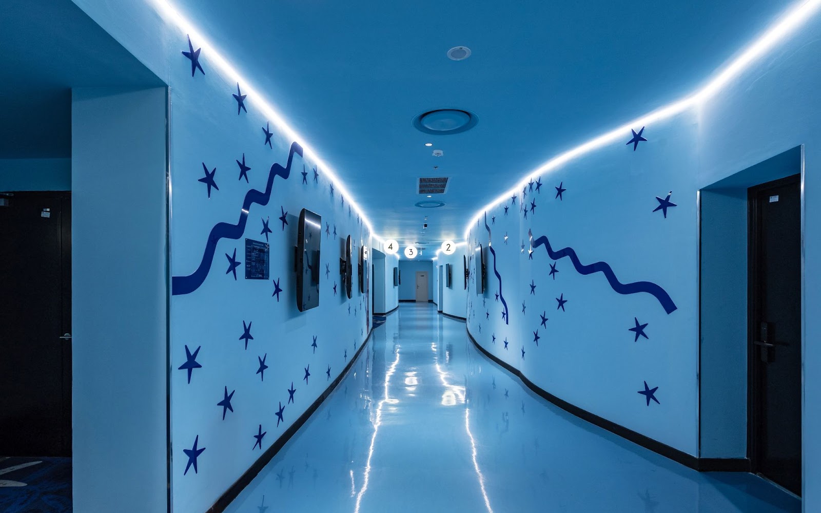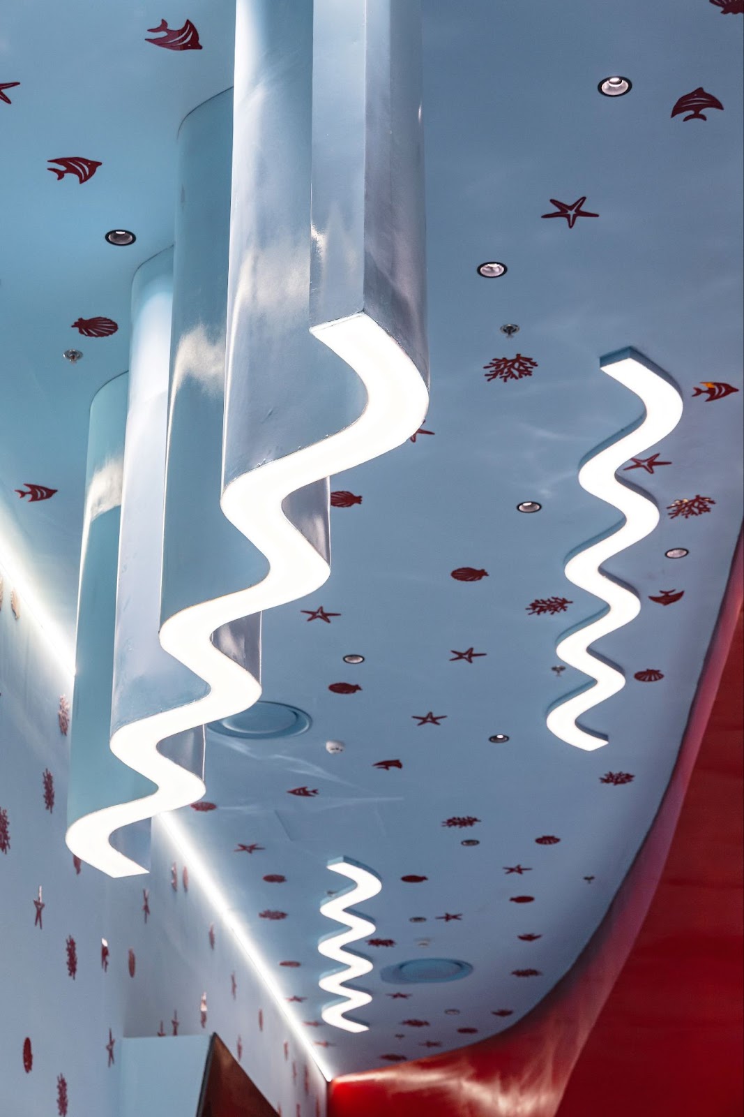 Một điểm nhấn đáng chú ý trong không gian là “dòng hải lưu đỏ” – hiệu ứng màu sắc tại khu vực sảnh đón, lấy cảm hứng từ hiện tượng giao thoa của các dòng hải lưu nóng – lạnh ngoài khơi biển Nha Trang. Dải màu đỏ cam nổi bật giữa nền xanh biển tạo hiệu ứng thị giác mạnh, đồng thời đóng vai trò biểu tượng của sự chuyển động và năng lượng trong không gian tĩnh.