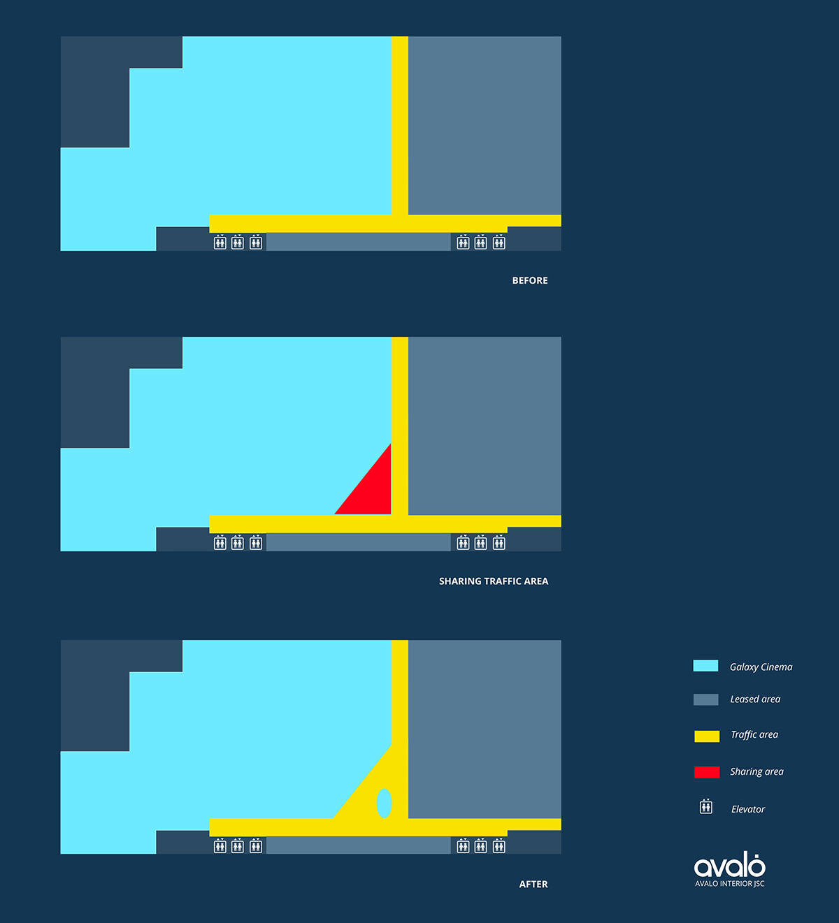 Công trình nằm ở vị trí giao thoa giữa hai làn giao thông chính trong trung tâm thương mại, vốn dễ xảy ra hiện tượng ùn tắc và tạo cảm giác không gian bị chia cắt. Giải pháp thiết kế đưa ra là chia sẻ một phần diện tích sảnh rạp vào không gian chung của TTTM, góp phần mở rộng không gian giao thông, tăng độ thông thoáng và tầm nhìn, đồng thời giảm mật độ di chuyển tại nút giao.