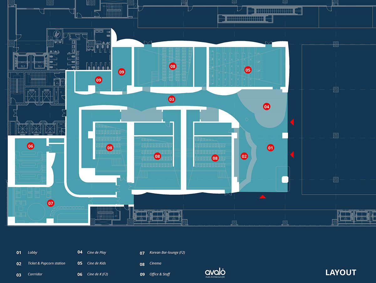 Việc tổ chức giao thông nội bộ của rạp cũng tuân thủ cấu trúc tuyến tính có kiểm soát từ lối vào đến khu vực chờ và các phòng chiếu đảm bảo trải nghiệm liên hoàn và cảm xúc được dẫn dắt xuyên suốt.