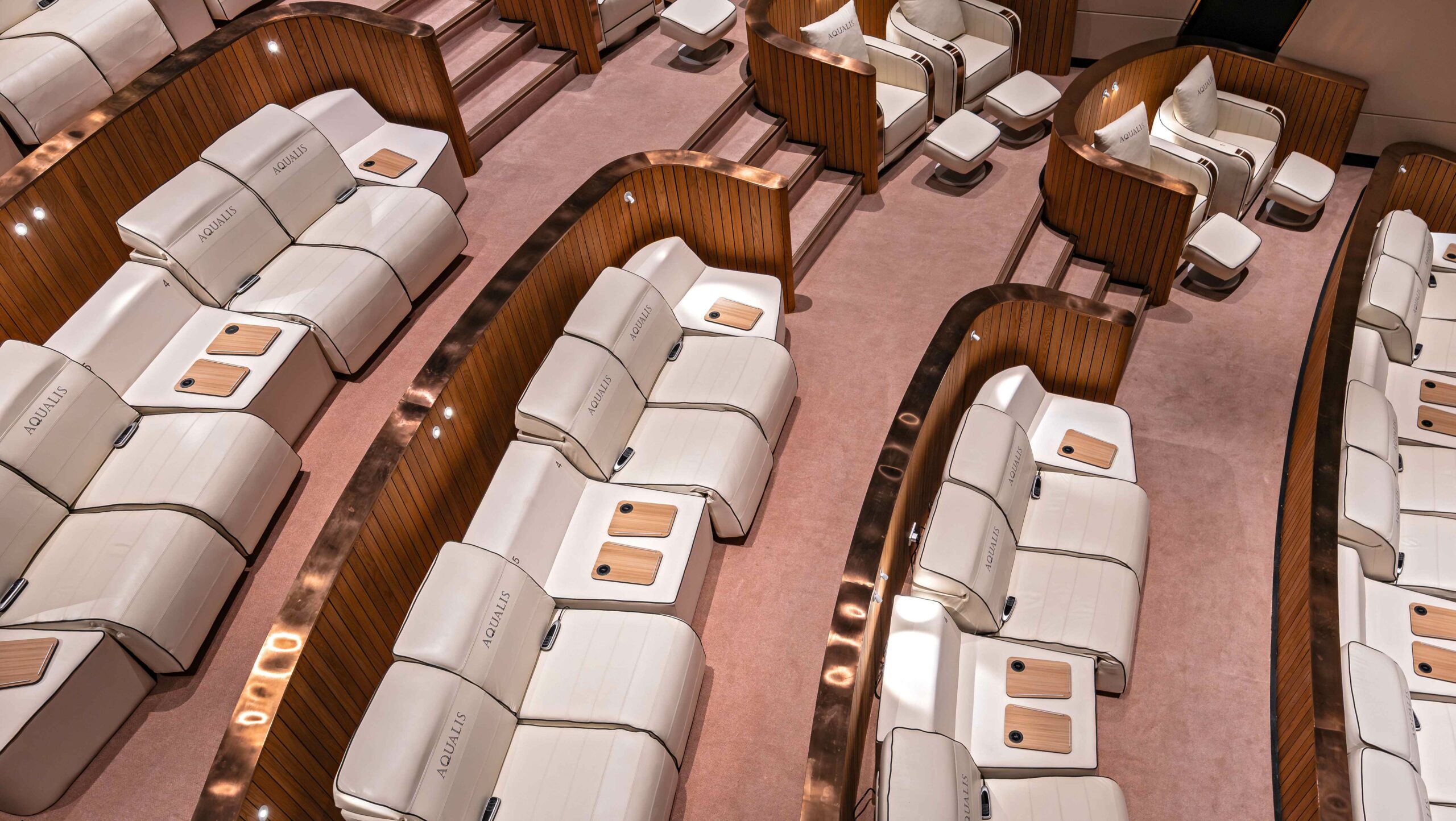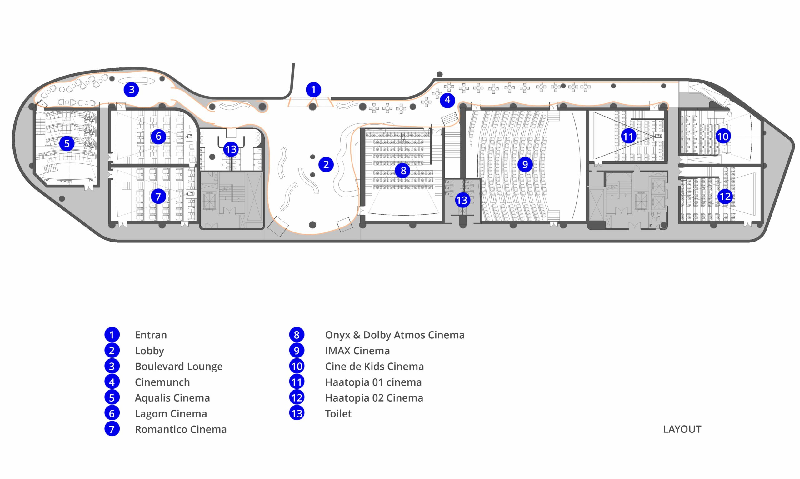 - 3 phòng chiếu mang tính cá nhân hoá sâu sắc là Aqualis, Lagom và Romanticos. 3 phòng chiếu này đứng độc lập và có sảnh chờ Boulevar Lounge riêng được thiết kế tích hợp quầy bar và toilet. Các phòng chiếu này đều có đặc điểm chung là số lượng ghế giới hạn, khoảng cách giữa các ghế rộng rãi như ở phòng khách gia đình. Aqualis lấy ý tưởng từ chỗ ngồi trên du thuyền. Lagom mang lại cảm giác nhẹ nhàng bình yên như ở nhà. Romanticos được thiết kế mang lại cảm giác lãng mạn như những buổi hẹn hò. Đây là phòng chiếu mà khách hàng có thể order đồ ăn thức uống tại chỗ như đang ngồi trong nhà hàng.