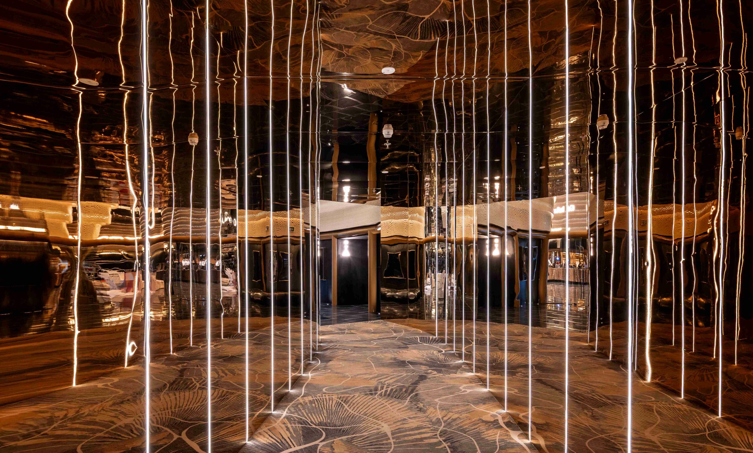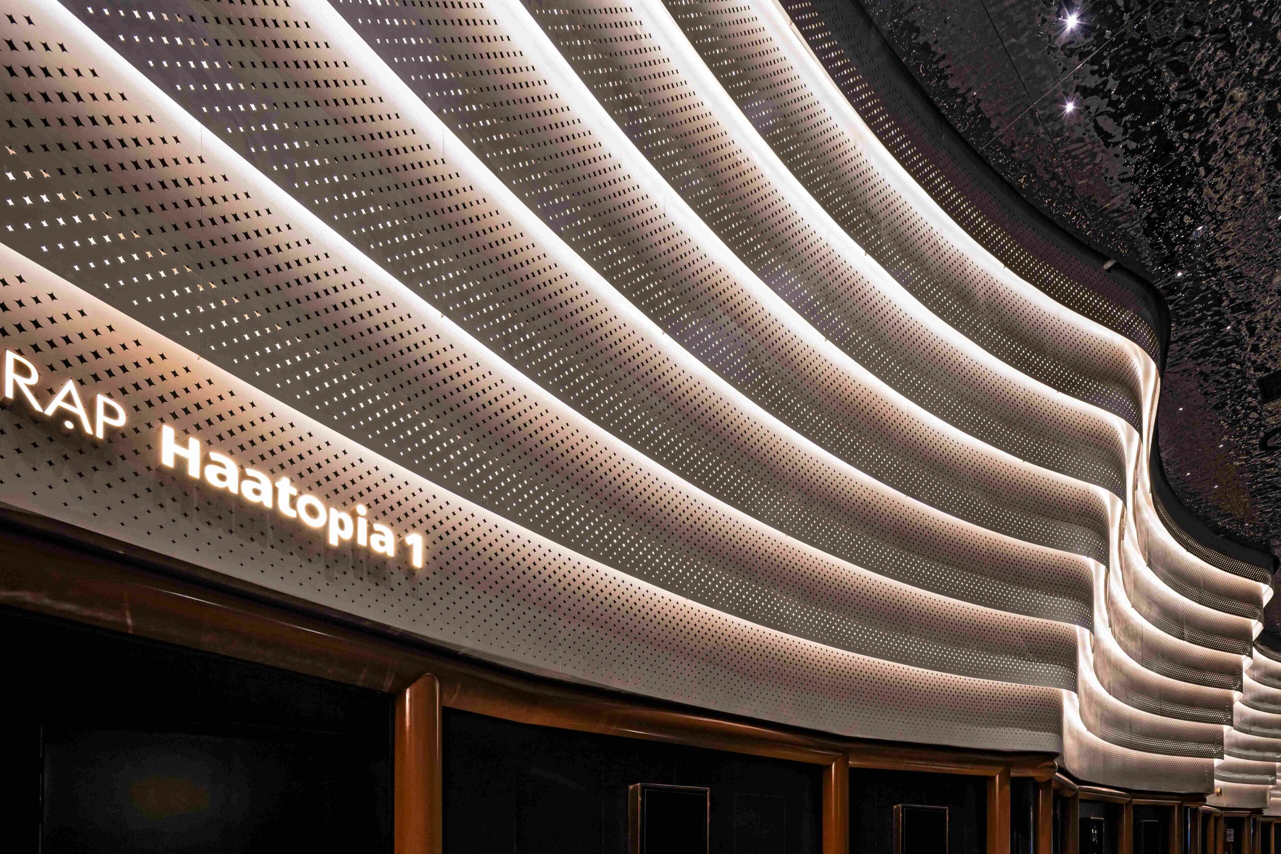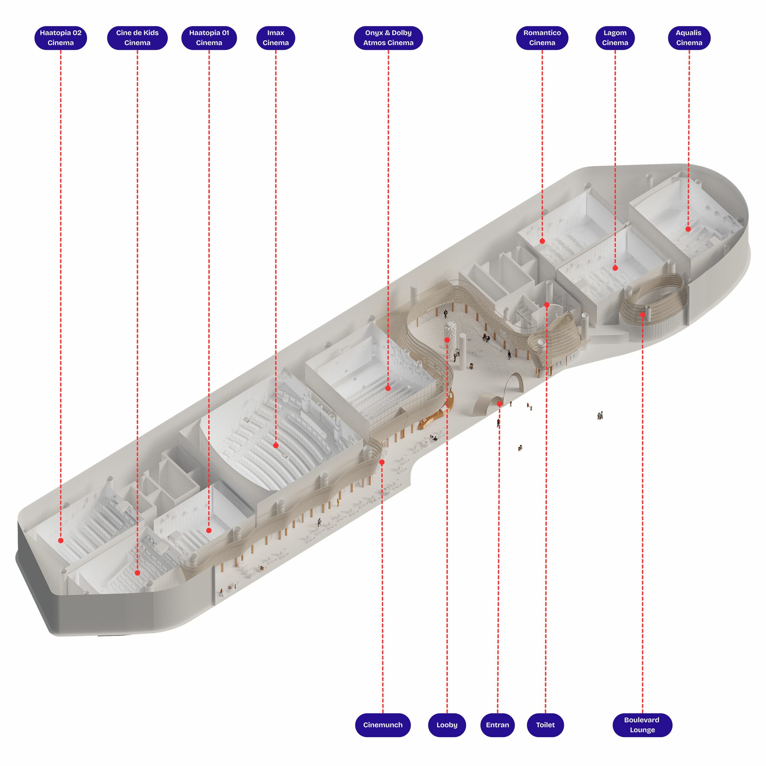 Trên diện tích 2.760 m², rạp chiếu được tổ chức như một tổ hợp trải nghiệm đa dạng thay vì chỉ xoay quanh các phòng chiếu tiêu chuẩn. Không gian sảnh đóng vai trò như vùng đệm chuyển tiếp, nơi câu chuyện về ngành in được kể thông qua hình khối, vật liệu và ánh sáng, trước khi dẫn người xem vào các phòng chiếu với tính chất khác nhau. Hệ thống rạp có 8 phòng chiếu trong đó chỉ có 2 phòng chiếu tiêu chuẩn, còn 6 phòng chiếu còn lại đều có tính đặc thù khác nhau về thiết kế.