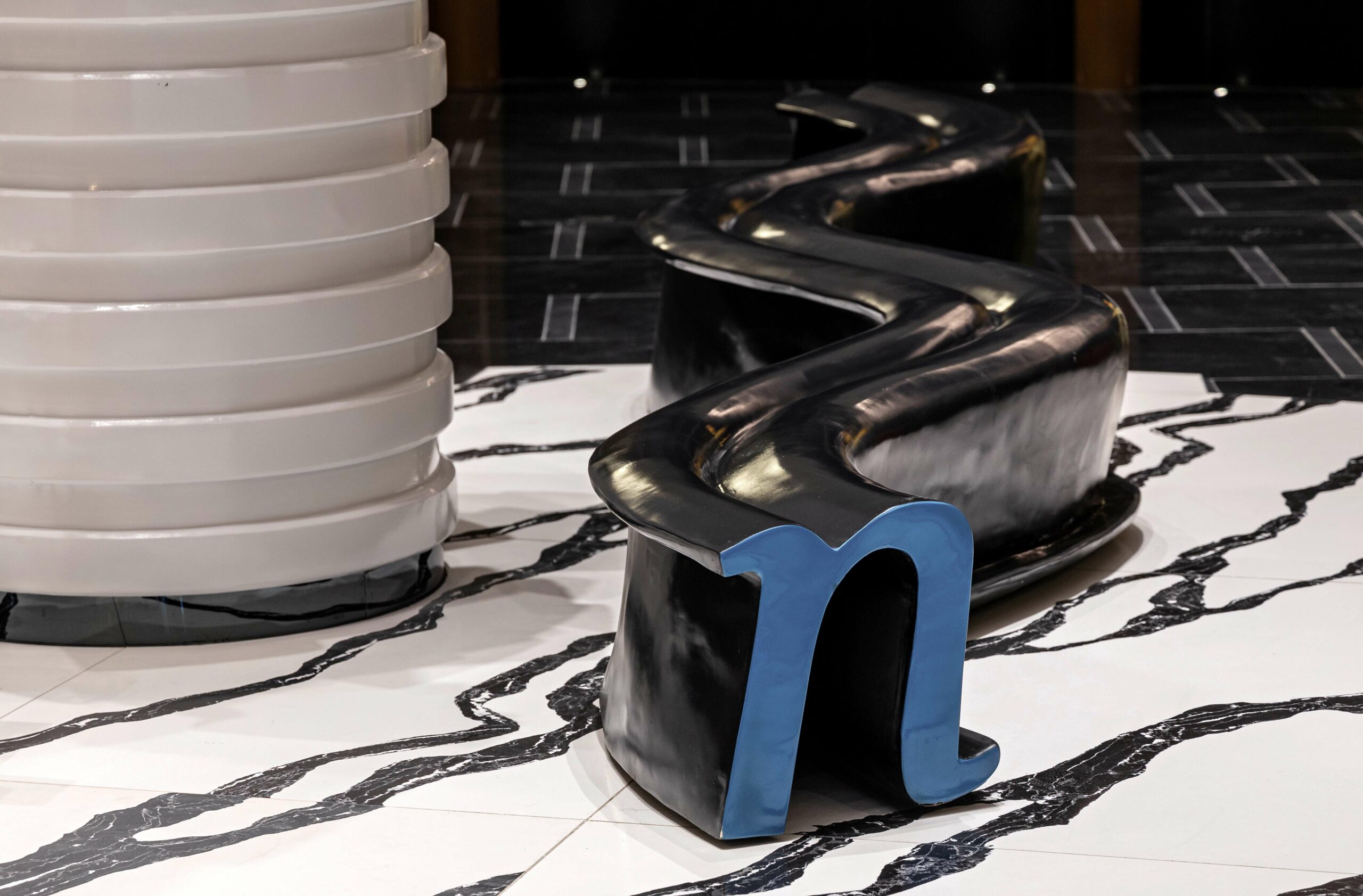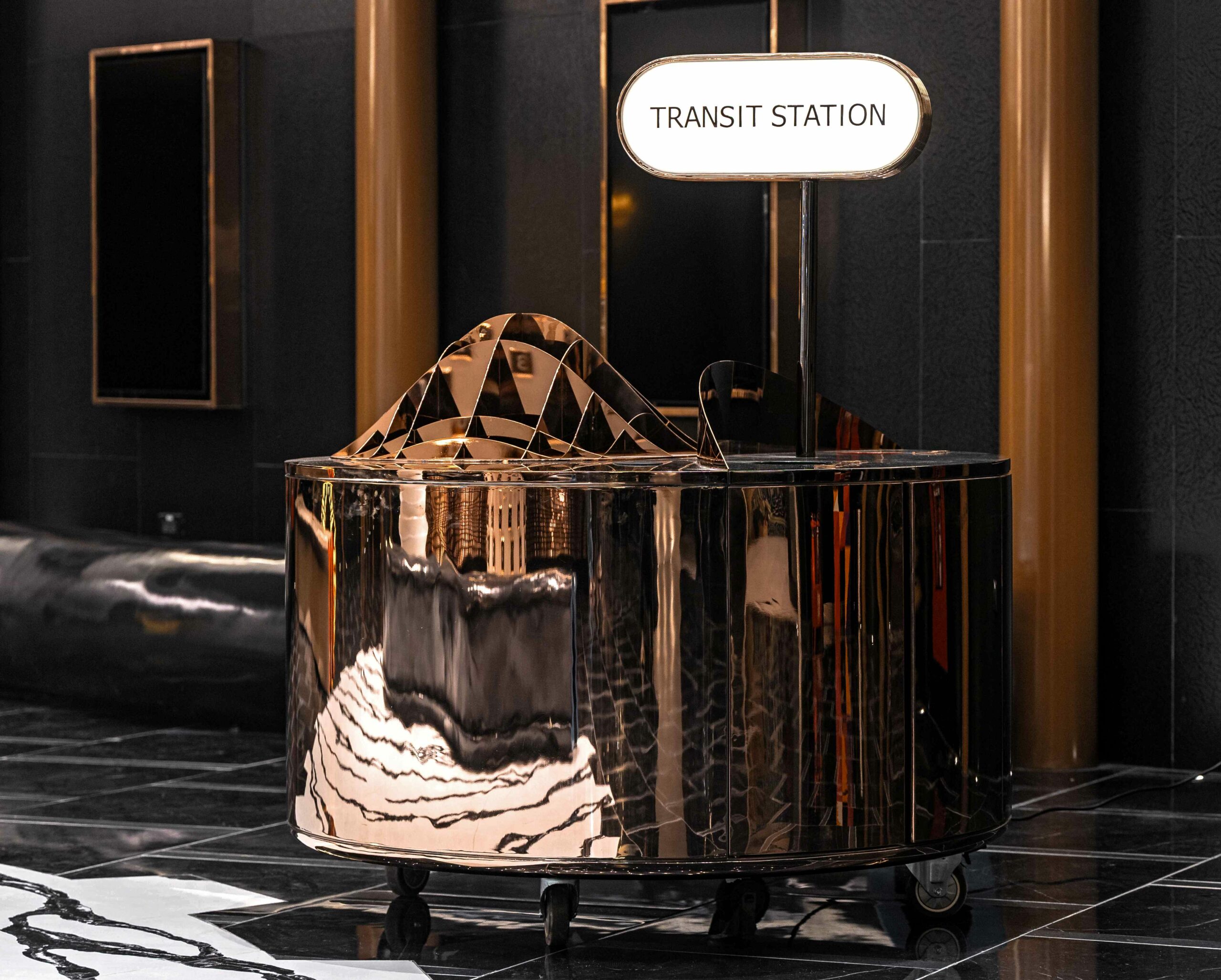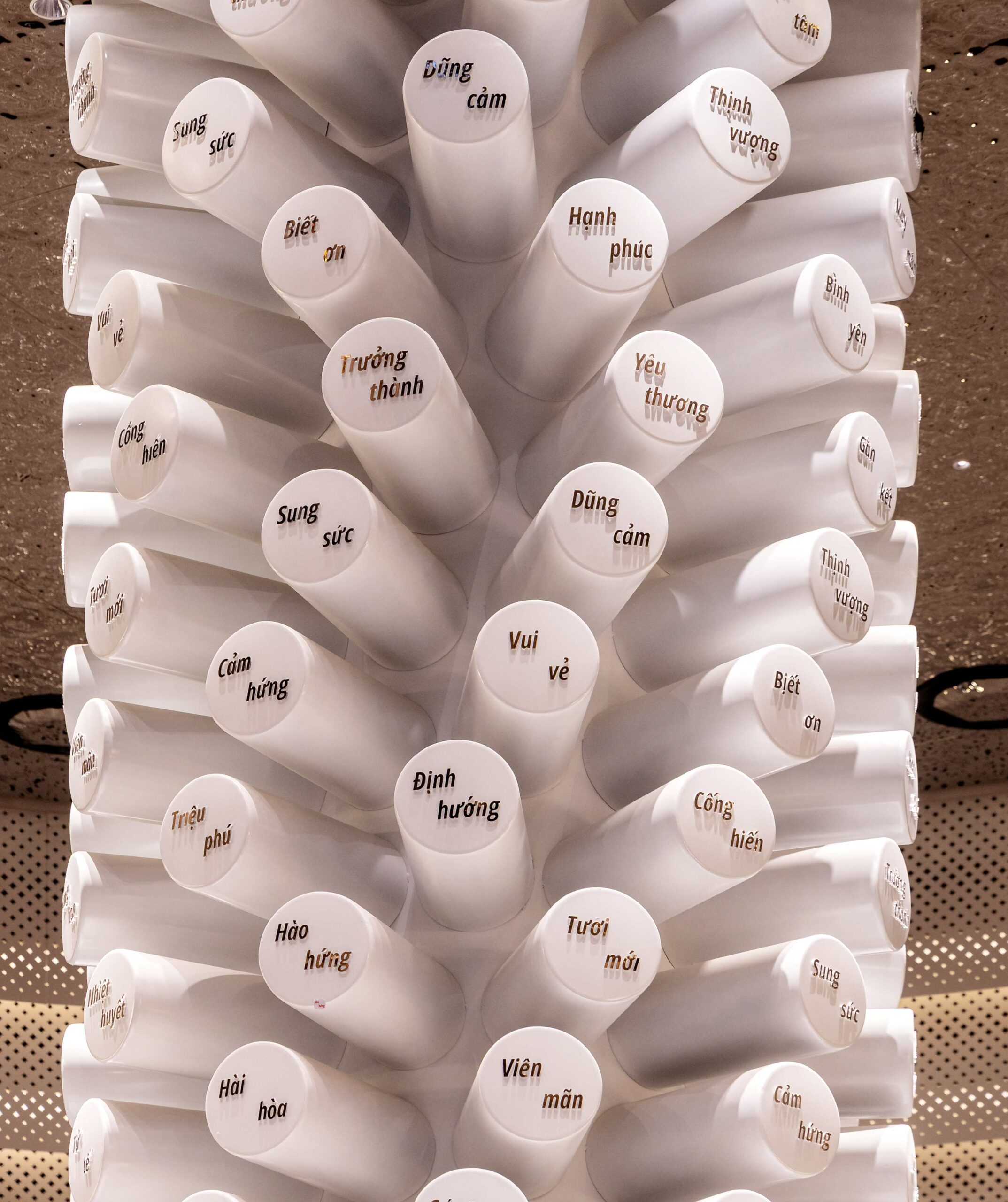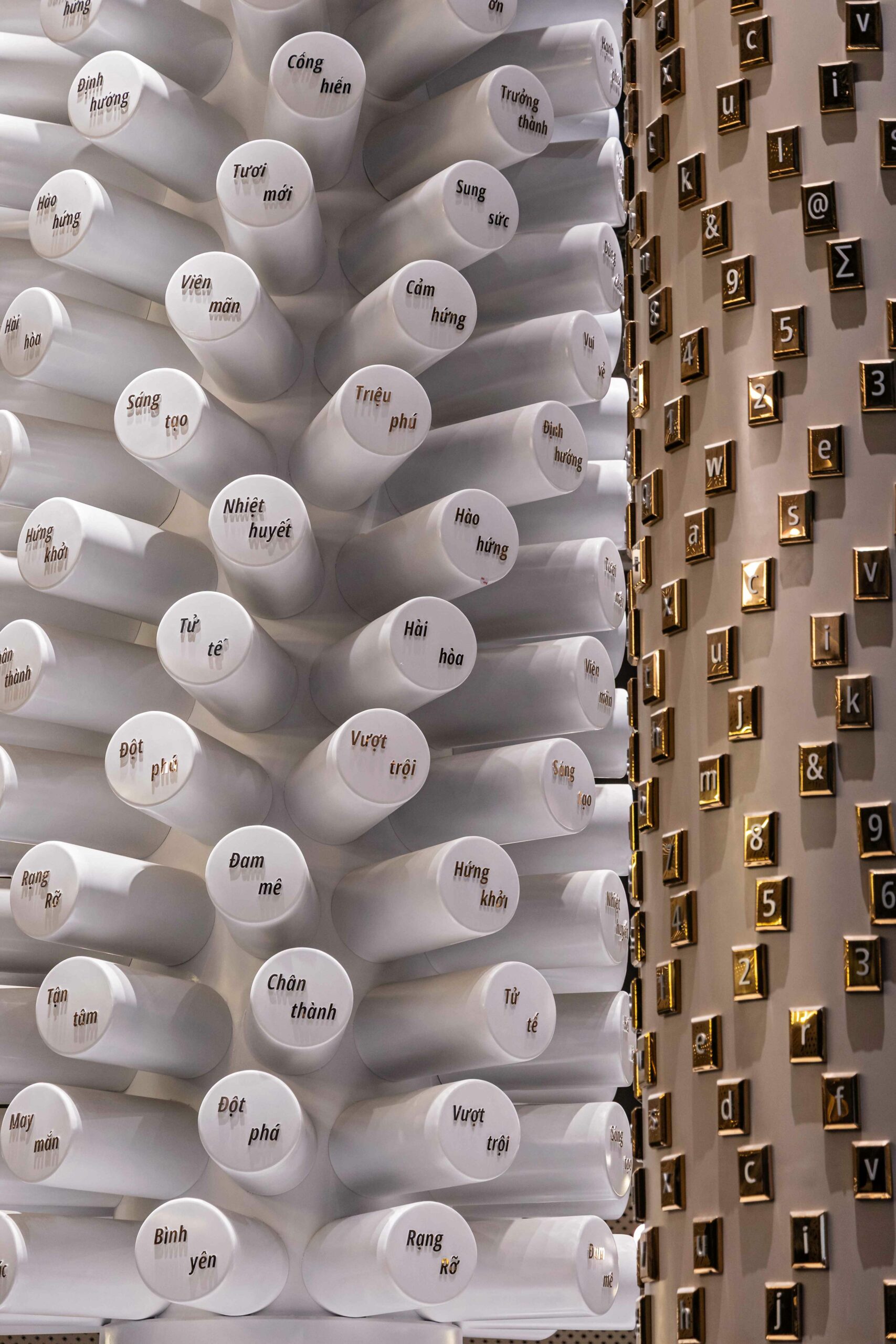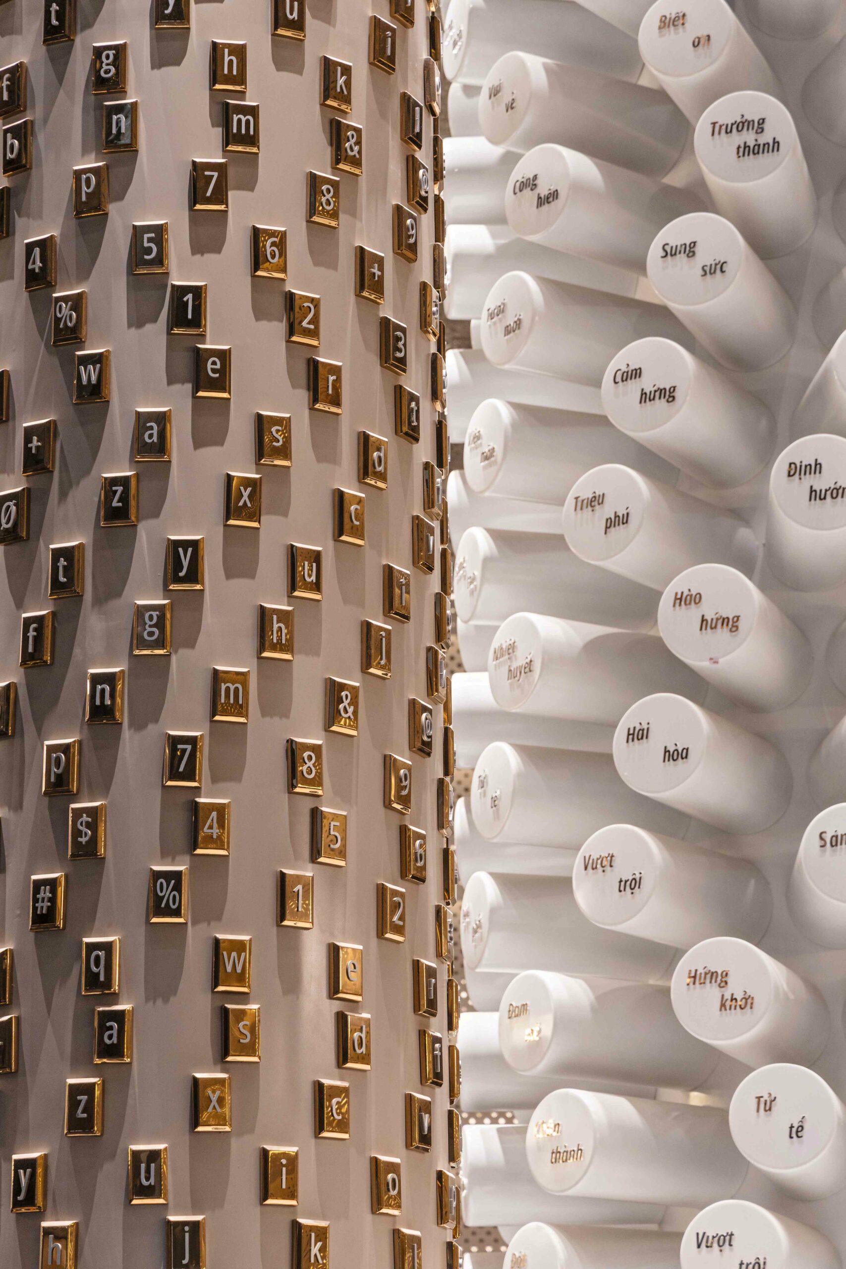 Hai hình ảnh trung tâm của ngành in được sử dụng làm cảm hứng xuyên suốt dự án. Đầu tiên là cuộn giấy in, biểu tượng của dòng chảy tri thức và thông tin. Hình ảnh này được diễn giải thông qua các dải thép uốn lượn liên tục trong khu vực sảnh và lối giao thông, tạo cảm giác chuyển động mềm mại, gợi liên tưởng đến những trang giấy đang được kéo ra theo thời gian. Thứ hai là bộ chữ in typo, yếu tố nền tảng của công nghệ in. Các ký tự không xuất hiện như chi tiết trang trí đơn lẻ mà được tích hợp vào cấu trúc và đồ nội thất: cột chính trong sảnh được chạm khắc hình ảnh chữ in, băng ghế chờ được tạo hình theo dáng chữ cái, các mảng tường trong phòng chiếu sử dụng module ô vuông gợi nhắc những bản in typo cổ điển.