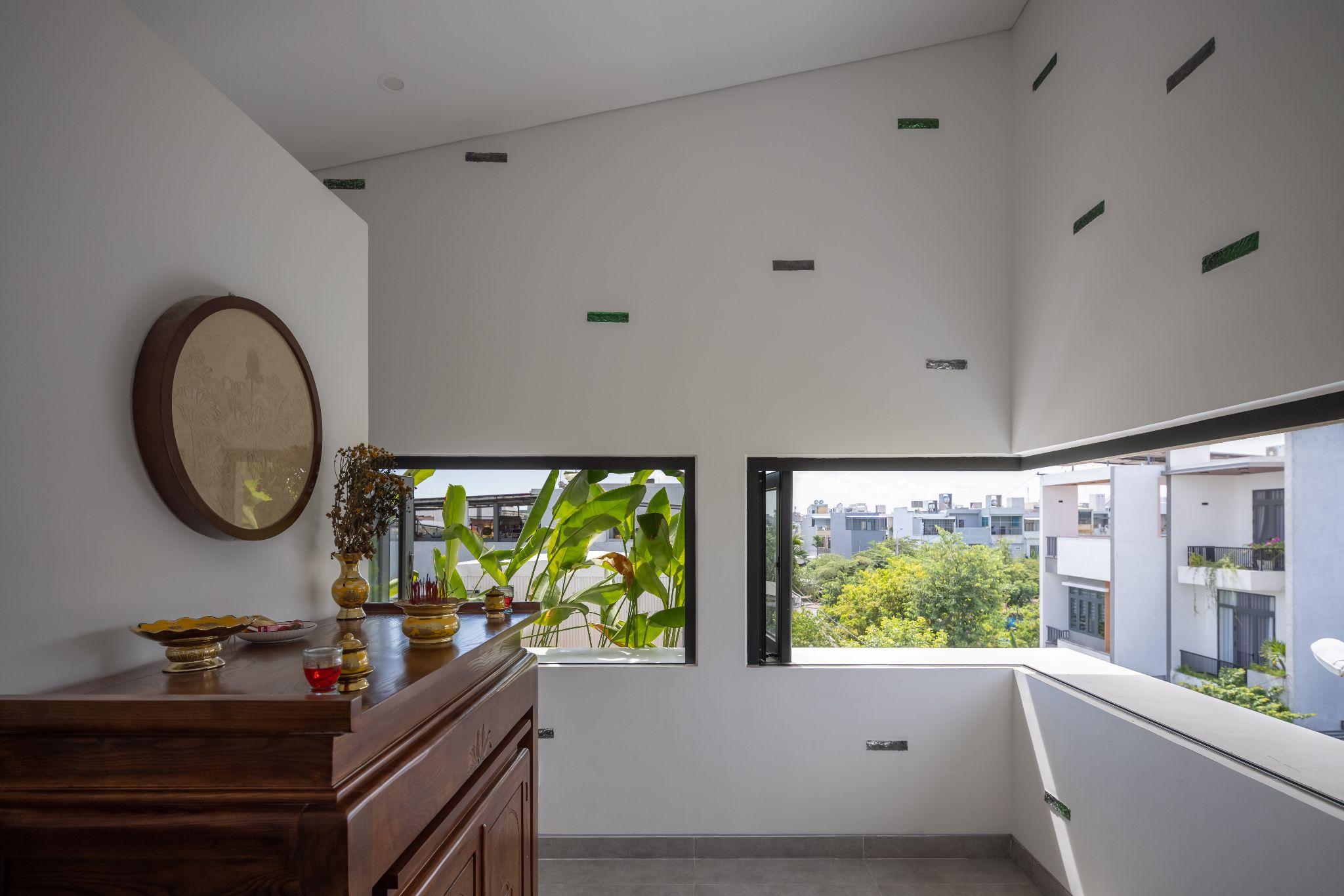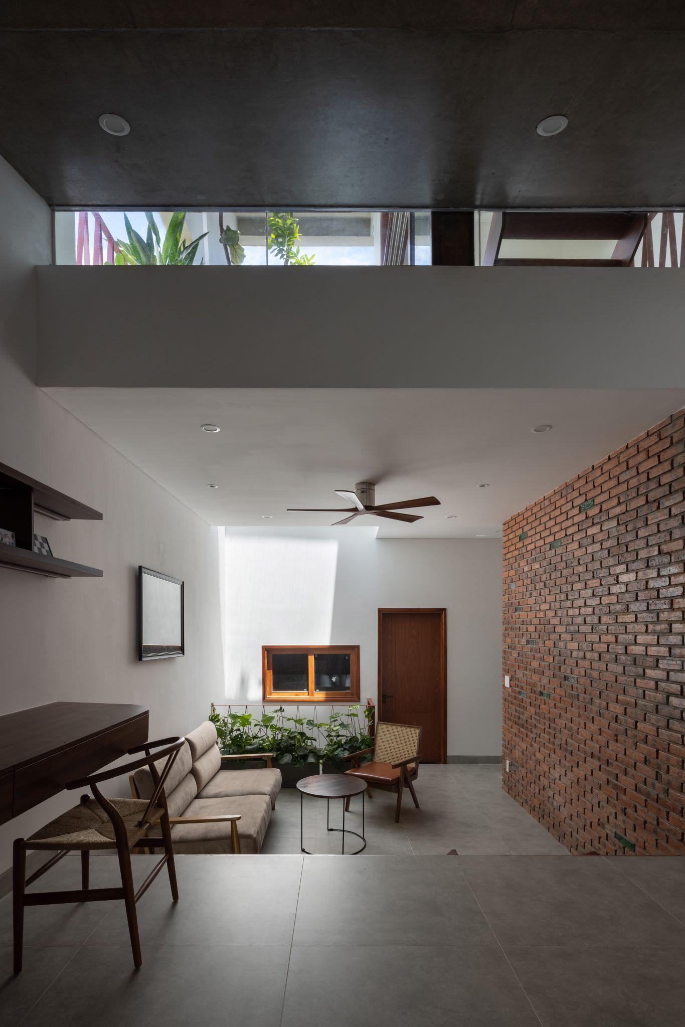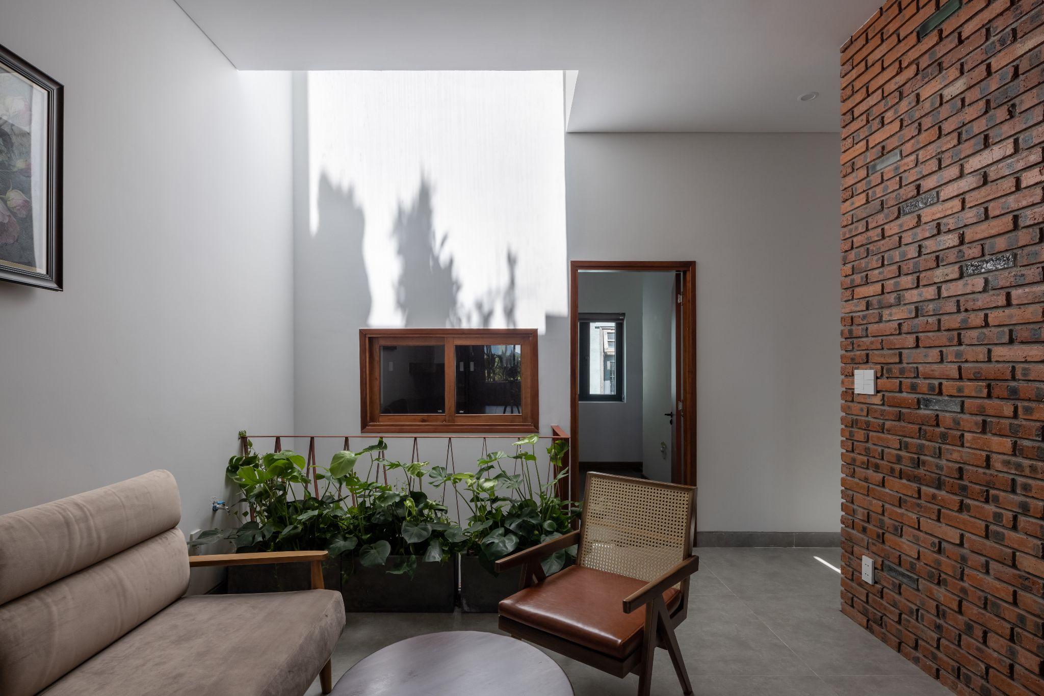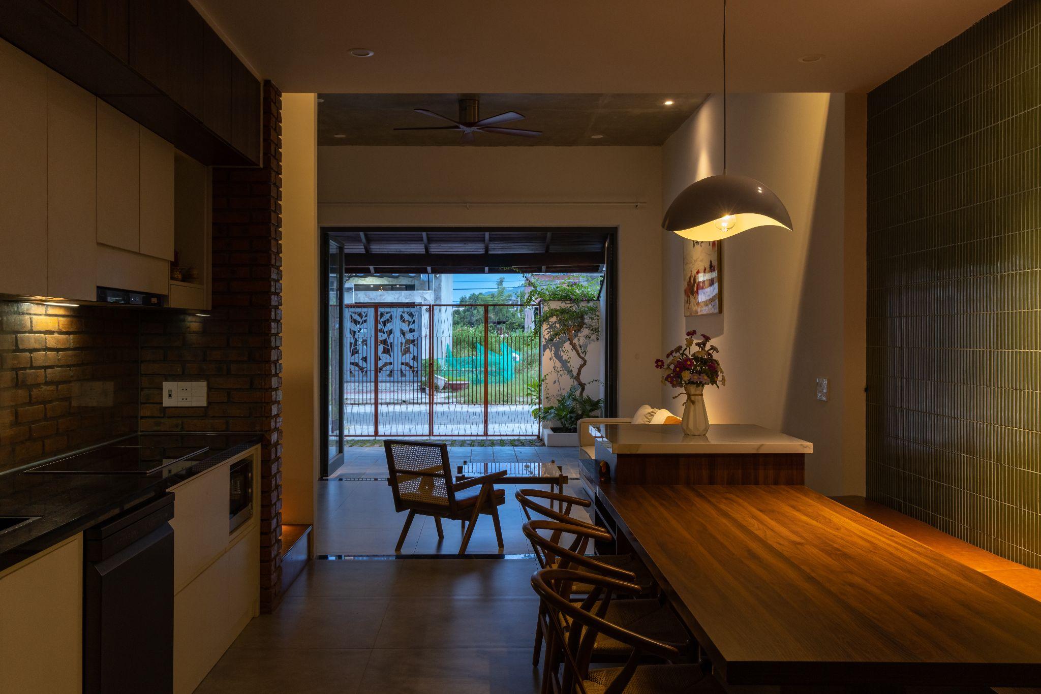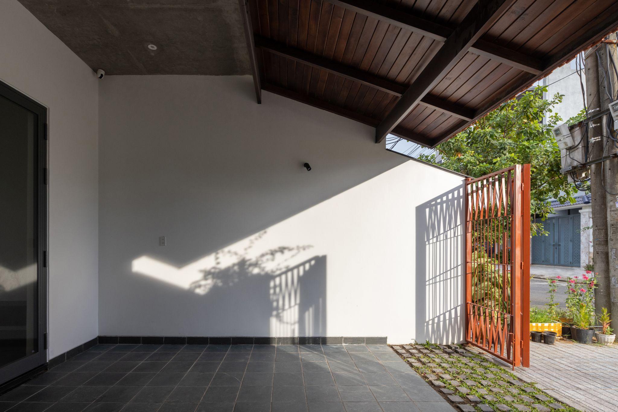 Trong bài toán khí hậu miền Trung, công trình ưu tiên các giải pháp thụ động. Giếng trời trung tâm tạo dòng gió đứng, đưa ánh sáng sâu vào lõi nhà. Hệ cửa mở lớn hướng sân vườn giúp thông gió chéo và đỡ bớt cảm giác ngột ngạt. Hệ mái cách nhiệt và tường hai lớp giúp công trình giảm bức xạ nhiệt. Cây xanh được trồng xen kẽ tạo các khoảng “nghỉ” cho không khí và con người. Công trình cũng tận dụng lại gỗ cũ để giảm tải carbon và mang lại cảm giác hoài niệm. Nhờ đó, ngôi nhà đạt được trạng thái cân bằng giữa riêng tư, thoáng sáng và ổn định nhiệt.