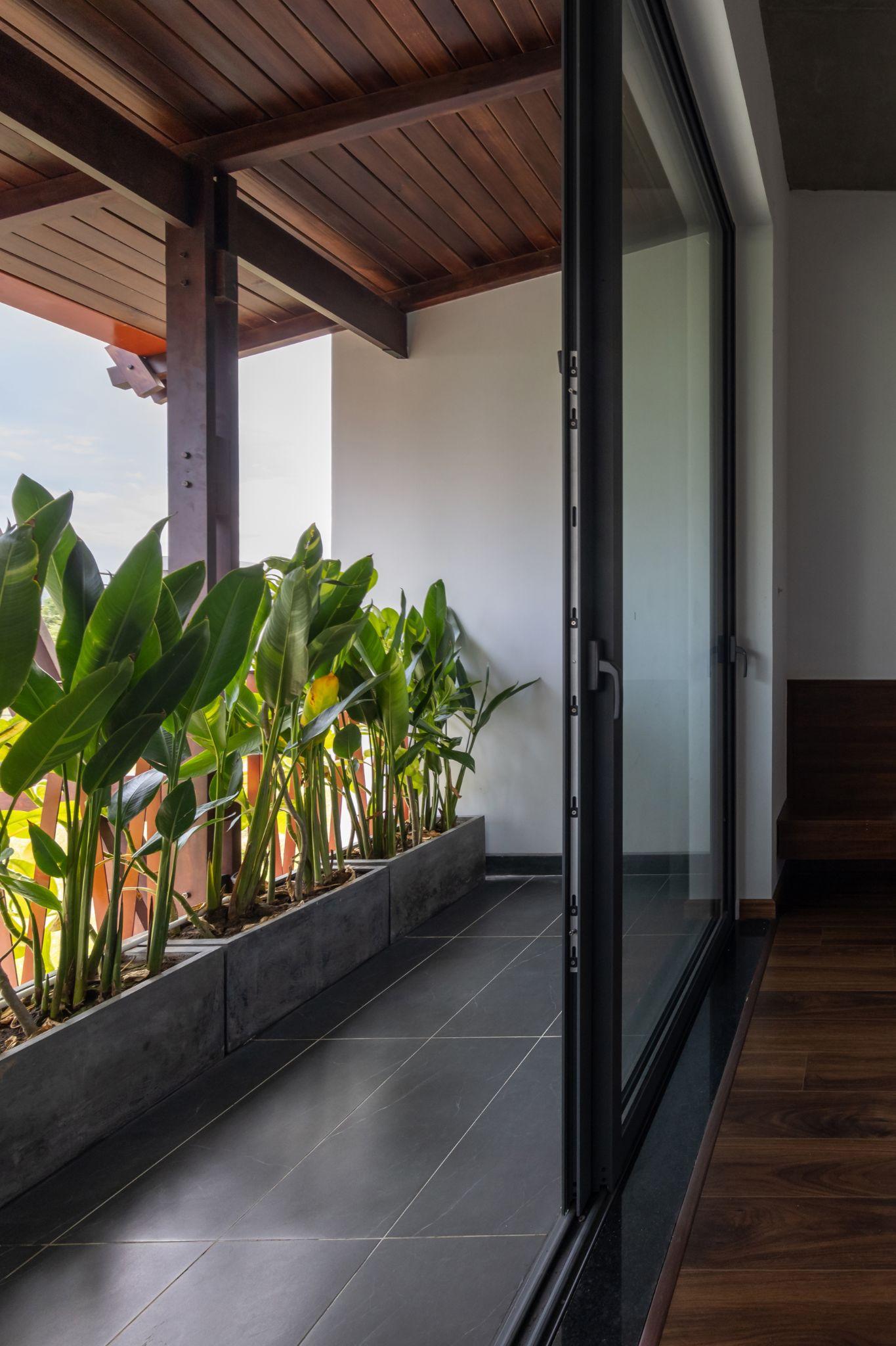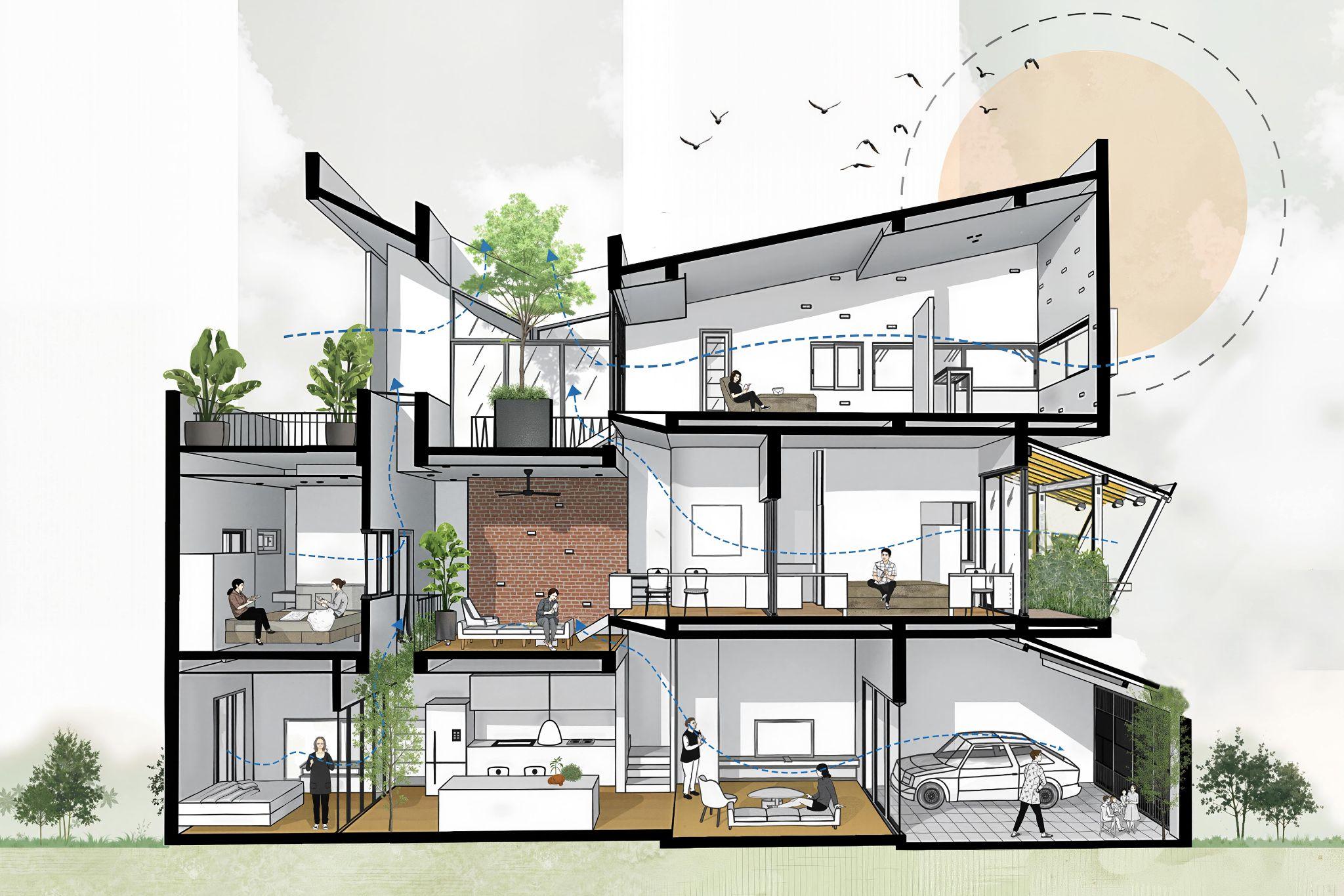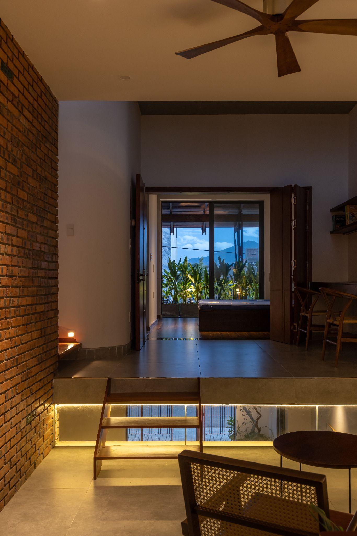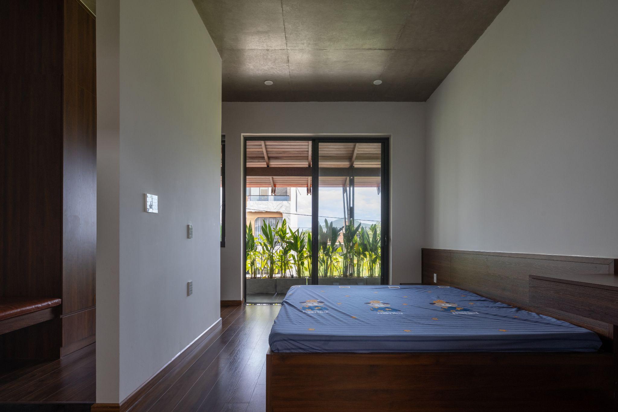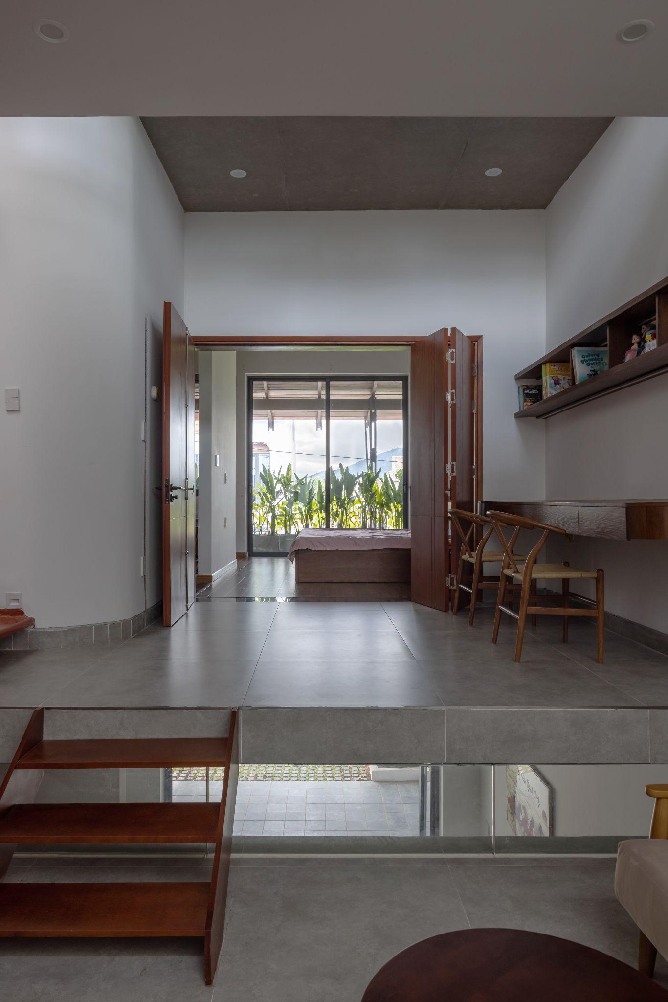 Trong bài toán khí hậu miền Trung, công trình ưu tiên các giải pháp thụ động. Giếng trời trung tâm tạo dòng gió đứng, đưa ánh sáng sâu vào lõi nhà. Hệ cửa mở lớn hướng sân vườn giúp thông gió chéo và đỡ bớt cảm giác ngột ngạt. Hệ mái cách nhiệt và tường hai lớp giúp công trình giảm bức xạ nhiệt. Cây xanh được trồng xen kẽ tạo các khoảng “nghỉ” cho không khí và con người. Công trình cũng tận dụng lại gỗ cũ để giảm tải carbon và mang lại cảm giác hoài niệm. Nhờ đó, ngôi nhà đạt được trạng thái cân bằng giữa riêng tư, thoáng sáng và ổn định nhiệt.